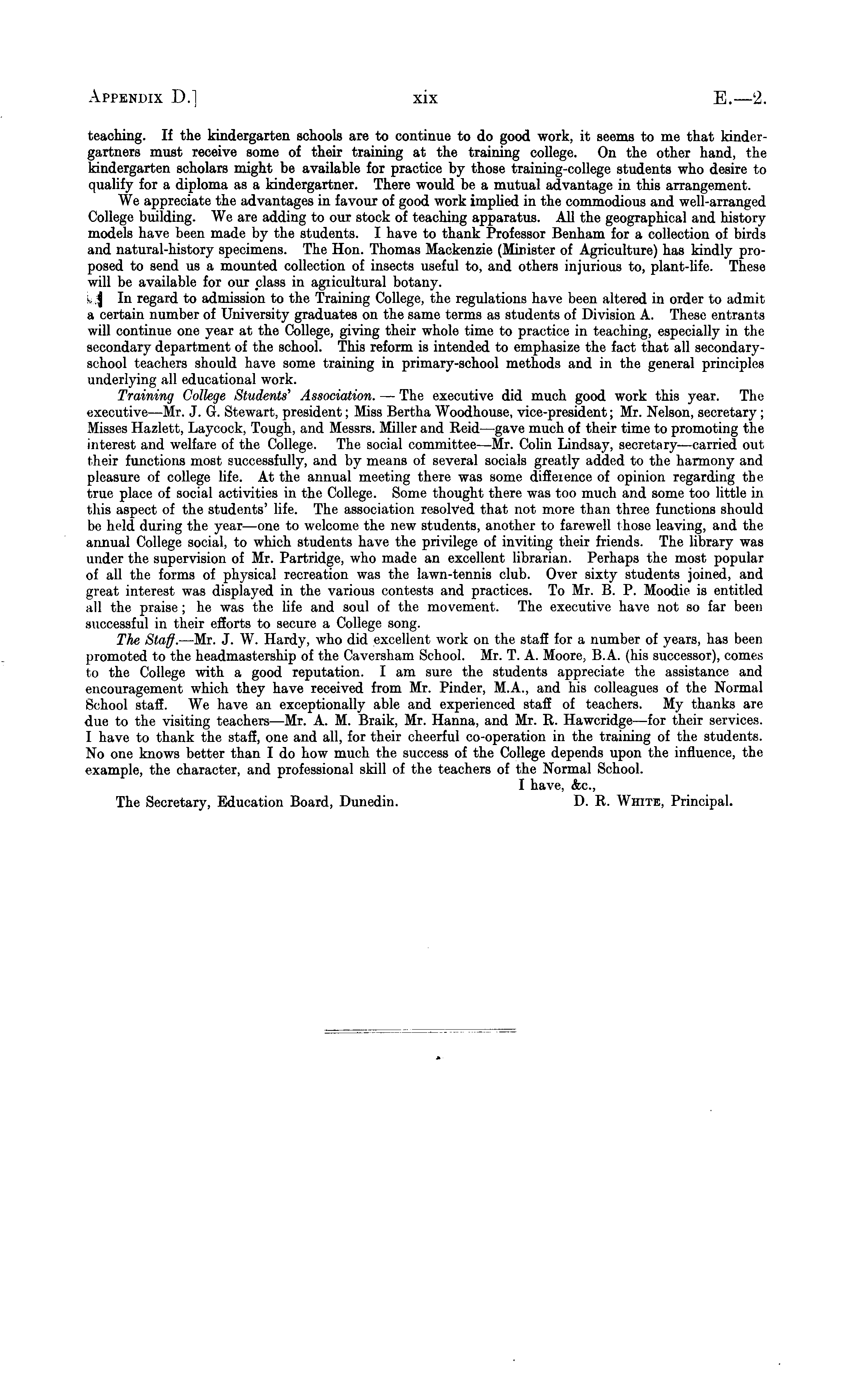 teaching. If the kindergarten schools are to continue to do good work, it seems to me that kmdergartners must receive some of their training at the training college. On the other hand, the kindergarten scholars might be available for practice by those training-college students who desire to qualify for a diploma as a kindergartner. There would be a mutual advantage in this arrangement. We appreciate the advantages in favour of good work implied in the commodious and well-arranged College building. We are adding to our stock of teaching apparatus. All the geographical and history models have been made by the students. I have to thank Professor Benham for a collection of birds and natural-history specimens. The Hon. Thomas Mackenzie (Minister of Agriculture) has kindly proposed to send us a mounted collection of insects useful to, and others injurious to, plant-life. These will be available for our class in agiicultural botany. I In regard to admission to the Training College, the regulations have been altered in order to admit a certain number of University graduates on the same terms as students of Division A. These entrants will continue one year at the College, giving their whole time to practice in teaching, especially in the secondary department of the school. This reform is intended to emphasize the fact that all secondaryschool teachers should have some training in primary-school methods and in the general principles underlying all educational work. Training College Students' Association. — The executive did much good work this year. The executive—Mr. J. G. Stewart, president; Miss Bertha Woodhouse, vice-president; Mr. Nelson, secretary ; Misses Hazlett, Laycock, Tough, and Messrs. Miller and Eeid —gave much of their time to promoting the interest and welfare of the College. The social committee—Mr. Colin Lindsay, secretary —carried out their functions most successfully, and by means of several socials greatly added to the harmony and pleasure of college life. At the annual meeting there was some difference of opinion regarding the true place of social activities in the College. Some thought there was too much and some too little in this aspect of the students' life. The association resolved that not more than three functions should be held during the year —one to welcome the new students, another to farewell those leaving, and the annual College social, to which students have the privilege of inviting their friends. The library was under the supervision of Mr. Partridge, who made an excellent librarian. Perhaps the most popular of all the forms of physical recreation was the lawn-tennis club. Over sixty students joined, and great interest was displayed in the various contests and practices. To Mr. B. P. Moodie is entitled all the praise ; he was the life and soul of the movement. The executive have not so far been successful in their efforts to secure a College song. The Staff. —Mr. J. W. Hardy, who did excellent work on the staff for a number of years, has been promoted to the headmastership of the Caversham School. Mr. T. A. Moore, B.A. (his successor), comes to the College with a good reputation. I am sure the students appreciate the assistance and encouragement which they have received from Mr. Pinder, M.A., and his colleagues of the Normal School staff. We have an exceptionally able and experienced staff of teachers. My thanks are due to the visiting teachers —Mr. A. M. Braik, Mr. Hanna, and Mr. R. Hawcridge —for their services. I have to thank the staff, one and all, for their cheerful co-operation in the training of the students. No one knows better than I do how much the success of the College depends upon the influence, the example, the character, and professional skill of the teachers of the Normal School. I have, &c, The Secretary, Education Board, Dunedin. D. E. White, Principal.