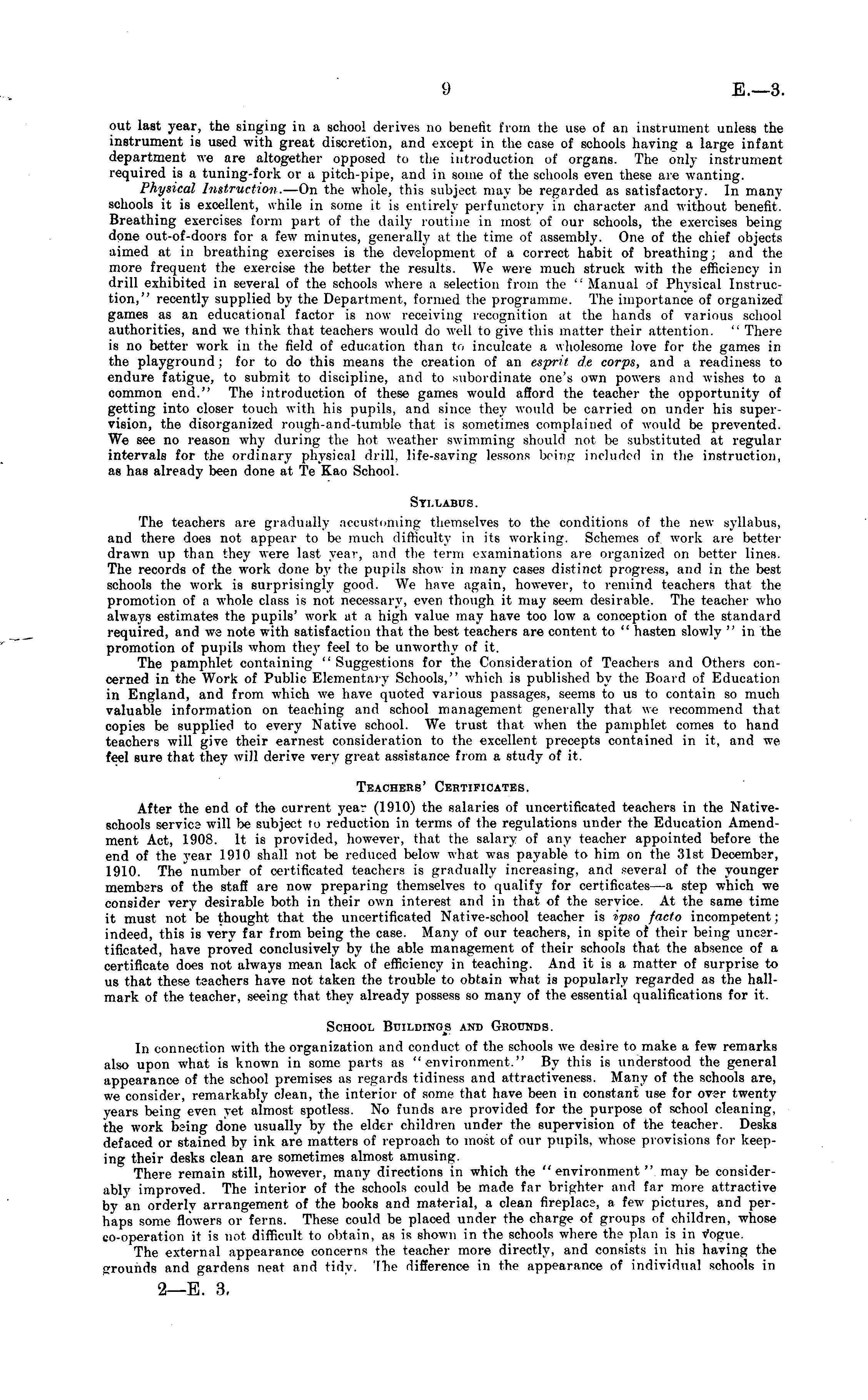 out last year, the singing in a school derives no benefit from the use of an instrument unless the instrument is used with great discretion, and except in the case of schools having a large infant department we are altogether opposed to the introduction of organs. The only instrument required is a tuning-fork or a pitch-pipe, and in some of the schools even these are wanting. Physical Instruction .—On the whole, this subject may be regarded as satisfactory. In many schools it is excellent, while in some it is entirely perfunctory in character and without benefit. Breathing exercises form part of the daily routine in most of our schools, the exercises beingdone out-of-doors for a few minutes, generally at the time of assembly. One of the chief objects aimed at in breathing exercises is the development of a correct habit of breathing; and the more frequent the exercise the better the results. We were much struck with the efficiency in drill exhibited in several of the schools where a selection from the "Manual of Physical Instruction," recently supplied by the Department, formed the programme. The importance of organized games as an educational factor is now receiving recognition at the hands of various school authorities, and we think that teachers would do well to give this matter their attention. " There is no better work in the field of education than to inculcate a wholesome love for the games in the playground; for to do this means the creation of an esprit d,e corps, and a readiness to endure fatigue, to submit to discipline, and to subordinate one's own powers and wishes to a common end." The introduction of these games would afford the teacher the opportunity of getting into closer touch with his pupils, and since they would be carried on under his supervision, the disorganized rough-and-tumble that is sometimes complained of would be prevented. We see no reason why during the hot weather swimming should not be substituted at regular intervals for the ordinary physical drill, life-saving lessons boino- included in the instruction, as has already been done at Te Kao School. Syllabus. The teachers are gradually accustoming themselves to the conditions of the new syllabus, and there does not appear to be much difficulty in its working. Schemes of work are better drawn up than they were last year, and the term examinations are organized on better lines. The records of the work done by the pupils show in many cases distinct progress, and in the best schools the work is surprisingly good. We have again, however, to remind teachers that the promotion of a whole class is not necessary, even though it may seem desirable. The teacher who always estimates the pupils' work at a high value may have too low a conception of the standard required, and we note with satisfaction that the best teachers are content to " hasten slowly " in the promotion of pupils whom they feel to be unworthy of it. The pamphlet containing " Suggestions for the Consideration of Teachers and Others concerned in the Work of Public Elementary Schools," which is published by the Board of Education in England, and from which we have quoted various passages, seems to us to contain so much valuable information on teaching and school management generally that we recommend that copies be supplied to every Native school. We trust that when the pamphlet comes to hand teachers will give their earnest consideration to the excellent precepts contained in it, and we feel sure that they will derive very great assistance from a study of it. Teachers' Certificates. After the end of the current year (1910) the salaries of uncertificated teachers in the Nativeschools service will be subject to reduction in terms of the regulations under the Education Amendment Act, 1908. It is provided, however, that the salary of any teacher appointed before the end of the year 1910 shall not be reduced below what was payable to him on the 31st December, 1910. The number of certificated teachers is gradually increasing, and several of the younger members of the staff are now preparing themselves to qualify for certificates—a step which we consider very desirable both in their own interest and in that of the service. At the same time it must not be thought that the uncertificated Native-school teacher is ipso facto incompetent; indeed, this is very far from being the case. Many of our teachers, in spite of their being uncertificated, have proved conclusively by the able management of their schools that the absence of a certificate does not always mean lack of efficiency in teaching. And it is a matter of surprise to us that these teachers have not taken the trouble to obtain what is popularly regarded as the hallmark of the teacher, seeing that they already possess so many of the essential qualifications for it. School and Grounds. In connection with the organization and conduct of the schools we desire to make a few remarks also upon what is known in some parts as "environment." By this is understood the general appearance of the school premises as regards tidiness and attractiveness. Many of the schools are, we consider, remarkably clean, the interior of some that have been in constant use for over twenty years being even yet almost spotless. No funds are provided for the purpose of school cleaning, the work being done usually by the elder children under the supervision of the teacher. Desks defaced or stained by ink are matters of reproach to most of our pupils, whose provisions for keeping their desks clean are sometimes almost amusing. There remain still, however, many directions in which the " environment " may be considerably improved. The interior of the schools could be made far brighter and far more attractive by an orderly arrangement of the books and material, a clean fireplace, a few pictures, and perhaps some flowers or ferns. These could be placed under the charge of groups of children, whose co-operation it is not difficult to obtain,