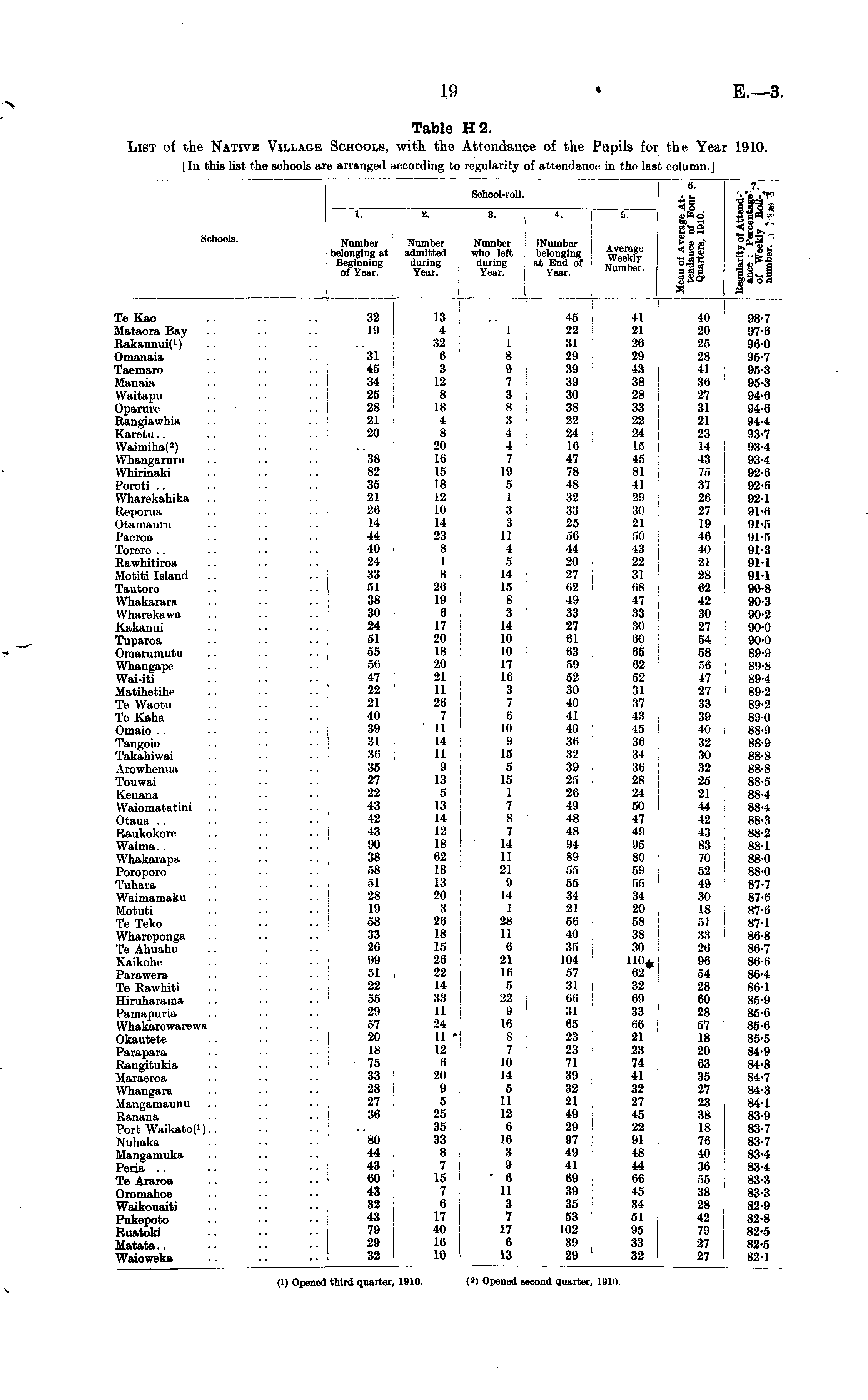 Table H2. List of the Native Village Schools, with the Attendance of the Pupils for the Year 1910.