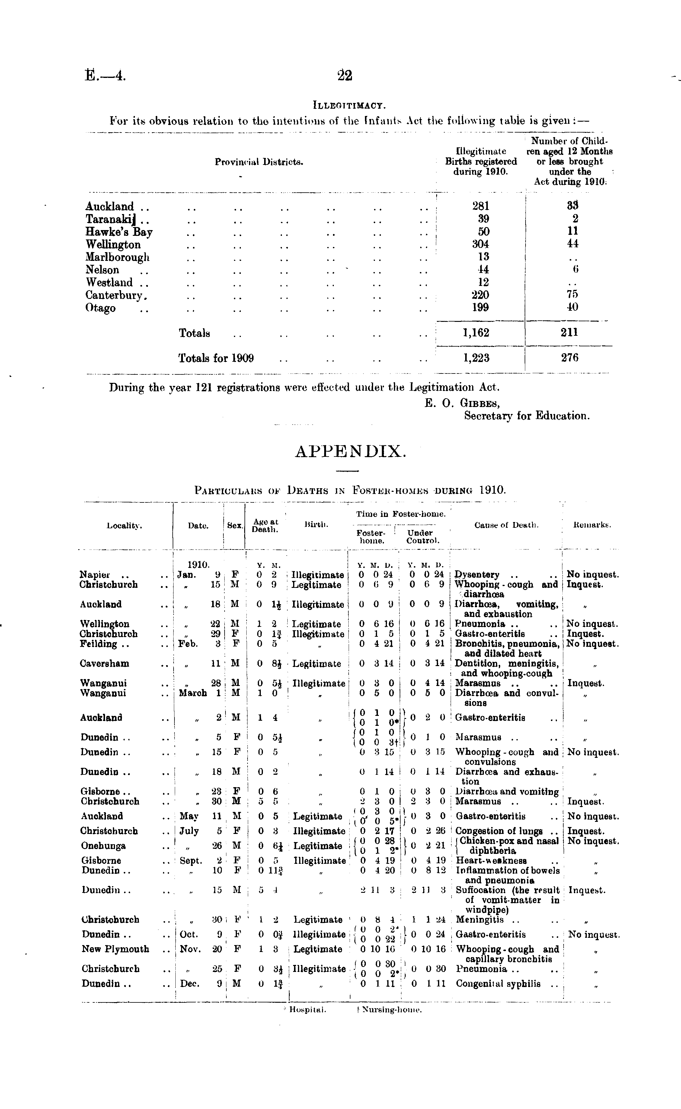 Provincial Districts. Number of ChildtUegitimate ren aged 12 Months Births registered or less brought during 1910. under the I Act during 1910. Auckland Taranakij Hawke's Bay Wellington Marlborougli Nelson Westland Canterbury. Otago 281 33 ..39 2 50 11 304 44 13 44 0 12 220 75 199 40 Totals 1,162 211 1,162 211 Totals for 1909 1,223 276