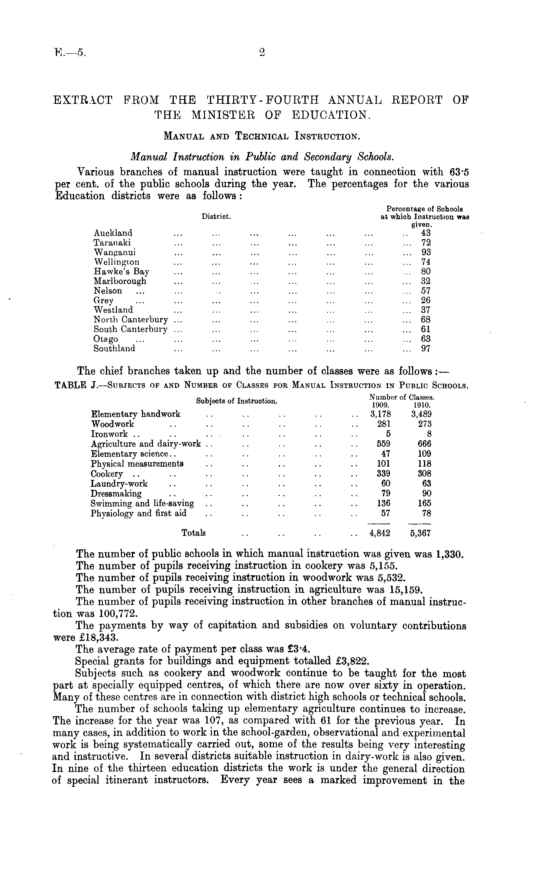 EXTRACT PROM THE THIRTY-FOURTH ANNUAL REPORT OF THE MINISTER OF EDUCATION. Manual and Technical Instruction. Manual Instruction in Public and Secondary Schools. Various branches of manual instruction were taught in connection with 63 "5 per cent, of the public schools during the year. The percentages for the various Education districts were as follows : Percentage of Schools District. at which Instruction was given. Auckland ... ... ... ... ... ... .. 43 Taranaki ... ... ... ... ... ... ... 72 Wanpanui ... ... ... ... ... ... ... 93 Wellington ... ... ... ... ... ... ... 74 Hawke's Bay ... ... ... ... ... ... ... 80 Marlborough* ... ... .. ... ... ... ... 32 Nelson ... ... . ... ... ... ... ... 57 Grey ... ... ... ... ... ... ... ... 26 Westland ... ... ... ... ... ... ... 37 North Canterbury ... ... ... ... ... ... ... 68 South Canterbury ... ... ... ... ... ... ... 61 Otago ... ... ... ... ... ... ... ... 63 Southland ... ... ... ... ... ... ... 97 The chief branches taken up and the number of classes were as follows:— TABLE J. —Subjects of and Number of Classes for Manual Instruction in Public Schools. Subjects of Instruction. N l^ ber of OX^ Elementary handwork .. .. .. .. .. 3,178 3,489 Woodwork .. .. .. .. .. 281 273 Ironwork .. .. ... .. .. .. .. 5 8 Agriculture and dairy-work . . .. .. .. .. 559 666 Elementary science.. . . .. .. .. . . 47 109 Physical measurements .. .. .. .. .. 101 118 Cookery .. .. .. .. .. .. ..339 308 Laundry-work .. . . .. .. .. .. 60 63 Dressmaking .. .. .. .. .. .. 79 90 Swimming and life-saving .. .. .. .. .. 136 165 Physiology and first aid .. .. .. .. 57 78 Totals .. .. .. .. 4,842 5,367 The number of public schools in which manual instruction was given was 1,330. The number of pupils receiving instruction in cookery was 5,155. The number of pupils receiving instruction in woodwork was 5,532. The number of pupils receiving instruction in agriculture was 15,159. The number of pupils receiving instruction in other branches of manual instruction was 100,772. The payments by way of capitation and subsidies on voluntary contributions were £18,343. The average rate of payment per class was £3*4. Special grants for buildings and equipment totalled £3,822. Subjects such as cookery and woodwork continue to be taught for the most part at specially equipped centres, of which there are now over sixty in operation. Many of these centres are in connection with district high schools or technical schools. The number of schools taking up elementary agriculture continues to increase. The increase for the year was 107, as compared with 61 for the previous year. In many cases, in addition to work in the school-garden, observational and experimental work is being systematically carried out, some of the results being very interesting and instructive. In several districts suitable instruction in dairy-work is also given. In nine of the thirteen education districts the work is under the general direction of special itinerant instructors. Every year sees a marked improvement in the