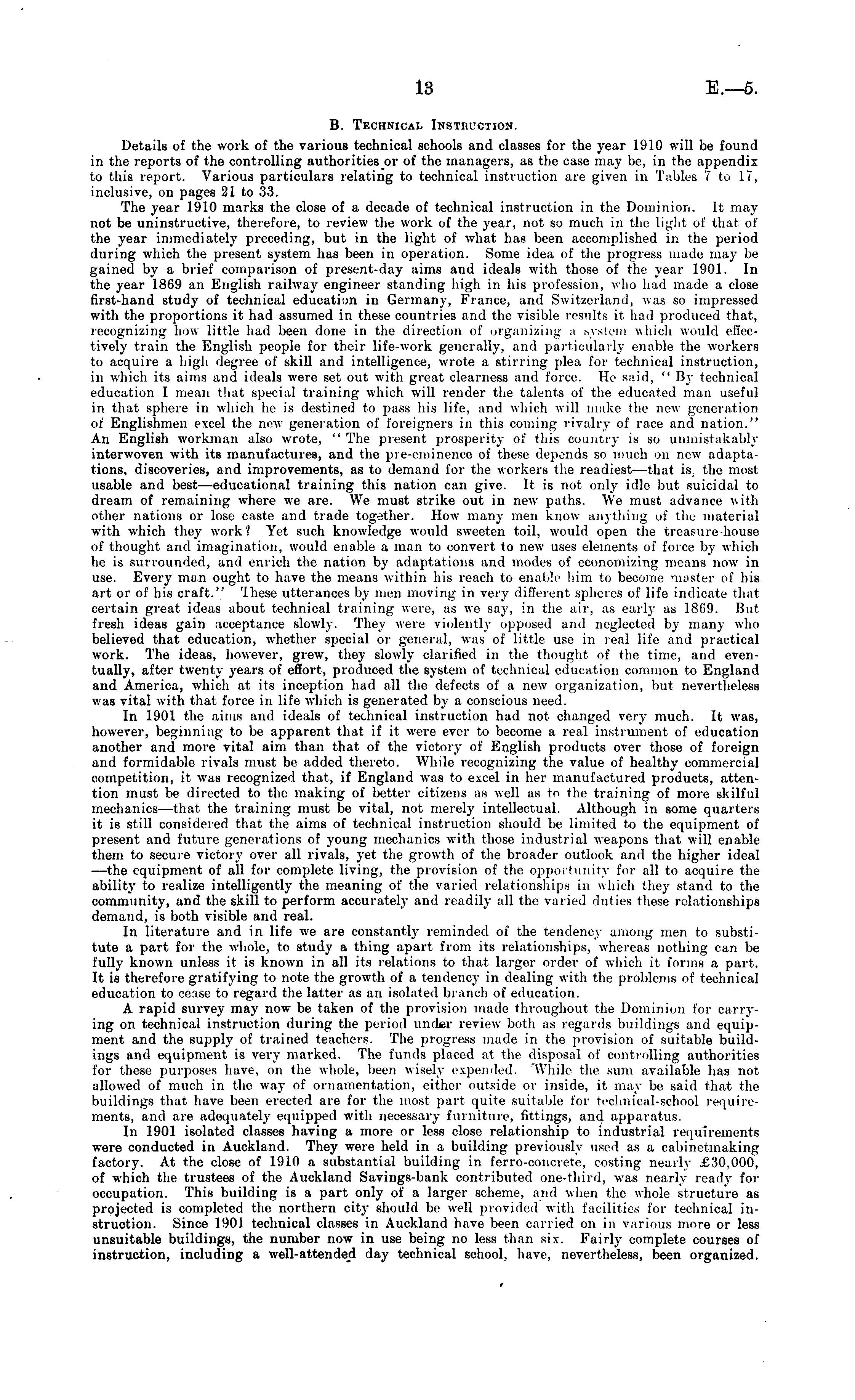 Details of the work of the various technical schools and classes for the year 1910 will be found in the reports of the controlling authorities or of the managers, as the case may be, in the appendix to this report. Various particulars relating to technical instruction are given in Tables 7 in 17, inclusive, on pages 21 to 33. The year 1910 marks the close of a decade of technical instruction in the Dominion. It may not be uninstructive, therefore, to review the work of the year, not so much in the light of that of the year immediately preceding, but in the light of what has been accomplished in the period during which the present system has been in operation. Some idea of the progress made may be gained by a brief comparison of present-day aims and ideals with those of the year 1901. In the year 1869 an English railway engineer standing high in his profession, who had made a close first-hand study of technical education in Germany, France, and Switzerland, was so impressed with the proportions it had assumed in these countries and the visible results it had produced that, recognizing how little had been done in the direction of organizing a eystem which would effectively train the English people for their life-work generally, and particularly enable the workers to acquire a high degree of skill and intelligence, wrote a stirring plea for technical instruction, in which its aims and ideals were set out with great clearness and force. He said, "By technical education I mean that special training which will render the talents of the educated man useful in that sphere in which he is destined to pass his life, and which will make the new generation of Englishmen excel the new generation of foreigners in this coming rivalry of race and nation." An English workman also wrote, " The present prosperity oi' this country is so unmistakably interwoven with its manufactures, and the pre-eminence of these depends so much on new adaptations, discoveries, and improvements, as to demand for the workers the readiest —that is. the most usable and best —educational training this nation can give. It is not only idle but suicidal to dream of remaining where we are. We must strike out in new paths. must advance with other nations or lose caste and trade together. How many men know anything of the material with which they work? Yet such knowledge would sweeten toil, would open the treasure-house of thought and imagination, would enable a man to convert to new uses elements of force by which he is surrounded, and enrich the nation by adaptations and modes of economizing means now in use. Every man ought to have the means within his reach to enable him to become master of his art or of his craft." 'Ihese utterances by men moving in very different spheres of life indicate ihat certain great ideas about technical training were, as we say, in the air, as early as 1869. But fresh ideas gain acceptance slowly. They were violently opposed and neglected by many who believed that education, whether special or general, was of little use in real life and practical work. The ideas, however, grew, they slowly clarified in the thought of the time, and eventually, after twenty years of effort, produced the system of technical education common to England and America, which at its inception had all the defects of a new organization, but nevertheless was vital with that force in life which is generated by a conscious need. In 1901 the aims and ideals of technical instruction had not changed very much. It was, however, beginning to be apparent that if it were ever to become a real instrument of education another and more vital aim than that of the victory of English products over those of foreign and formidable rivals must be added thereto. While recognizing the value of healthy commercial competition, it was recognized that, if England was to excel in her manufactured products, attention must be directed to the making of better citizens as well as to the training of more skilful mechanics—that the training must be vital, not merely intellectual. Although in some quarters it is still considered that the aims of technical instruction should be limited to the equipment of present and future generations of young mechanics with those industrial weapons that will enable them to secure victory over all rivals, yet the growth of the broader outlook and the higher ideal —the equipment of all for complete living, the provision of the opportunity for all to acquire the ability to realize intelligently the meaning of the varied relationships in which they stand to the community, and the skill to perform accurately and readily all the varied duties these relationships demand, is both visible and real. In literature and in life we are constantly reminded of the tendency among men to substitute a part for the whole, to study a thing apart from its relationships, whereas nothing can be fully known unless it is known in all its relations to that larger order of which it forms a part. It is therefore gratifying to note the growth of a tendency in dealing with the problems of technical education to cease to regard the latter as an isolated branch of education. A rapid survey may now be taken of the provision made throughout the Dominion for carrying on technical instruction dining the period under review both as regards buildings and equipment and the supply of trained teachers. The progress made in the provision of suitable buildings and equipment is very marked. The funds placed at the disposal of controlling authorities for these purposes have, on the whole, been wisely expended. While the sum available has not allowed of much in the way of ornamentation, either outside or inside, it may be said that the buildings that have been erected are for the most part quite euitable for technical-school requirements, and are adequately equipped with necessary furniture, fittings, and apparatus. In 1901 isolated classes having a more or less close 