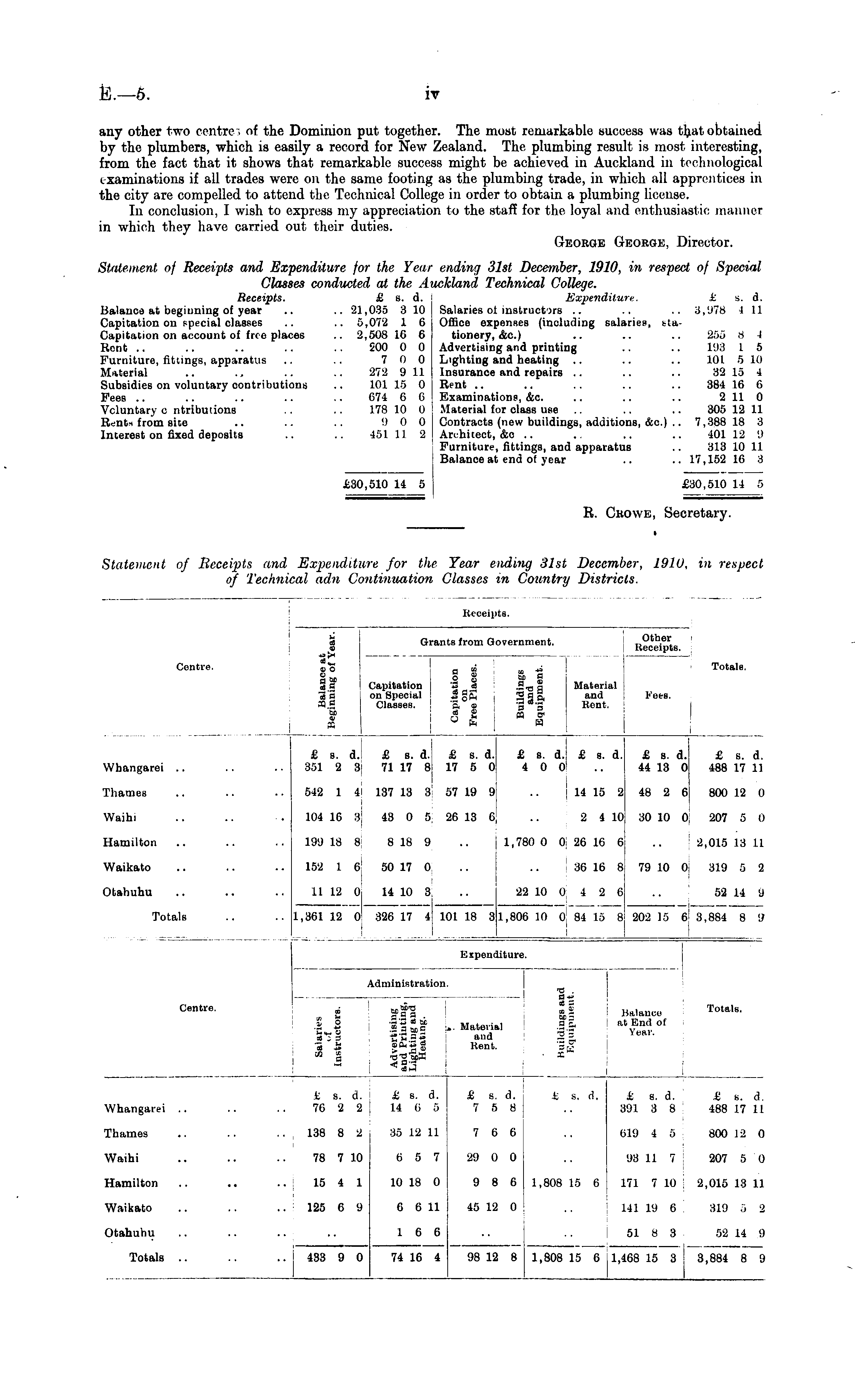 any other two centre:; of the Dominion put together. The most remarkable success was that obtained by the plumbers, which is easily a record for New Zealand. The plumbing result is most interesting, from the fact that it shows that remarkable success might be achieved in Auckland in technological examinations if all trades were on the same footing as the plumbing trade, in which all apprentices in the city are compelled to attend the Technical College in order to obtain a plumbing license. In conclusion, I wish to express my appreciation to the staff for the loyal and enthusiastic manner in which they have carried out their duties. George George, Director. SUtlement of Receipts and Expenditure for the Year ending 31st December, 1910, in respect of Special Classes conducted at the Auckland, Technical College. Receipts. £ s. d. Expenditure. Jt s. d. Balance at beginning of year .. .. 21,035 310 Salaries ot instructors .. .. .. 3,978 411 Capitation on special classes .. .. 5,072 1 6 Office expenses (including salaries, btaCapitation on account of free places .. 2,508 16 6 tionery, &c.) .. .. .. 255 8 4 Rent .. .. .. .. .. 500 0 0 Advertising and printing .. .. 193 1 5 Furniture, fittings, apparatus .. .. 7 o 0 Lighting and heating .. .. .. 101 510 Material .. ~ .. .. 272 911 Insurance and repairs .. .. .. :)2 15 4 Subsidies on voluntary contributions .. 101 15 0 Rent .. .. .. .. .. 384 16 6 Pees .. .. .. .. .. 674 6 6 Examinations, &c. .. .. .. 2 11 0 Voluntary c ntributions .. .. 178 10 0 Material for class use .. .. .. 305 12 11 from sice .. .. .. 0 0 0 Contracts (new buildings, additions, &c.) .. 7,388 18 3 Interest on fixed deposits .. .. 451 11 2 Architect, &c .. . .. .. 101 12 '.) j Furniture, fittings, and apparatus .. 313 10 11 Balance at end of year .. .. 17,152 16 3 £30,510 14 5 £30,510 14 5 R. Ckowe, Secretary.