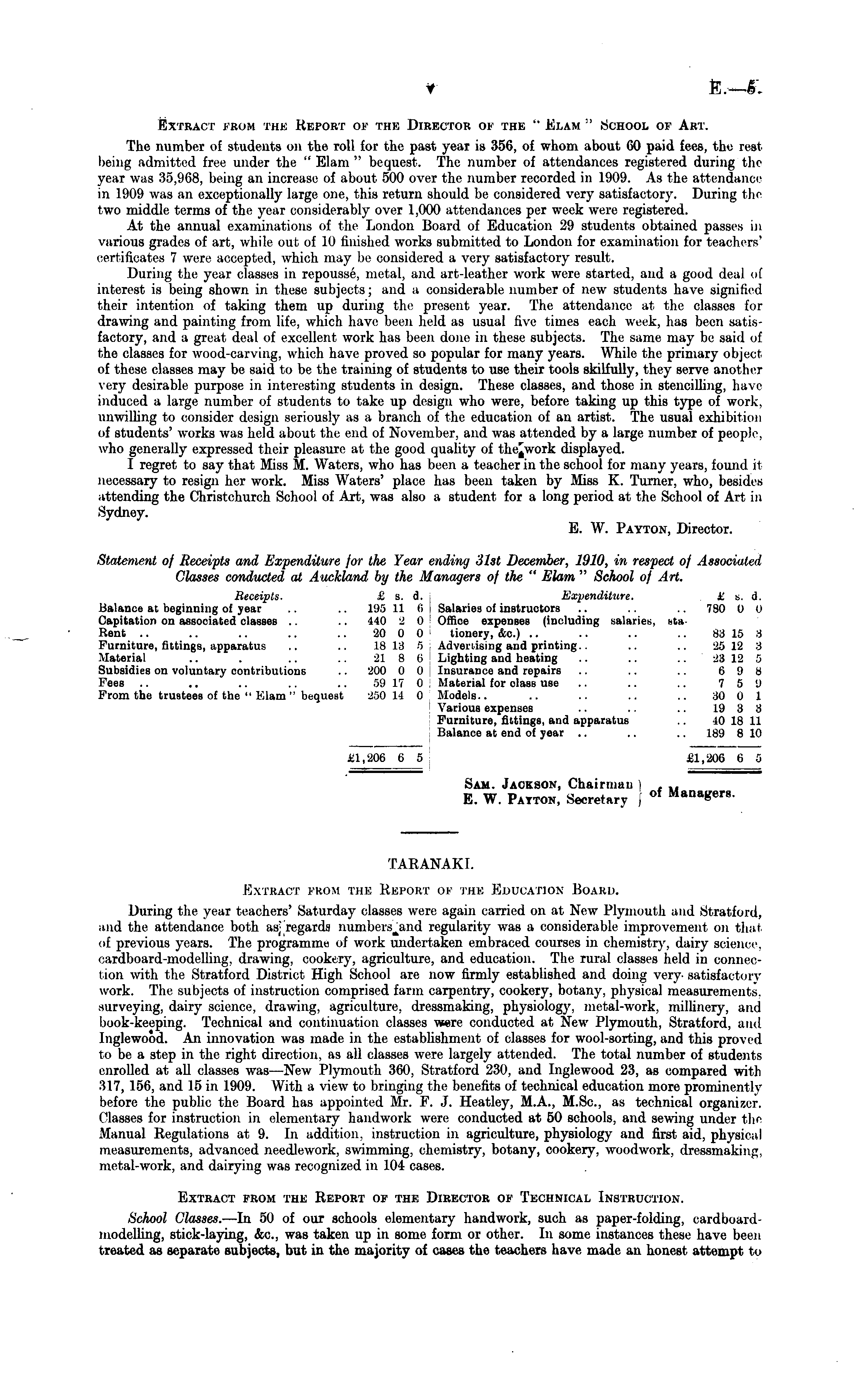 Extract from the Report of the Director of the " Elam " School of Art. The number of students on the roll for the past year is 356, of whom about 60 paid fees, the rest being admitted free under the " Elam " bequest. The number of attendances registered during the year was 35,968, being an increase of about 500 over the number recorded in 1909. As the attendance in 1909 was an exceptionally large one, this return should be considered very satisfactory. During the two middle terms of the year considerably over 1,000 attendances per week were registered. At the annual examinations of the London Board of Education 29 students obtained passes in various grades of art, while out of 10 finished works submitted to London for examination for teachers' certificates 7 were accepted, which may be considered a very satisfactory result. During the year classes in repousse, metal, and art-leather work were started, and a good deal of interest is being shown in these subjects; and a considerable number of new students have signified their intention of taking them up during the present year. The attendance at the classes for drawing and painting from life, which have been held as usual five times each week, has been satisfactory, and a great deal of excellent work has been done in these subjects. The same may be said of the classes for wood-carving, which have proved so popular for many years. While the primary object of these classes may be said to be the training of students to use their tools skilfully, they serve another very desirable purpose in interesting students in design. These classes, and those in stencilling, have induced a large number of students to take up design who were, before taking up this type of work, unwilling to consider design seriously as a branch of the education of an artist. The usual exhibition of students' works was held about the end of November, and was attended by a large number of peoplo, who generally expressed their pleasure at the good quality of displayed. I regret to say that Miss M. Waters, who has been a teacher in the school for many years, found it necessary to resign her work. Miss Waters' place has been taken by Miss K. Turner, who, besides attending the Christchurch School of Art, was also a student for a long period at the School of Art in Sydney. E. W. Payton, Director. Statement of Receipts and Expenditure for the Year ending Hist December, 1910, in respect of Associated Classes conducted at Auckland by the Managers of the " Elam " School of Art. Receipts. £ s. d. Expenditure. £ s. d. Balance at beginning of year .. .. 195 11 f> Salaries of instructors .. .. .. 780 0 0 Capitation on associated classes .. .. 440 2 0 Office expenses (including salaries, t.t»Rent .. .. .. .. .. 20 0 0 tionery, &c.) .. .. .. .. 83 15 a Furniture, fittings, apparatus .. .. 18 13 5 Advertising and printing.. .. .. 25 12 3 Material .. . .. .. 21 8 6 Lighting and heating .. .. .. al2 5 Subsidies on voluntary contributions .. 200 0 0 Insurance and repairs .. .. .. 6 9 8 Fees .. .. .. .. .. 59 17 0 Material for olass use .. .. .. 7 5 1) From the trustees of the " Elam" bequest 250 14 0 Models.. .. .. .. .. 30 0 1 Various expenses .. .. .. 19 3 3 Furniture, Sitings, and apparatus .. 40 18 11 Balance at end of year .. .. .. 189 8 10 £1,206 6 5 £1,206 6 5 Sam. Jackson, Chairman I , ~ E. W. Payton, Secretary | of Mana K e «-