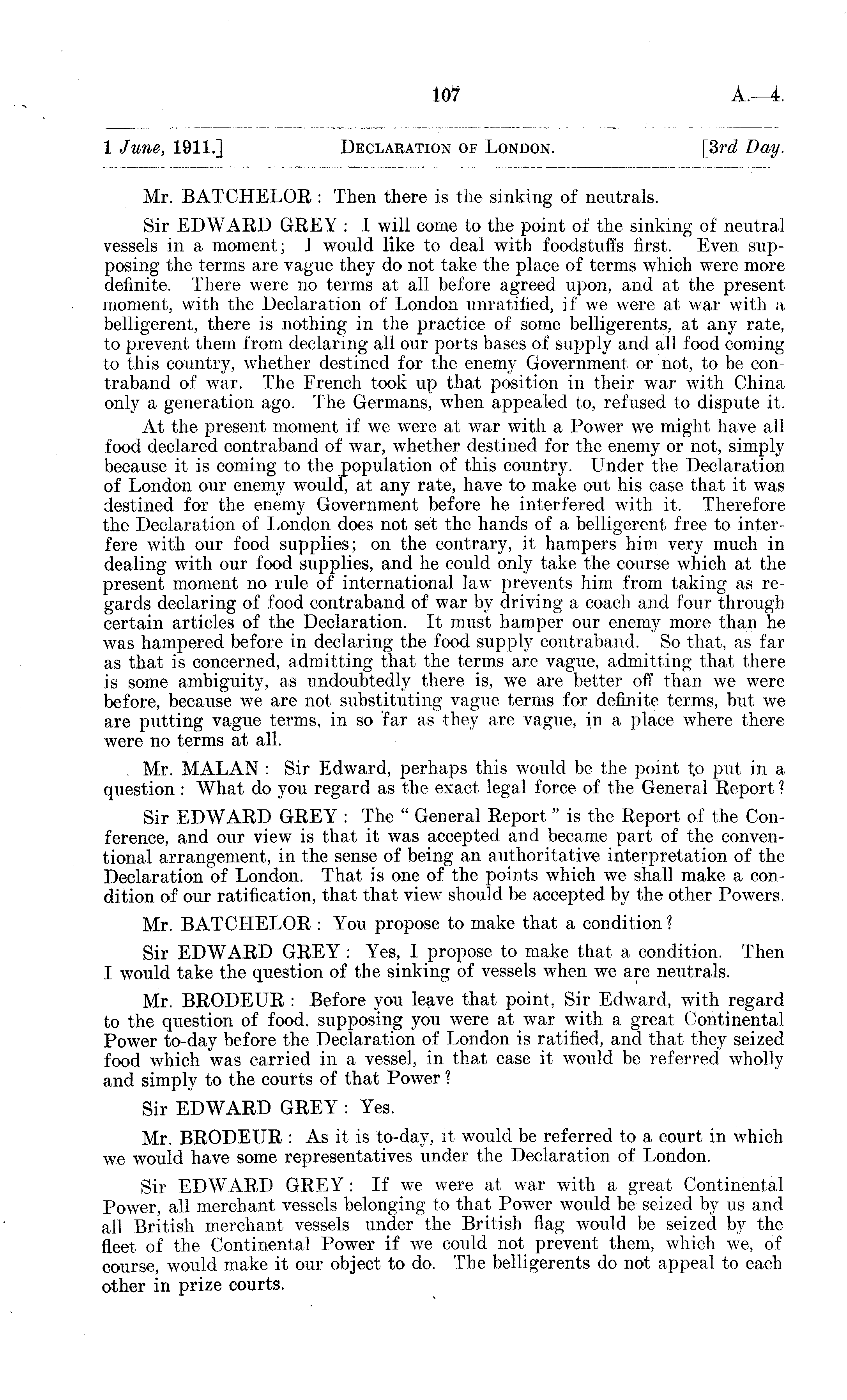 1 June, 1911.] Declaration of London. [3rd Day. Mr. BATCHELOR : Then there is the sinking of neutrals. Sir EDWARD GREY : I will come to the point of the sinking of neutral vessels in a moment; I would like to deal with foodstuffs first. Even supposing the terms are vague they do not take the place of terms which were more definite. There were no terms at all before agreed upon, and at the present moment, with the Declaration of London unratified, if we were at war with a belligerent, there is nothing in the practice of some belligerents, at any rate, to prevent them from declaring all our ports bases of supply and all food coming to this country, whether destined for the enemy Government or not, to be contraband of war. The French took up that position in their war with China only a generation ago. The Germans, when appealed to, refused to dispute it. At the present moment if we were at war with a Power we might have all food declared contraband of war, whether destined for the enemy or not, simply because it is coming to the population of this country. Under the Declaration of London our enemy would, at any rate, have to make out his case that it was destined for the enemy Government before he interfered with it. Therefore the Declaration of London does not set the hands of a belligerent free to interfere with our food supplies; on the contrary, it hampers him very much in dealing with our food supplies, and he could only take the course which at the present moment no rule of international law prevents him from taking as regards declaring of food contraband of war by driving a coach and four through certain articles of the Declaration. It must hamper our enemy more than he was hampered before in declaring the food supply contraband. So that, as far as that is concerned, admitting that the terms are vague, admitting that there is some ambiguity, as undoubtedly there is, we are better off than we were before, because we are not substituting vague terms for definite terms, but we are putting vague terms, in so far as they are vague, in a place where there were no terms at all. . Mr. MALAN : Sir Edward, perhaps this would be the point to put in a question : What do you regard as the exact legal force of the General Report ? Sir EDWARD GREY : The " General Report" is the Report of the Conference, and our view is that it was accepted and became part of the conventional arrangement, in the sense of being an authoritative interpretation of the Declaration of London. That is one of the points which we shall make a condition of our ratification, that that view should be accepted by the other Powers. Mr. BATCHELOR : You propose to make that a condition? Sir EDWARD GREY : Yes, I propose to make that a condition. Then I would take the question of the sinking of vessels when we are neutrals. Mr. BRODEUR : Before you leave that point, Sir Edward, with regard to the question of food, supposing you were at war with a great Continental Power to-day before the Declaration of London is ratified, and that they seized food which was carried in a vessel, in that case it would be referred wholly and simply to the courts of that Power ? Sir EDWARD GREY : Yes. Mr. BRODEUR : As it is to-day, it would be referred to a court in which we would have some representatives under the Declaration of London. Sir EDWARD GREY : If we were at war with a great Continental Power, all merchant vessels belonging to that Power would be seized by us and all British merchant vessels under the British flag would be seized by the fleet of the Continental Power if we could not prevent them, which we, of course, would make it our object to do. The belligerents do not appeal to each other in prize courts.