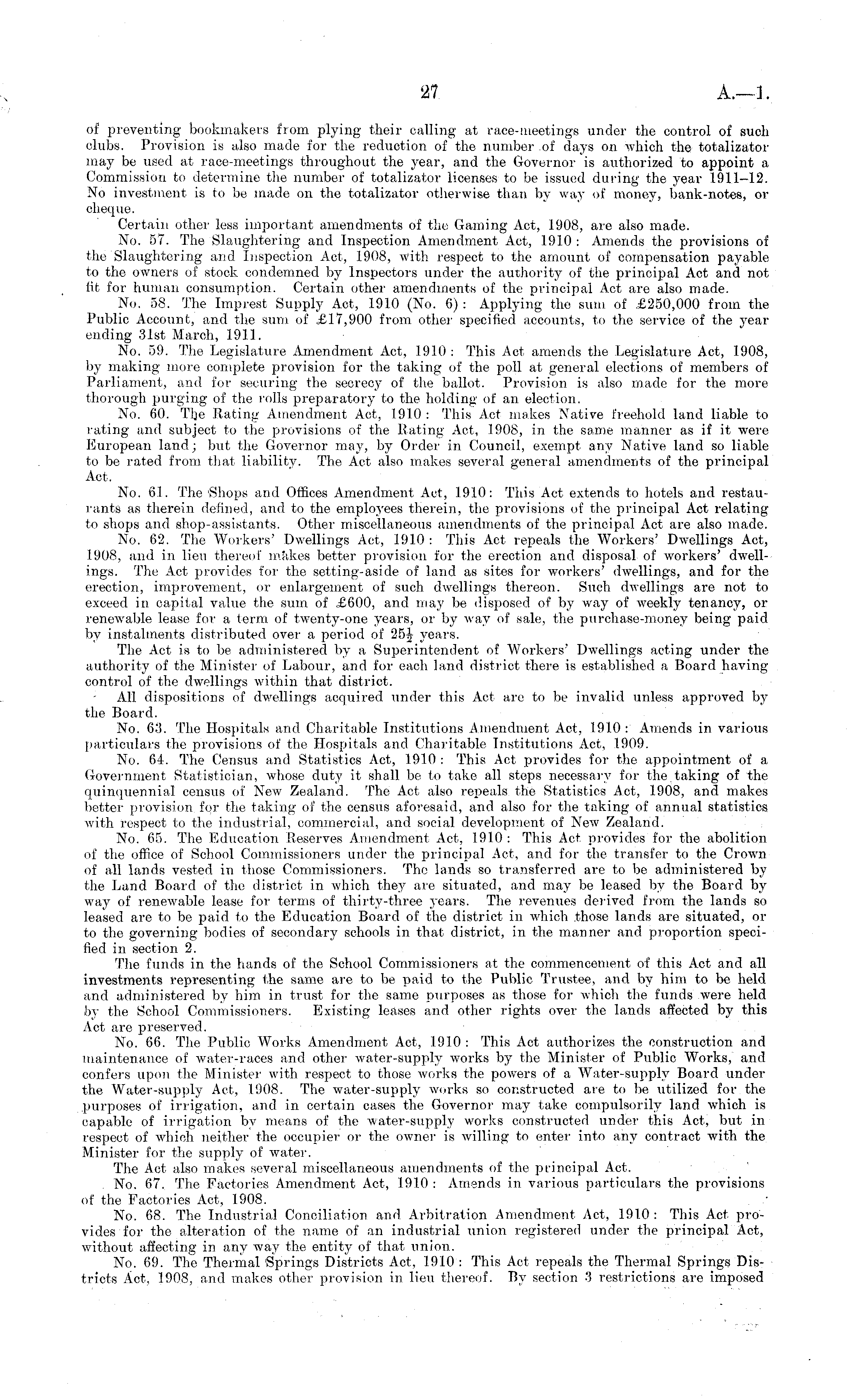 of preventing bookmakers from plying their calling at race-meetings under the control of such clubs. Provision is also made for the reduction of the number of days on which the totalizator may be used at race-meetings throughout the year, and the Governor is authorized to appoint a Commission to determine the number of totalizator licenses to be issued during the year 1911-12. No investment is to be made on the totalizator otherwise than by way of money, bank-notes, or cheque. Certain other less important amendments of the Gaining Act, 1908, are also made. No. 57. The Slaughtering and Inspection Amendment Act, 1910 : Amends the provisions of the Slaughtering and Inspection Act, 1908, with respect to the amount of compensation payable to the owners of stock condemned by Inspectors under the authority of the principal Act and not fit for human consumption. Certain other amendments of the principal Act are also made. No. 58. The Imprest Supply Act, 1910 (No. 6) : Applying the sum of £250,000 from the Public Account, and the sum of £17,900 from other specified accounts, to the service of the year ending 31st March, 1911. No. 59. The Legislature Amendment Act, 1910 : This Act amends the Legislature Act, 1908, by making more complete provision for the taking of the poll at general elections of members of Parliament, and for securing the secrecy of the ballot. Provision is also made for the more thorough purging of the rolls preparatory to the holding of an election. No. 60. Tije Rating Amendment Act, 1910 : This Act makes Native freehold land liable to rating and subject to the provisions of the Hating Act, 1908, in the same manner as if it were European land; but the Governor may, by Order in Council, exempt any Native land so liable to be rated from that liability. The Act also makes several general amendments of the principal Act, No. 61. The 'Shops and Offices Amendment Act, 1910: This Act extends to hotels and restaurants as therein defined, and to the employees therein, the provisions of the principal Act relating to shops and shop-assistants. Other miscellaneous amendments of the principal Act are also made. No. 62. The Workers' Dwellings Act, 1910 : This Act repeals the Workers' Dwellings Act, 1908, and in lieu thereof makes better provision for the erection and disposal of workers' dwellings. The Act provides for the setting-aside of land as sites for workers' dwellings, and for the erection, improvement, or enlargement of such dwellings thereon. Such dwellings are not to exceed in capital value the sum of £600, and may be disposed of by way of weekly tenancy, or renewable lease for a term of twenty-one years, or by way of sale, the purchase-money being paid by instalments distributed over a period of 25J years. The Act is to be administered by a SuTJerintendent of Workers' Dwellings acting under the authority of the Minister of Labour, and for each land district there is established a Board having control of the dwellings within that district. All dispositions of dwellings acquired under this Act are to be invalid unless approved by the Board. No. 63. The Hospitals and Charitable Institutions Amendment Act, 1910 : Amends in various particulars the provisions of the Hospitals and Charitable Institutions Act, 1909. No. 64. The Census and Statistics Act, 1910 : This Act provides for the appointment of a Government Statistician, whose duty it shall be to take all steps necessary for the taking of the quinquennial census of New Zealand. The Act also repeals the Statistics Act, 1908, and makes better provision for the taking of the census aforesaid, and also for the taking of annual statistics with respect to the industrial, commercial, and social development of New Zealand. No. 65. The Education Reserves Amendment Act, 1910 : This Act provides for the abolition of the office of School Commissioners under the principal Act, and for the transfer to the Crown of all lands vested in those Commissioners. The lands so transferred are to be administered by the Land Board of the district in which they are situated, and may be leased by the Board by way of renewable lease for terms of thirty-three years. The revenues derived from the lands so leased are to be paid to the Education Board of the district in which those lands are situated, or to the governing bodies of secondary schools in that district, in the manner and proportion specified in section 2. The funds in the hands of the School Commissioners at the commencement of this Act and all investments representing the same are to be paid to the Public Trustee, and by him to be held and administered by him in trust for the same purposes as those for which the funds were held by the School Commissioners. Existing leases and other rights over the lands affected by this Act are preserved. No. 66. The Public Works Amendment Act, 1910 : This Act attthorizes the construction and maintenance of water-races and other water-supply works by the Minister of Public Works, and confers upon the Minister with respect to those works the powers of a Water-supply Board under the Water-supply Act, 1908. The water-supply works so constructed are to be utilized for the purposes of irrigation, and in certain cases the Governor ma} , take compulsorily land which is capable of irrigation by means of the water-supply works constructed under this Act, but in respect of which neither the occupier or the owner is willing to enter , into any contract with the Minister for the supply of water. The Act also makes several miscellaneous amendments of the principal Act, No. 67. The Factories Amendment Act, 1910 : Amends in various particulars the provisions of the Factories Act, 1908. No. 68. The Industrial Conciliation and Arbitration Amendment Act, 1910 : This Act provides for the alteration of the name of an industrial union registered under the principal Act, without affecting in any way the entity of that union. No. 69. The Thermal Springs Districts Act, 1910 : This Act 