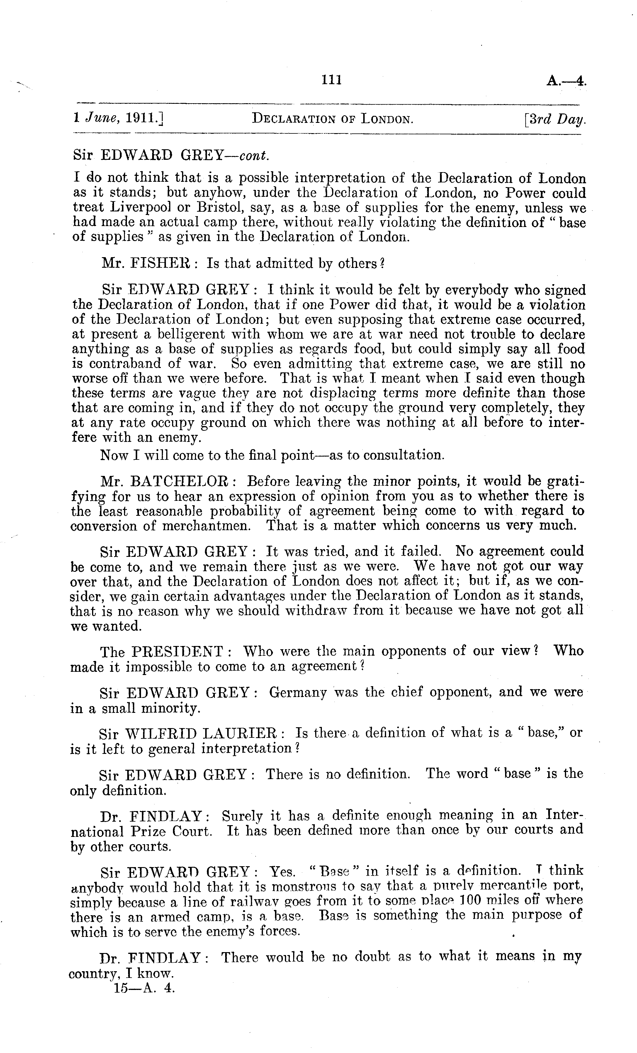 1 June, 1911.1 Declaration of London. [3rd Day. Sir EDWARD GREY— cont. I do not think that is a possible interpretation of the Declaration of London as it stands; but anyhow, under the Declaration of London, no Power could treat Liverpool or Bristol, say, as a base of supplies for the enemy, unless we had made an actual camp there, without really violating the definition of " base of supplies " as given in the Declaration of London. Mr. FISHER ; Is that admitted by others ? Sir EDWARD GREY : I think it would be felt by everybody who signed the Declaration of London, that if one Power did that, it would be a violation of the Declaration of London; but even supposing that extreme case occurred, at present a belligerent with whom we are at war need not trouble to declare anything as a base of supplies as regards food, but could simply say all food is contraband of war. So even admitting that extreme case, we are still no worse off than we were before. That is what I meant when I said even though these terms are vague they are not displacing terms more definite than those that are coming in, and if they do not occupy the ground very completely, they at any rate occupy ground on which there was nothing at all before to interfere with an enemy. Now I will come to the final point—as to consultation. Mr. BATCHELOR : Before leaving the minor points, it would be gratifying for us to hear an expression of opinion from you as to whether there is the least reasonable probability of agreement being come to with regard to conversion of merchantmen. That is a matter which concerns us very much. Sir EDWARD GREY : It was tried, and it failed. No agreement could be come to, and we remain there just as we were. We have not got our way over that, and the Declaration of London does not affect it; but if, as we consider, we gain certain advantages under the Declaration of London as it stands, that is no reason why we should withdraw from it because we have not got all we wanted. The PRESIDENT : Who were the main opponents of our view ? Who made it impossible to come to an agreement ? Sir EDWARD GREY : Germany was the chief opponent, and we were in a small minority. Sir WILFRID LAURIER : Is there a definition of what is a "base," or is it left to general interpretation ? Sir EDWARD GREY : There is no definition. The word " base "is the only definition. Dr. FINDLAY: Surely it has a definite enough meaning in an International Prize Court. It has been defined more than once by our courts and by other courts. Sir EDWARD GREY: Yes. "Base" in itself is a definition. T think anybody would hold that it is monstrous to say that a purely mercantile port, simply because a line of railway goes from it to some 100 miles off where there is an armed camp, is a base. Base is something the main purpose of which is to serve the enemy's forces. Dr. FINDLAY : There would be no doubt as to what it means in my country, I know.