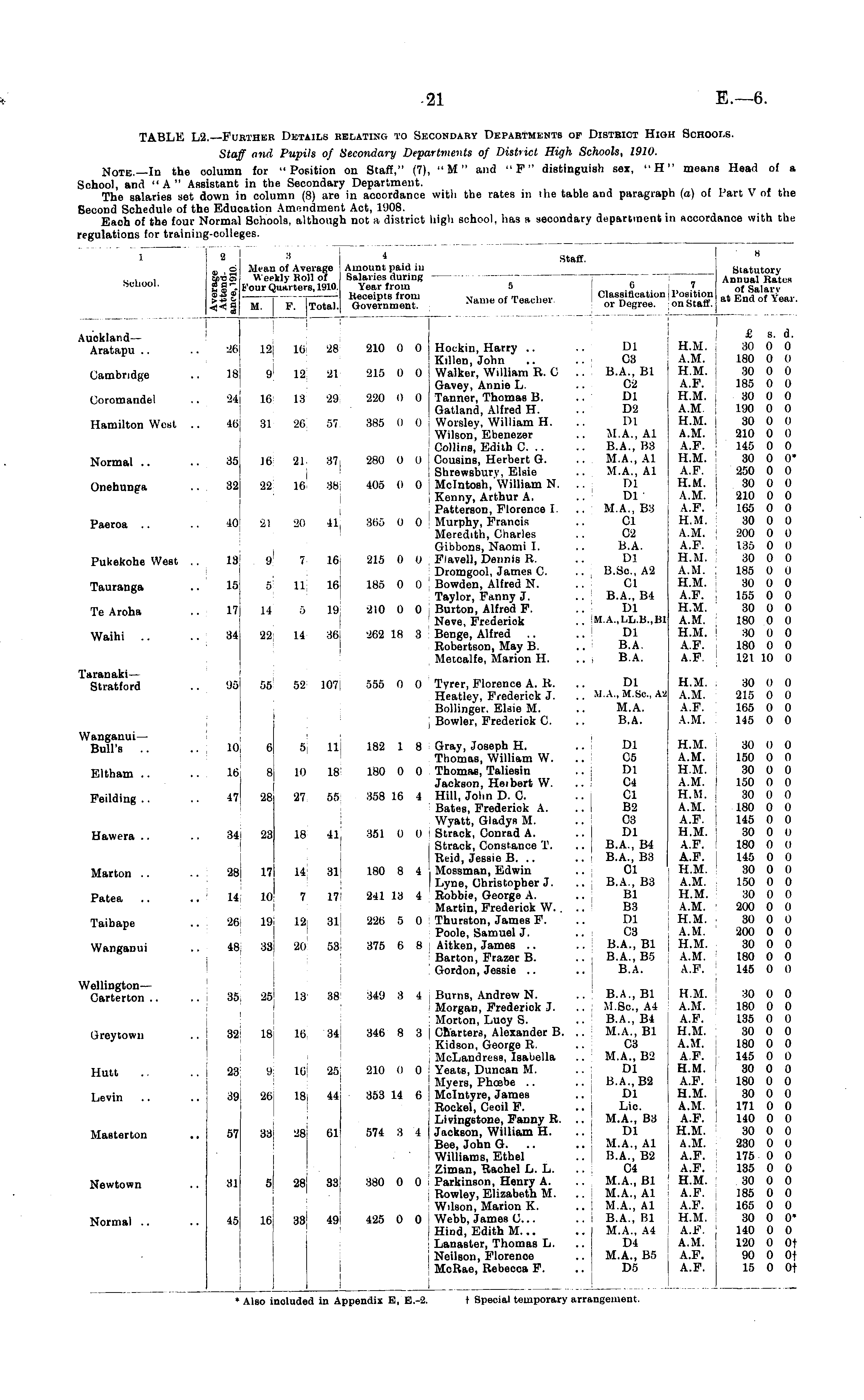 Note.—In the colt School, and " A " Assist The salaries set dov Second Schedule of the I Each of the four Nor regulations for training-c ;olumn listant lown i e Educ Jormal g-collei lumn taut wn ii Educ rmul colle| i for "Position on Staff," (7), "M" and "F" distinguish sex, "H" mean in the Secondary Department. n column (8) are in accordance with the rates in the table and paragraph (a) of cation Amendment Act, 1908. 1 Schools, although not a district high school, has a secondary department in aocort ges. s Head of a Part V of the iance with the 1 id School. «f h ID > 2 arc ir i-. ai .r a SIS t. :i 1 Staff. M. ii ii of Average Amount paid in Weekly Roll of Salaries (luring four Quarters, 1910. Year from 5 6 7 1 Keceipts from Nam,, nf Teacher Classification. Position M. F. Total. Government. Name ot LeaUit.1 or Degree. onStaff. 7 Position on Staff. H Statutory Annual Rates of Salary at End of Year. 9 < Jfl Auckland— Aratapu Cambridge Coromandel Hamilton West .. Normal Onehunga 26 18 ■,. 46 35 32 12 16 28 210 0 0 Hockin, Harry .. .. Dl . H.M. Killon, John .. C3 j A.M. 9 12 21 215 0 0 i Walker. William R. C .. B.A., Bl ! H.M. Gavey, Annie L. .. C2 A.F. 16 13 29 220 0 0 ! Tanner, Thomas B. .. Dl H.M. Gatland, Alfred H. .. D2 A.M. 31 26 57 385 0 0 I Worsley, William H. .. Dl H.M. Wilson", Ebenezer .. M.A., Ai A.M. Collins, Edith C B.A., B3 A.F. Hi 21 37 280 0 0 j Cousins, Herbert G. .. M.A., Al H.M. Shrewsbury, Elsie .. M.A., Al A.F. 22 16 38 405 0 0 Mcintosh, William N. .. Dl H.M. Kenny, Arthur A. .. Dl A.M. Patterson, Florence I. .. M.A., B3 A.F. 21 20 41 365 0 0 Murphy, Francis .. 01 H.M. Meredith, Charles .. C2 A.M. Gibbons, Naomi I. .. B.A. A.F. 'J 7 16 215 0 0 Flavell, Dennis R. .. Dl H.M. Dromgool, James C. .. B.Sc, A2 A.M. 11 161 185 0 0 Bowden, Alfred N. .. CI H.M. Taylor, Fanny J. .. B.A., B4 A.F. 14 5 19 210 0 0 Burton, Alfred F. .. Dl H.M. Neve, Frederiok .. M.A.,l,L.B.,Bl A.M. 22 14 36 262 1H 3 Benge, Alfred .. .. Dl H.M. Robertson, May B. .. B.A. A.F. Metcalfe, Marion H. ..| B.A. A.F. H.M. j A.M. ! H.M. i I A.F. H.M. A.M. H.M. A.M. A.F. H.M. A.F. j H.M. A.M. A.F. : H.M. A.M. A.F. H.M. A.M. H.M. A.F. H.M. A.M. H.M. A.F. A.F. £ s. d. 30 0 0 180 0 o 30 0 0 185 0 0 30 0 0 190 0 0 30 0 0 210 0 0 145 0 0 30 0 0* 250 0 0 30 0 I) 210 0 0 165 0 0 30 0 0 200 0 0 135 0 0 30 0 0 185 0 0 30 0 0 155 0 0 30 0 0 180 0 0 30 0 0 180 0 0 121 10 0 Paeroa 10 Pukekohe West .. 13 Tauranga 15 Te Aroha 17 Waihi 34 Taranaki— Stratford 98 55 52 107 555 0 0 Tyrer, Florence A. R. .. Dl H.M. Heatley, Frederick J. .. M.A., M.Sc., A2 A.M. Bollinger. Elsie M. .. M.A. A.F. ; Bowler, Frederick 0. .. B.A. A.M. 56 H.M. I A.M. A.F. A.M. 30 0 0 215 0 0 165 0 0 145 0 0 Wanganui— Bull's 10 Eltham Peilding Hawera Marton 16 47 34 28 i 6 5 11 182 1 8 Gray, Joseph H. .. Dl H.M. Thomas, William W. .. C5 A.M. 8 10 18 180 0 0 Thomas, Taliesin .. Dl H.M. Jackson, Heibert W. .. C4 A.M. 28 27 55 358 16 4 Hill, John D. C. CI H.M. Bates, Frederick A. ..I B2 A.M. Wyatt, Gladys M. .. 03 A.F. 23 18 41 351 0 0 Strack, Conrad A. .. Dl H.M. Strack, Constance T. ..j B.A., B4 A.F. Reid, Jessie B. .. .. B.A., B3 A.F. I 17 14 3li 180 8 4 j Mossman, Edwin .. ; CI H.M. I Lyne, Christopher J. .. B.A., B3 A.M. 10 7 17 241 13 4 Robbie, George A. .. Bl H.M. Martin, Frederiok W. . .. B3 A.M. ! 19 12 31 226 5 0 Thurston, James F. .. Dl H.M. Poole, Samuel J. .. C3 ! A.M. I 33 20 53 375 6 8 Aitken, James .. .. B.A., Bl H.M. Barton, Frazer B. .. B.A., B5 A.M. Gordon, Jessie .. .. B.A. . A.F. 21 23 8 18 H.M. A.M. H.M. A.M. ! H.M. A.M. A.F. i H.M. A.F. ' A.F. H.M. A.M. H.M. A.M. H.M. A.M. H.M. A.M. A.F. ; 30 0 0 150 0 0 30 0 0 150 0 0 30 0 0 180 0 0 145 0 0 30 0 0 180 0 0 145 0 0 30 0 0 150 0 0 30 0 0 200 0 0 30 0 0 200 0 0 30 0 0 180 0 0 145 0 0 17 Patea 14 10 I Taibape 26 19 Wanganui 48 33 Wellington— Carterton 35 25 13 38 349 3 4 Burns, Andrew N. B.A., Bl H.M. Morgan, Frederick J. .. M.Sc, A4 A.M. Morton, Lucy S. .. B.A., B4 A.F. 18 16 34 346 8 3 j Charters, Alexander B. .. M.A., Bl H.M. Kidson, George R. .. 03 i A.M. McLandress, Isabella .. M.A., B2 ' A.F. I y 16 25 210 0 0 : Yeats, Duncan M. .. Dl H.M. Myers, Phoebe .. .. B.A.,B2 : A.F. i 26 18 44 353 14 6 ; Mclntyre, James .. Dl H.M. Rockel, Cecil F. .. Lie. A.M. . Livingstone, Fanny R. .. M.A., B3 A.F. 33 28 61 574 3 4 j JackBon, William H. .. Dl I H.M. Bee, John G. .. .. M.A., Al j A.M. Williams, Ethel B.A., B2 A.F. Ziman, Rachel L. L. .. C4 A.F. 5 28 33 380 0 0 Parkinson, Henry A. .. M.A., Bl H.M. Rowley, Elizabeth M. .. M.A., Al A.F. Wilson, Marion K. .. M.A., Al A.F. 16 33 49 425 0 0 ' Webb, James C.. .. B.A., Bl H.M. Hind, Edith M... .. M.A., A4 A.F. Lanaster, Thomas L. .. D4 , A.M. Neilson, Florence .. M.A., B5 A.F. ! McRae, Rebecca F. .. D5 A.F. H.M. A.M. A.F. H.M. A.M. A.F. H.M. A.F. H.M. A.M. A.F. H.M. A.M. ' A.F. A.F. H.M. A.F. A.F. H.M. ■ A.F. A.M. A.F. A.F. 30 0 0 180 0 0 135 0 0 30 0 0 180 0 0 145 0 0 30 0 0 180 0 0 30 0 0 171 0 0 140 0 0 30 0 0 230 0 o 175 0 0 135 0 0 30 0 0 185 0 0 165 0 0 30 0 0' 140 0 0 120 0 Of 90 0 Of 15 0 Of 35 25 Grey tow n 32 32 18 Hutt 23 23 9 25 Levin 39 39 26 41 Masterton 57 57 33 28 61 Newtown 31 31 28 33 Normal .. 45 18 16 33 19 ! * Also included in Appendix E, E.-2. t Special temporary arrangement.