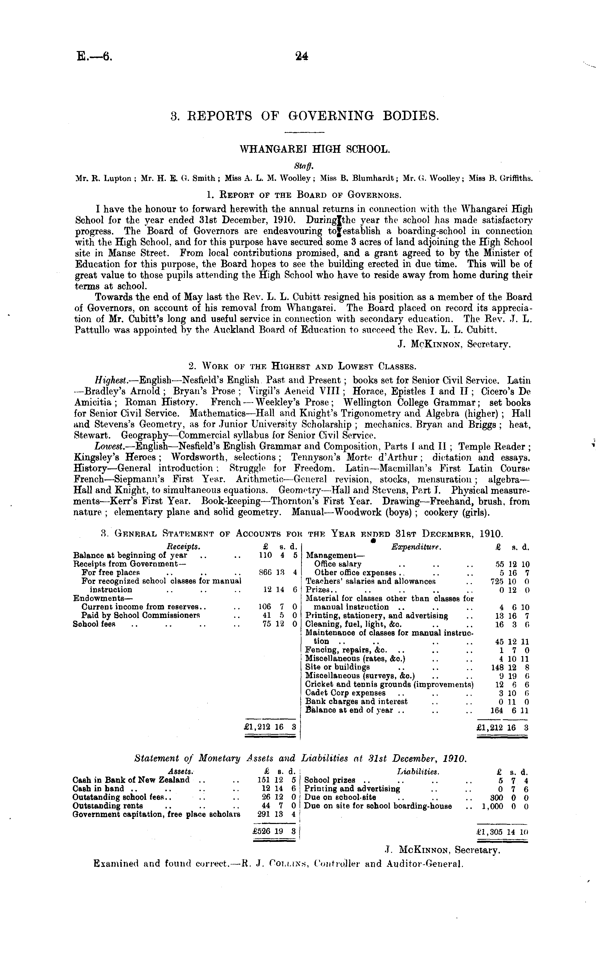 WHANGAREI HIGH SCHOOL. Staff. Mr. B. [iUpton ; Mr. H. E. G. Smith; Miss A. L. M. Woolley; Miss B. Blumhardt; Mr. (i. Woolley; Miss B. Griffiths. 1. Report of the Board of Governors. I have the honour to forward herewith the annual returns in connection with the Whangarei High School for the year ended 31st December, 1910. Duringjthe year the school has made satisfactory progress. The Board of Governors are endeavouring tojestablish a boarding-school in connection with the High School, and for this purpose have secured some 3 acres of land adjoining the High School site in Manse Street. From local contributions promised, and a grant agreed to by the Minister of Education for this purpose, the Board hopes to see the building erected in due time. This will be of great value to those pupils attending the High School who have to reside away from home during their terms at school. Towards the end of May last the Rev. L. L. Cubitt resigned his position as a member of the Board of Governors, on account of his removal from Whangarei. The Board placed on record its appreciation of Mr. Cubitt's long and useful .service in connection with secondary education. The Rev. J. L. Pattullo was appointed by the Auckland Board of Education to succeed the Rev. L. L. Cubiri. J. McKinnon. Secretary. 2. Work ckf the Highest and Lowest Classes. Highest.- —English —Nesfield's English Past and Present ; books set for Senior Civil Service. Latin —Bradley's Arnold ; Bryan's Prose ; Virgil's Aeneid VIII ; Horace, Epistles I and II ; Cicero's De Amicitia ; Roman History. French — Weekley's Prose ; Wellington College Grammar ; set books for Senior Civil Service. Mathematics —Hall and Knight's Trigonometry and Algebra (higher) ; Hall and Stevens's Geometry, as for Junior University Scholarship ; mechanics, Bryan and Briggs; heat, Stewart. Geography—Commercial syllabus for Senior Civil Service. Lowest.- —English- —Nesfield's English Grammar and Composition, Parts I and II ; Temple Reader ; Kingsley's Heroes ; Wordsworth, selections ; Tennyson's Morte d'Arthur ; dictation and essays. History—General introduction : Struggle for Freedom. Latin — Macmillan's First Latin Course French —Siepmann's First Year. Arithmetic—General revision, stocks, mensuration ; algebra— Hall and Knight, to simultaneous equations. Geometry—Hall and Stevens, Part I. Physical measurements —Kerr's First Year. Book-keeping —Thornton's First Year. Drawing—Freehand, brush, from nature ; elementary plane and solid geometry. Manual—Woodwork (boys) ; cookery (girls). ■ J >. General Statement of Accounts foh the Year ended 31st December, 1910. Receipts. £ s. d. Expenditure. £ s. d. Balance at beginning of year .. .. 110 4 5 Management— Receipts from Government— Office salary .. .. .. 55 12 10 For free places .. .. .. H6G 13 4 Other office expenses.. .. .. 5 16 7 For recognized school classes for manual Teachers' salaries and allowances .. 725 10 0 instruction .. .. .. 12 14 6 Prizes.. .. .. .. .. 0 12 0 Endowments— ! Material for classes other than classes for Current income from reserves.. .. 106 7 0 manual instruction .. .. .. 4 6 10 Paid by School Commissioners .. 41 5 0 Printing, stationery, and advertising .. 13 16 7 School fees .. .. .. .. 75 Vi 0 Cleaning, fuel, light, &c. .. .. 16 H 6 Maintenance of classes for manual instruction .. .. .. .. 45 12 11 Fencing, repairs, &c. .. .. .. 17 0 Miscellaneous (rates, &c.) .. .. 4 10 11 Site or buildings .. .. .. 148 12 R Miscellaneous (surveys, &o.) .. .. 919 (> Cricket and tennis grounds (improvements) 12 6 6 Cadet Corp expenses .. .. .. 3 10 0 Bank charges and interest .. .. 0 11 0 Balance at end of year .. .. .. 164 611 £1,212 16 3 £1,212 16 8 Statement of Monetary Assets and Liabilities at 31st December, 1910. Assets. £ s. d. Liabilities. £ s. d. Cash in Bank of New Zealand .. .. 151 12 5 School prizes .. .. .. .. 5 7 4 Cash in hand .. .. .. .. 12 14 6 Printing and advertising .. .. 0 7 0 Outstanding school fees.. .. .. JC> 12 0 Due on school-site .. .. .. 300 0 0 Outstanding rents .. .. .. 44 7 0 Due on site for sohool boarding-house .. 1,000 0 0 Government capitation, free place scholars 291 18 4 *526 19 3 £1,305 14 10 J. McKinnon, Secretary. Examined and found correct. —R. J. Collins, Controller and Auditor-General.