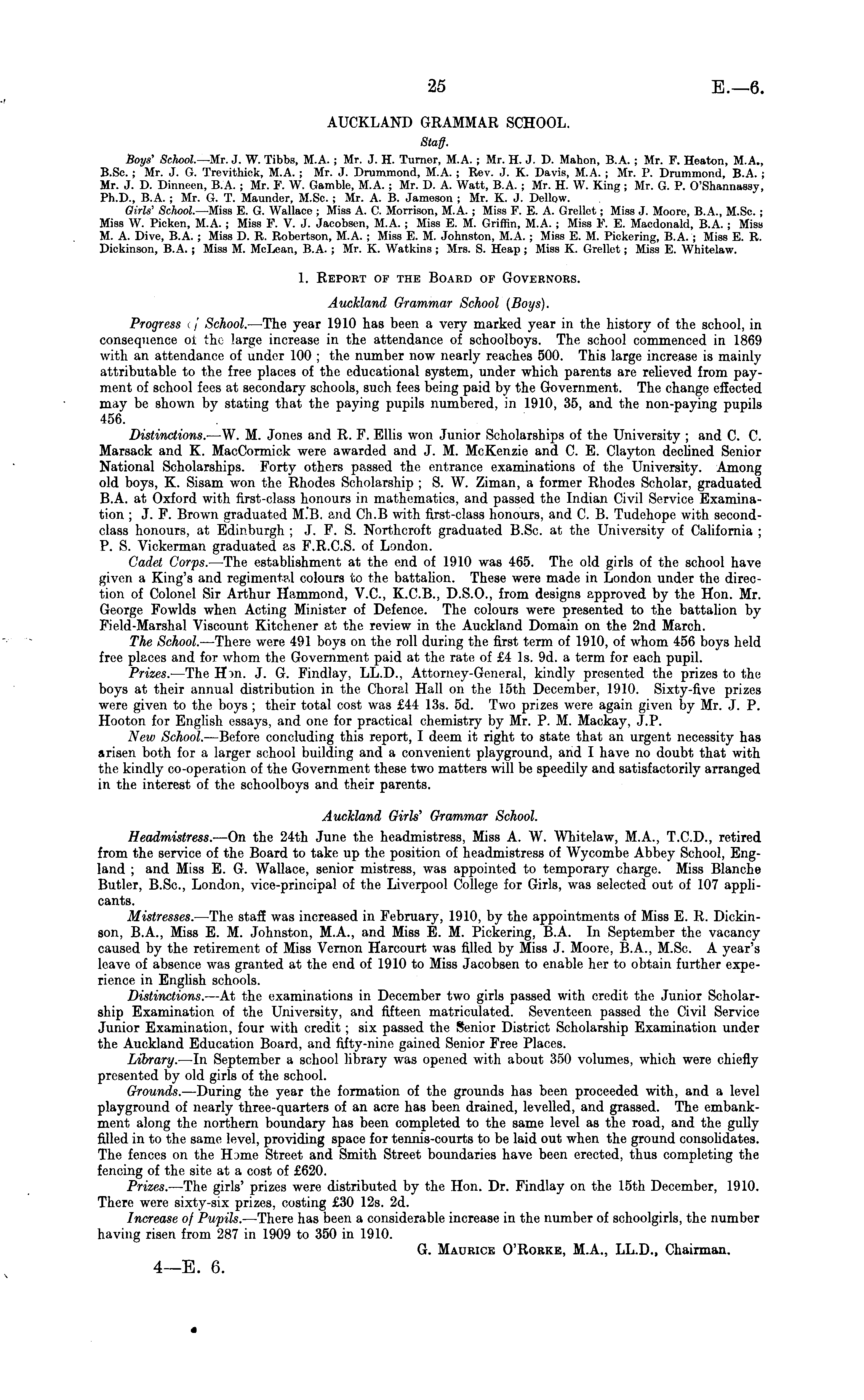 AUCKLAND GRAMMAR SCHOOL. Staff. Boys' School—Mt. J. W. Tibbs, M.A. ; Mr. J. H. Turner, M.A. ; Mr. H. J. D. Mahon, B.A. ; Mr. F. Heaton, M.A., B.Sc. ; Mr. J. G. Trevithick, M.A. ; Mr. J. Drummond, M.A. ; Rev. J. K. Davis, M.A. ; Mr. ]». Drummoml, B.A. ; Mr. J. D. Dinneen, B.A. ; Mr. F. W. Gamble, M.A. ; Mr. D. A. Watt, B.A. ; Mr. H. W. King ; Mr. G. P. O'Shannassy, Ph.D., B.A. ; Mr. G. T. Maunder, M.Sc. ; Mr. A. B. Jameson ; Mr. K. J. Dellow. Girls' School— Miss E. G. Wallace ; Miss A. C. Morrison, M.A. ; Miss F. E. A. Grellet; Miss J. Moore, 8.A., M.Sc. ; Miss W. Picken, M.A. ; Miss F. V. J. Jacobson, M.A. ; Miss E. M. Griffin, M.A. ; Miss F. E. Macdonald, B.A. ; Miss M. A. Dive, B.A. ; Miss D. R. Robertson, M.A. ; Miss E. M. Johnston, M.A. ; Miss E. M. Pickering, B.A. ; Miss E. R. Dickinson, B.A. ; Miss M. McLean, B.A. ; Mr. K. Watkins ; Mrs. S. Heap ; Miss K. Grellet; Miss E. Whitelaw. 1. Report of the Board op Governors. Auckland Grammar School (Boys). Progress c/ School. —The year 1910 has been a very marked year in the history of the school, in consequence ot the large increase in the attendance of schoolboys. The school commenced in 1869 with an attendance of under 100 ; the number now nearly reaches 500. This large increase is mainly attributable to the free places of the educational system, under which parents are relieved from payment of school fees at secondary schools, such fees being paid by the Government. The change effected m.iy be shown by stating that the paying pupils numbered, in 1910, 35, and the non-paying pupils 456. Distinctions. —W. M. Jones and R. F. Ellis won Junior Scholarships of the University ; and C. C. Marsack and K. MacCormick were awarded and J. M. McKenzie and C. E. Clayton declined Senior National Scholarships. Forty others passed the entrance examinations of the University. Among old boys, K. Sisam won the Rhodes Scholarship ; S. W. Ziman, a former Rhodes Scholar, graduated B.A. at Oxford with first-class honours in mathematics, and passed the Indian Civil Service Examination ; J. F. Brown graduated M.B. and Ch.B with first-class honours, and C. B. Tudehope with secondclass honours, at Edinburgh ; J. F. S. Northcroft graduated B.Sc. at the University of California ; P. S. Vickerman graduated as F.R.C.S. of London. Cadet Corps. —The establishment at the end of 1910 was 465. The old girls of the school have given a King's and regimental colours to the battalion. These were made in London under the direction of Colonel Sir Arthur Hammond, V.C., X.C.8., D.5.0., from designs approved by the Hon. Mr. George Fowlds when Acting Minister of Defence. The colours were presented to the battalion by Field-Marshal Viscount Kitchener at the review in the Auckland Domain on the 2nd March. The School. —There were 491 boys on the roll during the first term of 1910, of whom 456 boys held free places and for whom the Government paid at the rate of £4 Is. 9d. a term for each pupil. Prizes. —The Hm. J. G. Findlay, LL.D., Attorney-General, kindly presented the prizes to the boys at their annual distribution in the Choral Hall on the 15th December, 1910. Sixty-five prizes were given to the boys ; their total cost was £44 13s. sd. Two prizes were again given by Mr. J. P. Hooton for English essays, and one for practical chemistry by Mr. P. M. Mackay, J.P. New School. —Before concluding this report, I deem it right to state that an urgent necessity has arisen both for a larger school building and a convenient playground, and I have no doubt that with the kindly co-operation of the Government these two matters will be speedily and satisfactorily arranged in the interest of the schoolboys and their parents. Auckland Girls , Grammar School. Headmistress. —On the 24th June the headmistress, Miss A. W. Whitelaw, M.A., T.C.D., retired from the service of the Board to take up the position of headmistress of Wycombe Abbey School, England ; and Miss E. G. Wallace, senior mistress, was appointed to temporary charge. Miss Blanche Butler, B.Sc, London, vice-principal of the Liverpool College for Girls, was selected out of 107 applicants. Mistresses. —The staff was increased in February, 1910, by the appointments of Miss E. R. Dickinson, 8.A., Miss E. M. Johnston, M.A., and Miss E. M. Pickering, B.A. In September the vacancy caused by the retirement of Miss Vernon Harcourt was filled by Miss J. Moore, 8.A., M.Sc. A year's leave of absence was granted at the end of 1910 to Miss Jacobsen to enable her to obtain further experience in English schools. Distinctions. —At the examinations in December two girls passed with credit the Junior Scholarship Examination of the University, and fifteen matriculated. Seventeen passed the Civil Service Junior Examination, four with credit; six passed the Senior District Scholarship Examination under the Auckland Education Board, and fifty-nine gained Senior Free Places. Library. —ln September a school library was opened with about 350 volumes, which were chiefly presented by old girls of the school. Grounds. —During the year the formation of the grounds has been proceeded with, and a level playground of nearly three-quarters of an acre has been drained, levelled, and grassed. The embankment along the northern boundary has been completed to the same level as the road, and the gully filled in to the same level, providing space for tennis-courts to be laid out when the ground consolidates. The fences on the Hjme Street and Smith Street boundaries have been erected, thus completing the fencing of the site at a cost of £620. Prizes. —The girls' prizes were distributed by the Hon. Dr. Findlay on the 15th December, 1910. There were sixty-six prizes, costing £30 12s. 2d. Increase of Pupils. —There has been a considerable increase in the number of schoolgirls, the number having risen from 287 in 1909 to 350 in 1910. G. Maurice O'Rorke, M.A., LL.D., Chairman.