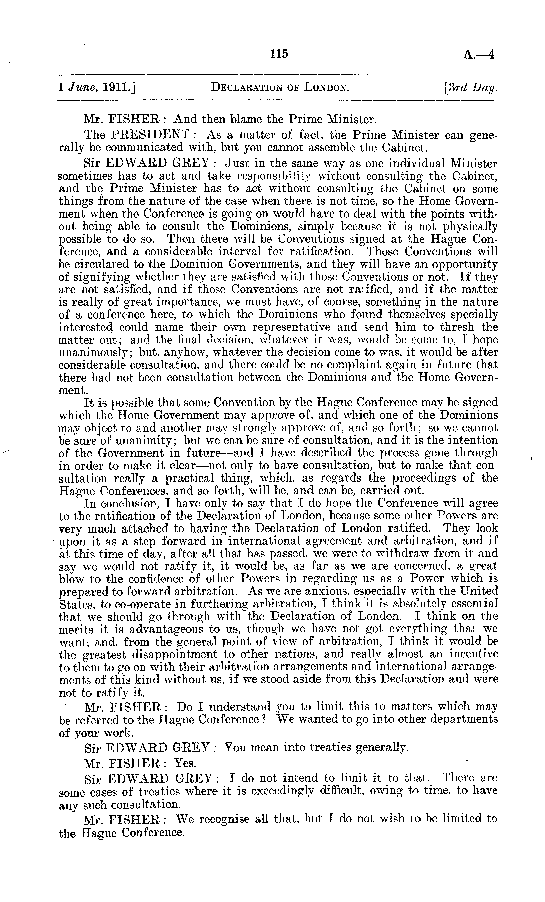1 June, 1911.] Declaration of London. [3rd Day. Mr. FISHER : And then blame the Prime Minister. The PRESIDENT : As a matter of fact, the Prime Minister can generally be communicated with, but you cannot assemble the Cabinet. Sir EDAVARD GREY : Just in the same way as one individual Minister sometimes has to act and take responsibility without consulting the Cabinet, and the Prime Minister has to act without consulting the Cabinet on some things from the nature of the case when there is not time, so the Home Government when the Conference is going on would have to deal with the points without being able to consult the Dominions, simply because it is not physically possible to do so. Then there will be Conventions signed at the Hague Conference, and a considerable interval for ratification. Those Conventions will be circulated to the Dominion Governments, and they will have an opportunity of signifying whether they are satisfied with those Conventions or not. If they are not satisfied, and if those Conventions are not ratified, and if the matter is really of great importance, we must have, of course, something in the nature of a conference here, to which the Dominions who found themselves specially interested could name their own representative and send him to thresh the matter out; and the final decision, whatever it was, would be come to, I hope unanimously; but, anyhow, whatever the decision come to was, it would be after considerable consultation, and there could be no complaint again in future that there had not been consultation between the Dominions and the Home Government. It is possible that some Convention by the Hague Conference may be signed which the Home Government may approve of, and which one of the Dominions may object to and another may strongly approve of, and so forth; so we cannot be sure of unanimity; but we can be sure of consultation, and it is the intention of the Government in future —and I have described the process gone through in order to make it clear —not only to have consultation, but to make that consultation really a practical thing, which, as regards the proceedings of the Hague Conferences, and so forth, will be, and can be, carried out. In conclusion, I have only to say that I do hope the Conference will agree to the ratification of the Declaration of London, because some other Powers are very much attached to having the Declaration of London ratified. They look upon it as a step forward in international agreement and arbitration, and if at this time of day, after all that has passed, we were to withdraw from it and say we would not ratify it, it would be, as far as we are concerned, a great blow to the confidence of other Powers in regarding us as a Power which is prepared to forward arbitration. As we are anxious, especially with the United States, to co-operate in furthering arbitration, I think it is absolutely essential that we should go through with the Declaration of London. I think on the merits it is advantageous to us, though we have not got everything that we want, and, from the general point of view of arbitration, I think it would be the greatest disappointment to other nations, and really almost an incentive to them to go on with their arbitration arrangements and international arrangements of this kind without us, if we stood aside from this Declaration and were not to ratify it. Mr. FISHER : Do I understand you to limit this to matters which may be referred to the Hague Conference ? We wanted to go into other departments of your work. Sir EDWARD GREY : You mean into treaties generally. Mr. FISHER : Yes. Sir EDWARD GREY : Ido not intend to limit it to that. There are some cases of treaties where it is exceedingly difficult, owing to time, to have any such consultation. Mr. FISHER : We recognise all that, but I do not wish to be limited to the Hague Conference.