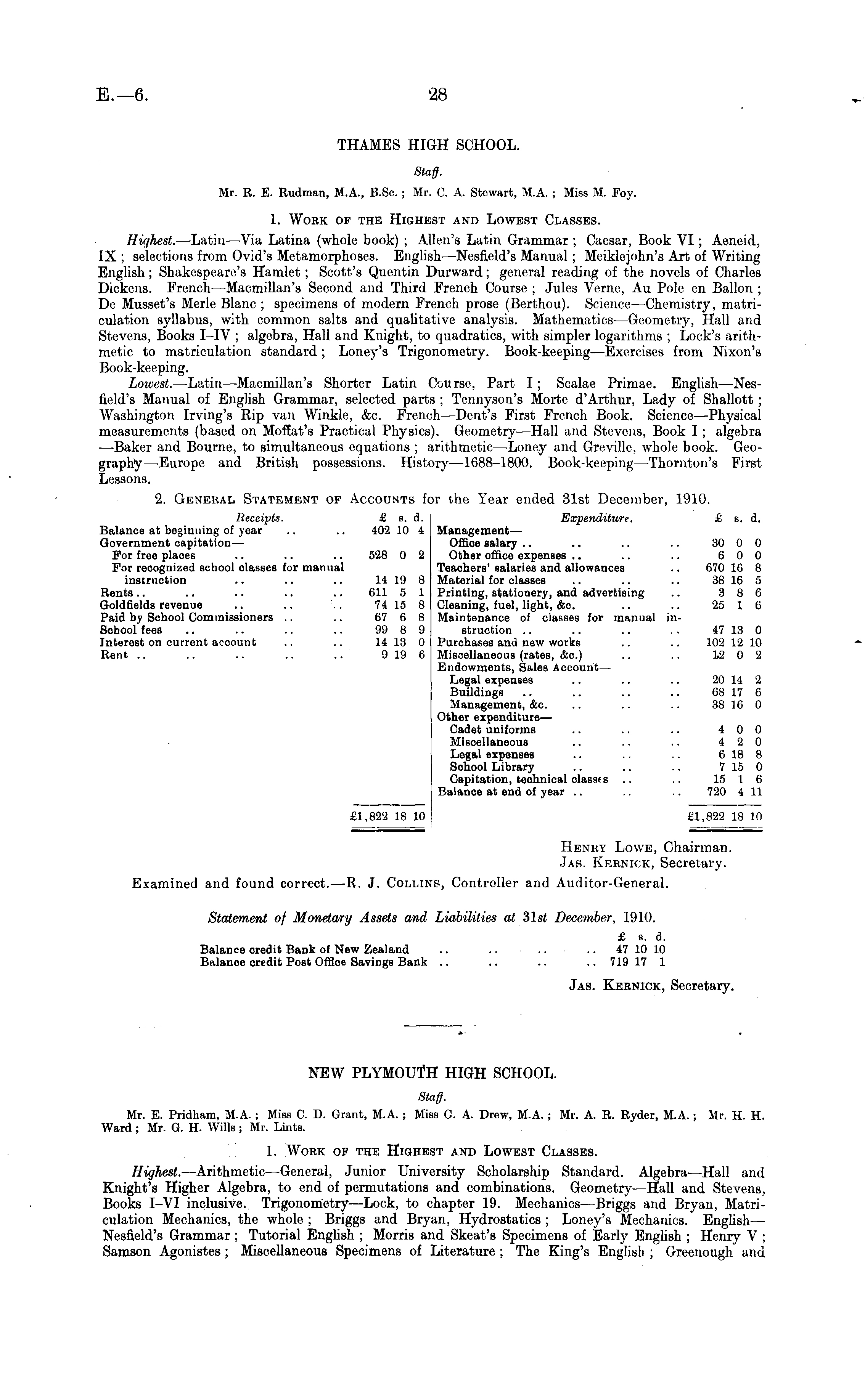 THAMES HIGH SCHOOL. Staff. Mr. R. E. Rudman, M.A., B.Sc. ; Mr. C. A. Stewart, M.A. ; Miss M. Foy. 1. Work op the Highest and Lowest Classes. Hv/hest. —Latin—Via Latina (whole book) ; Allen's Latin Grammar ; Caesar, Book VI; Aeneid, IX ; selections from Ovid's Metamorphoses. English —Nesfield's Manual ; Meiklejohn's Art of Writing English; Shakespeare's Hamlet; Scott's Quentin Durward; general reading of the novels of Charles Dickens. French —Macmillan's Second and Third French Course ; Jules Verne, Au Pole en Ballon ; Do Musset's Merle Blanc ; specimens of modern French prose (Berthou). Science —Chemistry, matriculation syllabus, with common salts and qualitative analysis. Mathematics—Geometry, Hall and Stevens, Books I-IV ; algebra, Hall and Knight, to quadratics, with simpler logarithms ; Lock's arithmetic to matriculation standard ; Loney's Trigonometry. Book-keeping —Exercises from Nixon's Book-keeping. Lowest. —Latin —Macmillan's Shorter Latin Course, Part I ; Scalae Primae. English —Nesfield's Manual of English Grammar, selected parts ; Tennyson's Mortc d'Arthur, Lady of Shallott ; Washington Irving's Rip van Winkle, &c. French —Dent's First French Book. Science—Physical measurements (based on MoSat's Practical Physics). Geometry —Hall and Stevens, Book I ; algebra —Baker and Bourne, to simultaneous equations ; arithmetic —Loney and Greville, whole book. Geography —Europe and British possessions. History—l6BB-1800. Book-keeping —Thornton's First Lessons. 2. General Statement of Accounts for the Year ended 31st December, 1910. Receipts. £ s. d. Expenditure. £ s. d. Balance at beginning of year .. .. 402 10 4 Management— Government capitation— Offioe salary .. .. .. .. 30 0 0 For free places .. .. .. 528 0 2 Other office expenses .. .. .. 6 0 0 For recognized school classes for manual Teachers' salaries and allowances .. 670 16 8 instruction .. .. .. 14 19 8 Material for classes .. .. .. 38 16 5 Rents.. .. .. .. .. 611 5 1 Printing, stationery, and advertising .. 3 8 6 Goldfields revenue .. .. .'. 74 15 8 Cleaning, fuel, light, &c. .. .. 25 1 6 Paid by School Commissioners .. .. 67 6 8 Maintenance of classes for manual inSchool fees .. .. .. .. 99 8 9 struction .. .. .. . . 47 13 0 Interest on current account .. .. 14 13 0 Purchases and new works .. .. 102 12 10 Rent .. .. .. .. .. 919 0 Miscellaneous (rates, &c.) .. .. 12 0 2 Endowments, Sales Account— Legal expenses .. .. .. 20 14 2 Buildings .. .. .. .. 68 17 6 Management, &c. .. .. .. 38 16 0 Other expenditure— Cadet uniforms .. .. .. 4 0 0 Miscellaneous .. .. .. 4 2 0 Legal expenses .. .. .. 6 18 8 Sohool Library .. .. .. 7 15 0 Capitation, technical classfs .. .. 15 1 6 Balance at end of year .. .. .. 720 4 11 £1,822 18 10 £1,822 18 10 Henky Lowe, Chairman. Jas. Kbbnick, Secretary. Examined and found correct.—R. J. Colt,ins, Controller and Auditor-General. Statement of Monetary Assets and Liabilities at 31st December, 1910. £ s. d. Balance credit Bank of New Zealand .. .. .. .. 47 10 10 Bulanoe credit Post Office Savings Bank .. .. .. .. 719 17 1 Jas. Kernick, Secretary. » •