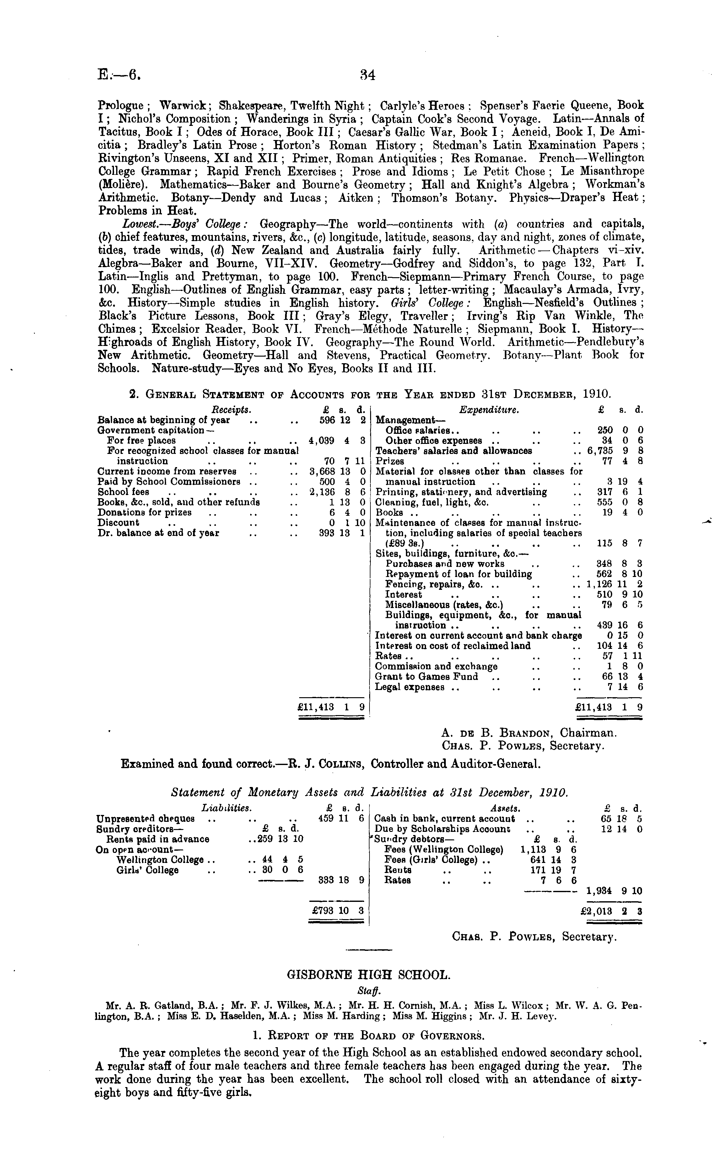 Prologue ; Warwick; Shakespeare, Twelfth Night ; Carlyle's Heroes ; Spenser's Faerie Queene, Book I; Nichol's Composition ; Wanderings in Syria ; Captain Cook's Second Voyage. Latin- —Annals of Tacitus, Book I; Odes of Horace, Book III; Caesar's Gallic War, Book I; Aeneid, Book I, De Amicitia ; Bradley's Latin Prose ; Horton's Roman History ; Stedman's Latin Examination Papers ; Rivington's Unseens, XI and XII; Primer, Roman Antiquities ; Res Romanae. French —Wellington College Grammar ; Rapid French Exercises ; Prose and Idioms ; Le Petit Chose ; Le Misanthrope (Moliere). Mathematics—Baker and Bourne's Geometry ; Hall and Knight's Algebra ; Workman's Arithmetic. Botany—Dendy and Lucas ; Aitken ; Thomson's Botany. Physics—Draper's Heat; Problems in Heat. Lowest. — Boys , College : Geography—The world —continents with (a) countries and capitals, (b) chief features, mountains, rivers, &c, (c) longitude, latitude, seasons, day and night, zones of climate, tides, trade winds, (d) New Zealand and Australia fairly fully. Arithmetic — Chapters vi-xiv. Alegbra—Baker and Bourne, VII-XIV. Geometry—Godfrey and Siddon's, to page 132, Part I. Latin-—lnglis and Prettyman, to page 100. French—Siepmann—Primary French Course, to page 100. English—Outlines of English Grammar, easy parts ; letter-writing ; Macaulay's Armada, Ivry, &c. History —Simple studies in English history. Girls , College: English —Nesfield's Outlines ; Black's Picture Lessons, Book 111 ; Gray's Elegy, Traveller; Irving's Rip Van Winkle, The Chimes ; Excelsior Reader, Book VI. French—Methode Naturelle ; Siepmann, Book I. History — H : ghroads of English History, Book IV. Geography —The Round World. Arithmetic —Pendlebury's New Arithmetic. Geometry—Hall and Stevens, Practical Geometry. Botany —Plant Book for Schools. Nature-study —-Eyes and No E} r es, Books II and 111. 2. General Statement op Accounts for the Year ended 31st December, 1910. Receipts. £ s. d. Expenditure. £ s. d. Balance at beginning of year .. .. 596 12 2 Management— Government capitation— Office Ralaries.. .. .. .. 250 0 0 For free places .. .. .. 4,039 4 3 Other office expenses .. .. .. 34 0 6 For recognized school classes for manual Teachers'salaries and allowances .. 6,735 9 8 instruction .. .. .. 70 7 11 Prizes .. .. .. .. 77 4 8 Current income from reserves .. .. 3,668 13 0 Material for classes other than classes for Paid by School Commissioners .. .. 500 4 0 manual instruction .. .. .. 319 4 School fees .. .. .. .. 2,136 8 6 Printing, stationery, and advertising .. 317 6 1 Books, Ac, sold, and other refunds .. 113 0 Cleaning, fuel, light, &o. .. .. 555 0 8 Donations for prizes .. .. .. 6 4 0 Books .. .. .. .. .. 19 4 0 Discount .. .. .. .. 0 1 10 Maintenance of classes for manual instrucDr. balance at end of year .. .. 393 13 1 tion, including salaries of special teachers (£B9 35.) .. .. .. .. 115 8 7 Sites, buildings, furniture, &o.— Purchases and new works .. .. 348 8 3 Repayment of loan for building .. 562 810 Fencing, repairs, &o. .. .. .. 1,126 11 2 Interest .. .. .. 510 9 10 Miscellaneous (rates, &c.) .. .. 79 6 5 Buildings, equipment, &c, for manual instruction.. .. .. .. 439 16 6 Interest on ourrent account and bank charge 0 15 0 Interest on cost of reclaimed land .. 104 14 6 Rates .. .. .. .. .. 57 1 11 Commission and exchange .. .. 18 0 Grant to Games Fund .. .. .. 66 13 4 Legal expenses .. .. .. .. 7 14 6 £11,413 1 9 £11,413 1 9 A. de B. Brandon, Chairman. Chas. P. Powles, Secretary. Examined and found correct. — R. J. Collins, Controller and Auditor-General. Statement of Monetary Assets and Liabilities at 31st December, 1910. Liabilities. £ s. d. Assets. £ s. d. Unpresenten , oheques .. .. .. 459 11 6 Cash in bank, current accouut .. .. 65 18 5 Sundry creditors — £ s. d. Due by Scholarships Acoounc .. .. 12 14 0 Rents paid in advance ..259 13 10 Sin dry debtors— £ s. d. On op?n ac-ount— Fees (Wellington College) 1,113 9 6 Wellington College .. ..44 4 5 Fees (Girls' College) .. 64114 3 Girls' College .. .. 30 0 6 Rents .. .. 171 19 7 333 18 9 Rates .. .. 7 6 6 1,934 9 10 £793 10 8 £2,013 2 3 Chas. P. Powles, Secretary. GISBORNE HIGH SCHOOL. Staff. Mr. A. R. Gatland, B.A. ; Mr. F. J. Wilkes, M.A. ; Mr. H. H. Cornish, M.A. ; Miss L. Wilcox; Mr. W. A. G. Penlington, B.A. ; Miss E. D. Haselden, M.A. ; Miss M. Harding; Miss M. Higgins; Mr. J. H. Levey. 1. Report op the Board op Governors. The year completes the second year of the High School as an established endowed secondary school. A regular staff of four male teachers and three female teachers has been engaged during the year. The work done during the year has been excellent. The school roll closed with an attendance of sixtyeight boys and fifty-five girls.