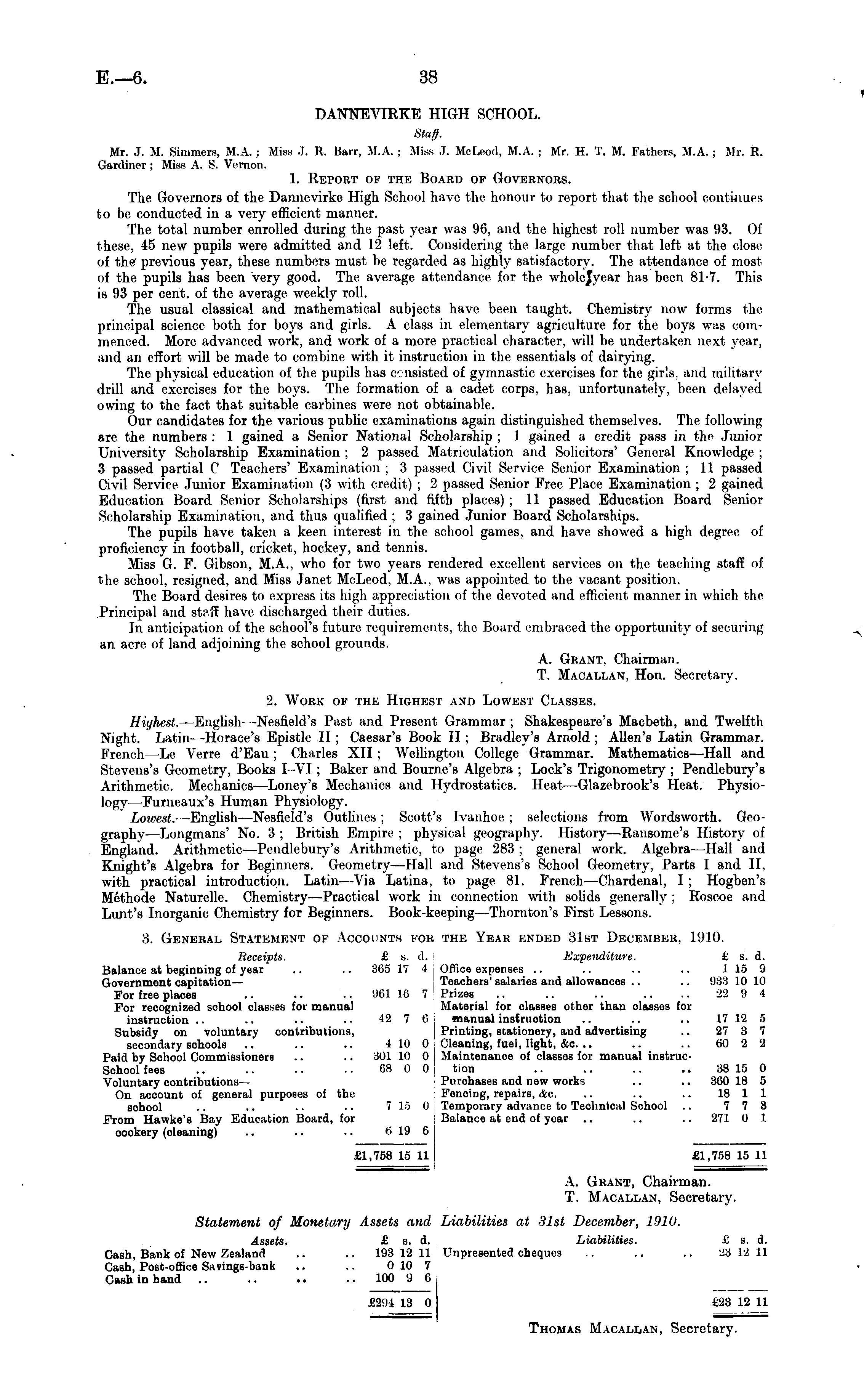 DANNEVIRKE HIGH SCHOOL. SttlfJ. Mr. J. M. Simmers, M.A. ; Miss .1. R. Hair, M.A. ; Miss J. MoLeod, M.A. ; Mr. H. T. M. Fathers, M.A. ; Mr. R. Gardiner ; Miss A. S. Vcrnon. 1. Report op the Board of Governors. The Governors of the Dannevirke High School have the honour to report that the school continues to be conducted in a very efficient manner. The total number enrolled during the past year was 96, and the highest roll number was 93. Of these, 45 new pupils were admitted and 12 left. Considering the large number that left at the close of the , previous year, these numbers must be regarded as highly satisfactory. The attendance of most of the pupils has been very good. The average attendance for the wholojyear has been 81-7. This is 93 per cent, of the average weekly roll. The usual classical and mathematical subjects have been taught. Chemistry now forms the principal science both for boys and girls. A class in elementary agriculture for the boys was commenced. More advanced work, and work of a more practical character, will be undertaken next year, and an effort will be made to combine with it instruction in the essentials of dairying. The physical education of the pupils has c< osisted of gymnastic exercises for the girls, and military drill and exercises for the boys. The formation of a cadet corps, has, unfortunately, been delayed owing to the fact that suitable carbines were not obtainable. Our candidates for the various public examinations again distinguished themselves. The following are the numbers : 1 gained a Senior National Scholarship ; 1 gained a credit pass in the Junior University Scholarship Examination ; 2 passed Matriculation and Solicitors' General Knowledge ; 3 passed partial C Teachers' Examination; 3 passed Civil Service Senior Examination; 11 passed Civil Service Junior Examination (3 with credit) ; 2 passed Senior Free Place Examination ; 2 gained Education Board Senior Scholarships (first and fifth places) : 11 passed Education Board Senior Scholarship Examination, and thus qualified ; 3 gained Junior Board Scholarships. The pupils have taken a keen interest in the school games, and have showed a high degree of proficiency in football, cricket, hockey, and tennis. Miss G. F. Gibson, M.A., who for two years rendered excellent services on the teaching staff of the school, resigned, and Miss Janet McLeod, M.A.. was appointed to the vacant position. The Board desires to express its high appreciation of the devoted and efficient manner in which the. Principal and staff have discharged their duties. In anticipation of the school's future requirements, the Board embraced the opportunity of securing an acre of land adjoining the school grounds. A. Grant, Chairman. T. Macallan, Hon. Secretary. 2. Work of the Highest and Lowest Classes. Highest. —English —Nesfield's Past and Present Grammar; Shakespeare's Macbeth, and Twelfth Night. Latin —Horace's Epistle II : Caesar's Book II; Bradley's Arnold; Allen's Latin Grammar. French —Le Verre d'Eau ; Charles XII ; Wellington College Grammar. Mathematics —Hall and Stevens's Geometry, Books I—VI ; Baker and Bourne's Algebra ; Lock's Trigonometry ; Pendlebury's Arithmetic. Mechanics —Loney's Mechanics and Hydrostatics. Heat—Glazebrook's Heat. Physiology —Furneaux's Human Physiology. Lowest. —English—Nesfield's Outlines ; Scott's Ivanhoe ; selections from Wordsworth. Geography —Longmans' No. 3 ; British Empire ; physical geography. History —Ransome's History of England. Arithmetic —Pendlebury's Arithmetic, to page 283 ; general work. Algebra—Hall and Knight's Algebra for Beginners. Geometry—Hall and Stevens's School Geometry, Parts I and 11, with practical introduction. Latin—Via Latina, to page 81. French—Chardenal, I ; Hogben's Mcthode Naturelle. Chemistry —Practical work in connection with solids generally ; Roscoe and Lunt's Inorganic Chemistry for Beginners. Book-keeping—Thornton's First Lessons. 3. General Statement of Accounts for the Year knded 31st December, 1910. Receipts. £ s. d. Expenditure. £ s. d. Balance at beginning of year .. .. 365 17 4 Office expenses .. .. .. .. 115 9 Government capitation— Teachers' salaries and allowances .. .. 933 10 10 For free places .. .. '.. %1 16 7 Prizes .. .. .. .. .. -22 9 4 For recognized sohool classes for manual Material for classes other than olasses for instruction .. .. .. .. 12 7 6 manual instruction .. .. .. 17 12 5 Subsidy on voluntary contributions, Printing, stationery, and advertising .. 27 3 7 secondary schools .. .. .. 410 0 Cleaning, fuel, light, &c. .. .. .. 60 2 2 Paid by School Commissioners .. .. 301 10 0 Maintenance of classes for manual instrucSchool fees .. .. .. .. 68 0 0 tion .. .. .. .. 38 15 0 Voluntary contributions — Purchases and new works .. .. 360 18 5 On account of general purposes of the Fencing, repairs, &c. .. .. .. 18 1 1 school .. .. .. • ■ 7 15 0 Temporary advance to Technical School .. 7 7 3 From Hawke's Bay Education Board, for Balance at end of year .. .. .. 271 0 1 oookery (cleaning) .. .. .. 6 19 6 £1,758 15 11 £1,758 15 11 A. Grant, Chairman. T. Macallan, Secretary. Statement of Monetary Assets and Liabilities at 31st December, 1910. Assets. £ s. d. Liabilities. i; s. d. Cash, Bank of New Zealand .. .. 193 12 11 Unpresented cheques .. .. .. 23 1-2 11 Cash, Poßt-office Savings-bank .. .. 010 7 Cash in band .. .. .. .. 100 9 6 £204 13 0 628 12 11 Thomas Macallan, Secretary.