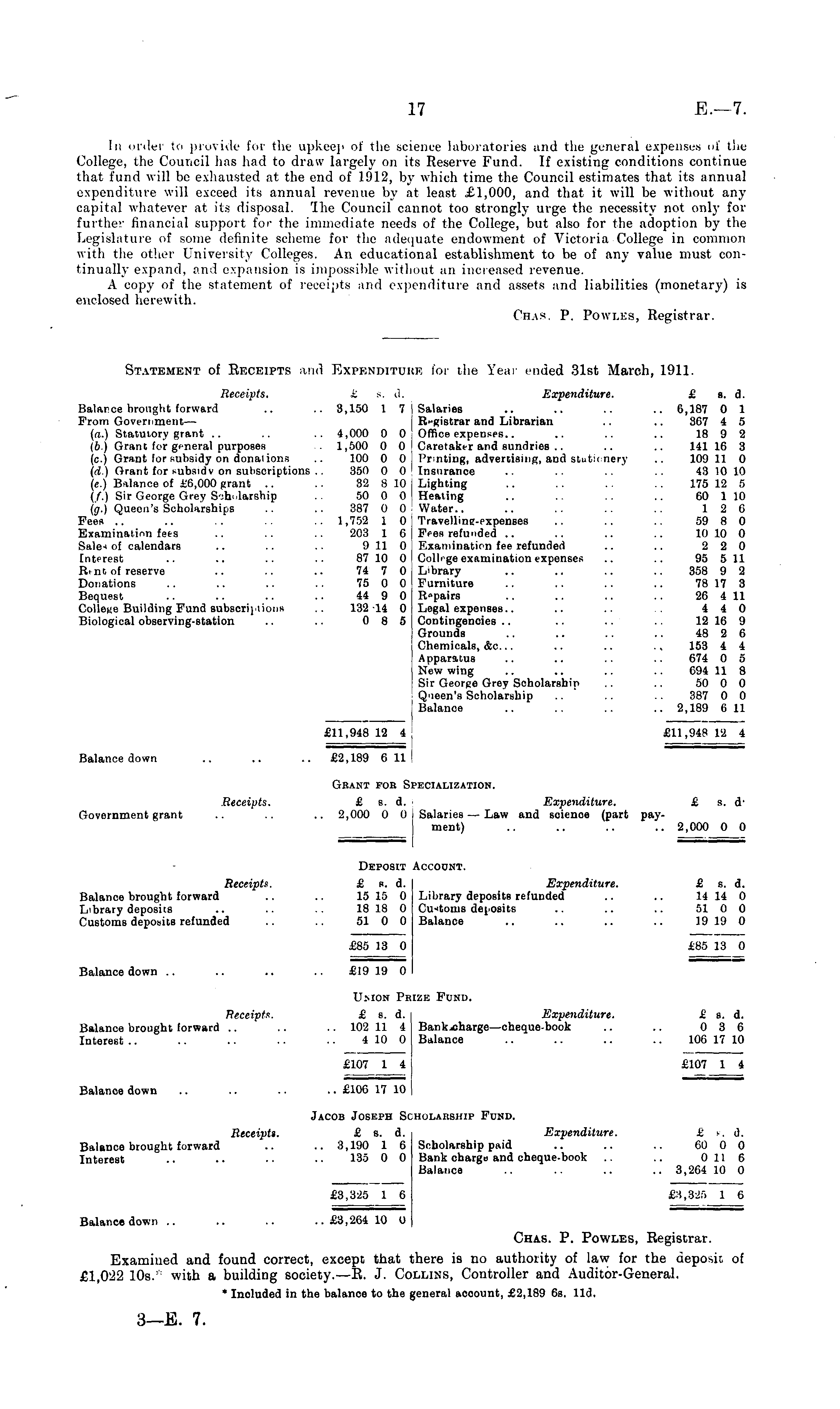 In order to provide for the upkeep of the science laboratories and the general expenses of the College, the Council has had to draw largely on its Reserve Fund. If existing conditions continue that fund will be exhausted at the end of 1912, by which time the Council estimates that its annual expenditure will exceed its annual revenue by at least £1,000, and that it will be without any capital whatever at its disposal. Ihe Council cannot too strongly urge the necessity not only for further financial support for the immediate needs of the College, but also for the adoption by the Legislature of some definite scheme for the adequate endowment of Victoria College in common with the other University Colleges. An educational establishment to be of any value must continually expand, and expansion is impossible without an increased revenue. A copy of the statement of receipts and expenditure and assets and liabilities (monetary) is enclosed herewith. (has. P. Powlks, Registrar. Statement of Receipts and Expenditure for the Year ended 31st March, 1911. Receipts. £ s. A. Expenditure. £ s. d. Balance brought forward .. .. 3,150 1 7 Salaries .. .. .. .. 6,187 0 1 From Government — Registrar and Librarian .. .. 367 4 5 (a.) Statutory grant .. .. 4,000 0 0 Office expenses.. .. .. .. 18 9 2 (6.) Grant for general purposes 1,500 0 0 Caretaker and sundries .. .. .. 141 16 3 (c.) Grant for subsidy on donations .. 100 0 0 Prntiug, advertising, and stationery .. 109 11 0 (d.) Grant for subsidy on subscriptions .. 350 0 0 Insurance .. .. 43 10 10 (c.) Balance of £6,000 grant .. .. 32 810 I Lighting .. .. .. .. 175 12 5 (f.) Sir George Grey Scholarship 50 0 0 | Heating .. .. .. 60 1 10 (g.) Queen's Scholarships .. .. 387 0 0 Water.. .. .. .. .. 12 6 Fees .. .. .. .. 1,752 1 0 Travelling-expenses .. .. .. 59 8 0 Examination fees .. .. 203 1 6 Fees refunded .. .. .. .. 10 10 0 Sale-< of calendars .. .. .. 9 11 0 Examination fee refunded .. .. 2 2 0 Interest .. .. .. .. 87 10 0 College examination expenses .. .. 95 511 R. Nt of reserve .. .. .. 74 7 0 Library .. .. .. .. 358 9 2 Donations .. .. .. 75 0 0 Furniture .. .. 78 17 3 Bequest .. .. .. .. 44 9 0 Repairs .. .. .. .. 26 411 College Building Fund subscriptions .. 132 14 0 Legal expenses.. .. .. 4 4 0 Biological observing-station .. .. 0 8 5 Contingencies .. .. 12 16 9 Grounds .. .. .. 48 2 6 Chemicals, &c... .. .. ~ 153 4 4 Apparatus .. .. .. .. 674 0 5 New wing .. .. .. .. 694 11 8 Sir George Grey Scholarship .. .. 50 0 0 Qneen's Scholarship .. .. .. 387 0 0 Balance .. .. .. .. 2,189 6 11 £11,948 12 4 £11,948 12 4 Balance down .. .. .. £2,189 611 Grant fob Specialization. Receipts. £ s. d. Expenditure. £ s. d' Government grant .. .. .. 2,000 0 0 Salaries — Law and scienoe (part payment) .. .. .. .. 2,000 0 0 Deposit Account. Receipts. £ s. d. Expenditure. £ s. d. Balance brought forward .. .. 15 15 0 Library deposits refunded .. .. 14 14 0 Library deposits .. .. .. 18 18 0 Customs deposits .. .. .. 51 0 0 Customß deposits refunded .. .. 51 0 0 Balance .. .. .. .. 19 19 0 £85 13 0 £85 13 0 Balance down .. .. .. .. £19 19 0 Umon Pbize Fund. Receipts. £ s. d. Expenditure. £ s. d. Balance brought forward .. .. .. 102 11 4 Bankxsharge—cheque-book .. .. 03 6 Interest .. .. .. .. .. 4 10 0 Balance .. .. .. .. 106 17 10 £107 1 4 £107 1 4 Balance down .. .. .. .. £106 17 10 Jacob Joseph Scholarship Fund. Receipts. £ s. d. Expenditure. £ ►. d. Balance brought forward .. .. 3,190 1 6 Scholarship paid .. .. .. 60 0 0 Interest .. .. .. .. 135 0 0 Bank charge and cheque-book .. .. 011 6 Balance .. .. .. .. 3,264 10 0 £3,325 1 6 £8,326 1 6 Balance down .. .. .. ..£3,264 10 O Chas. P. Powles, Registrar. Examined and found correct, except that there is no authority of law for the deposit of £1,022 10s. :: with a building society.—R. J. Collins, Controller and Auditor-General. * Inoluded in the balance to the general acoount, £2,189 6s. lid.