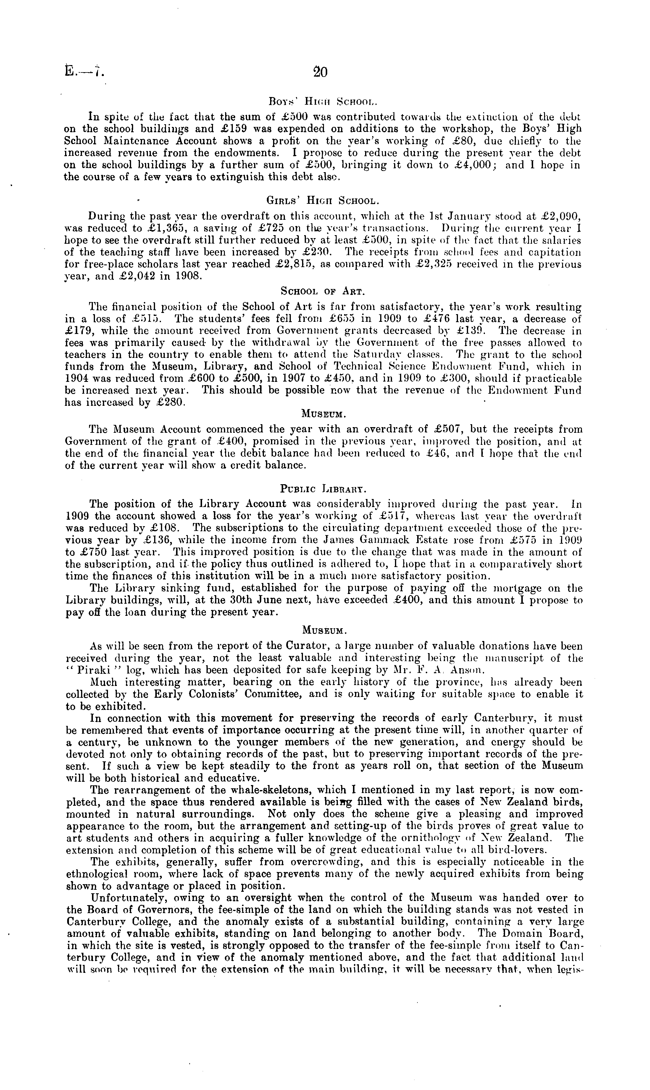 Boys' High School. In spite of the fact that the sum of £500 was contributed towards the extinction of the on the school buildings and £159 was expended on additions to the workshop, the Boys' High School Maintenance Account shows a profit on the year's working of £80, due chiefly to the increased revenue from the endowments. I propose to reduce during the present year the debt on the school buildings by a further sum of £500, bringing it down to £4,000; and 1 hope in the course of a few years to extinguish this debt also. Girls' High School. During the past year the overdraft on this account, which tit the Ist January stood at £2,090, was reduced to £1,365, a saving of £725 on the yen's transactions. During the current year I hope to see the overdraft still further reduced by at least £500, in spite of the fact that the salaries of the teaching staff have been increased by £230. The receipts from school lees and capitation for free-place scholars last year reached £2,815. as compared with £2,325 received in the previous year, and £2,042 in 1908." School of Art. The financial position of the School of Art is far from satisfactory, the year's work resulting in a loss of £515. The students' fees fell from £655 in 19011 to £170 last year, a decrease of £179, while the amount received from Government giants decreased by £139. The decrease in fees was primarily caused by the withdrawal by the Government of the free passes allowed to teachers in the country to enable them to attend the Saturday classes. The grant to the school funds from the Museum, Library, and School of Technical Science Endowment Fund, which in 1904 was reduced from £600 to £500, in 1907 to £450. and in 1909 to £300, should if practicable be increased next year. This should be possible now that the revenue of the Endowment Fund has increased by £280. Museum. The Museum Account commenced the year with an overdraft of £507, but the receipts from Government of the grant of £400, promised in the previous year, improved the position, and at the end of the financial year the debit balance had been reduced to £46, and I hope that the end of the current year will show a credit balance. Public Library. The position of the Library Account was considerably improved during the past year. In 1909 the account showed a loss for the year's working of £517, whereas last year the overdraft was reduced by £108. The subscriptions to the circulating department exceeded those of the previous year by £136, while the income from the James Gammack Estate rose from .£575 in 1909 to £750 last year. This improved position is due to the change that was made in the amount of the subscription, and if the policy thus outlined is adhered to, 1 hope that in a comparatively short time the finances of this institution will be in a much more satisfactory position. The Library sinking fund, established for the purpose of paying oil' the mortgage on the Library buildings, will, at the 30th June next, have exceeded £400, and this amount I propose to pay off the loan during the present year. Museum. As will be seen from the report of the Curator, a large number of valuable donations have been received during the year, not the least valuable and interesting being the manuscript of the " Piraki " log, which has been deposited for safe keeping by Mr. F. A Anson. Much interesting matter, bearing on the early history of the province, has already been collected by the Early Colonists' Committee, and is only waiting for suitable space to enable it to be exhibited. In connection with this movement for preserving the records of early Canterbury, it must be remembered that events of importance occurring at the present time will, in another quarter of a century, be unknown to the younger members of the new generation, and energy should be devoted not only to obtaining records of the past, but to preserving important records of the present. If such a view be kept steadily to the front as years roll on, that section of the Museum will be both historical and educative. The rearrangement of the whale-skeletons, which I mentioned in my last report, is now completed, and the space thus rendered available is being filled with the cases of New Zealand birds, mounted in natural surroundings. Not only does the scheme give a pleasing and improved appearance to the room, but the arrangement and setting-up of the birds proves of great value to art students and others in acquiring a fuller knowledge of the ornithology of New Zealand. The extension and completion of this scheme will be of great educational value to all bird-lovers. The exhibits, generally, suffer from overcrowding, and this is especially noticeable in the ethnological room, where lack of space prevents many of the newly acquired exhibits from being shown to advantage or placed in position. Unfortunately, owing to an oversight when the control of the Museum was handed over to the Board of Governors, the fee-simple of the land on which the building stands was not vested in Canterbury College, and the anomaly exists of a substantial building, containing a very large amount of valuable exhibits, standing on land belonging to another body. The Domain Board, in which the site is vested, is strongly opposed to the transfer of the fee-simple from itself to Canterbury College, and in view of the anomaly mentioned above, and the fact that additional land will soon be required for the extension of the main building, it will be necessary that, when legis