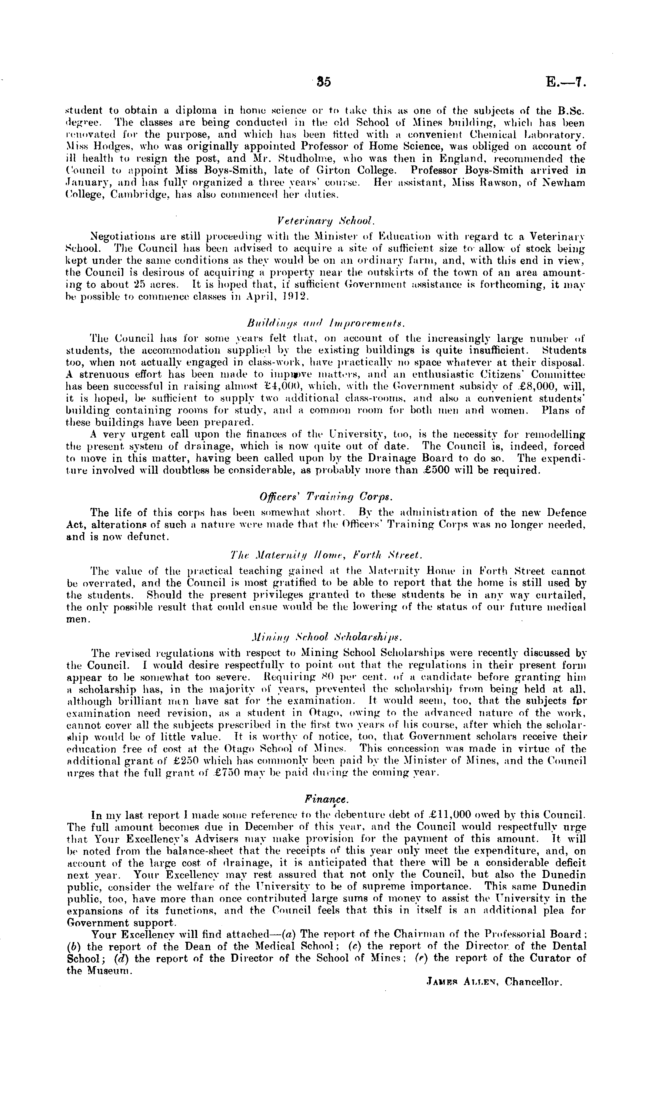 student to obtain v diploma in home science or to take this as one of the subjects of the B.Sc. degree. The classes are being conducted in the old School of Mines building, which has been renovated for the purpose, and which has been fitted with a convenient Chemical Laboratory. Miss Hodges, who was originally appointed Professor of Home Science, was obliged on account of ill health to resign the post, and Mr. Studholme. who was then in England, recommended the Council to appoint Miss Boys-Smith, late of Girton College. Professor Boys-Smith arrived in January, and has fully organized a three years' course. Her assistant. Miss Rawson, of Newham ("liege. Cambridge, has also commenced her duties. Veterinary School. Negotiations are still proceeding with the Minister of Education with regard tc a Veterinary School. The Council has been advised to acquire a site of sufficient size to allow of stock being kept under the same conditions as they would be on an ordinary farm. and. with this end in view, the Council is desirous of acquiring a properly near the outskirts of the town of an area amounting to about 25 acres. It is hoped that, if sufficient Governmenl assistance is forthcoming, it may be possible- to commence classes in April. 1912. Buildings and Improvements. The Council has for some years felt that, on account of the increasingly large number of students, the accommodation supplied by the existing buildings is quite insufficient. Students too, when not actually engaged in class-work, have practically no space whatever at their disposal. A strenuous effort lias been made to impqDVe matters, and an enthusiastic Citizens' Committee has been successful in raising almost £4,000, which, with the Government subsidy of .£B,OOO, will, it is hoped, be sufficient to supply two additional class-rooms, and also a convenient students' building containing rooms for study, and a common room for both men and women. Plans of these buildings have been prepared. A very urgent call upon the finances of the University, too, is the necessity for remodelling the present system of drainage, which is now ipiite out of date. The Council is, indeed, forced to move in this matter, having been called upon by the Drainage Board to do so. The expenditure involved will doubtless be considerable, as probably more than £500 will be required. Officers' Trai:'i nil Corps. The life of this corps has been somewhat short. By the administration of the new Defence Act, alterations of such a nature were made that the Officers' Training Corps was no longer needed. and is now defunct. Tht Maternity Home, Forth Street. The value of the practical teaching gained at the Maternity Home in Forth Street cannot be overrated, and the Council is most gratified to be able to report that the home is still used by the students. Should the present privileges granted to these students be in any way curtailed, the only possible result that could ensue would be the lowering of the status of our future medical men. Mining School Scholarships. The revised regulations with respect to Mining School Scholarships were recently discussed by the Council. 1 would desire respectfully to point out that the regulations in their present form appear to be somewhat too severe. Requiring 80 per cent, of a candidate before granting him a scholarship has, in the majority of years, prevented the scholarship from being held at all, although brilliant nun have sat for the examination. It would seem, too, that the subjects for examination need revision, as a student in Otago. owing to the advanced nature of the work, cannot cover all the subjects prescribed ill the first two years of his course, after which the scholar ship would be of little value. It is worthy of notice, too. that Government scholars receive their education free of cost at the Otago School of Mines. This concession was made in virtue of the additional grant of £250 which has commonly been paid by the Minister of Mines, and the Council urges that the full grant, of £750 may be paid during the coming year. Finance. In mv last report I made some reference to the debenture debt of £11,000 owed by this Council. The full amount becomes due in December of this year, and the Council would respectfully urge >har Your Excellency's Advisers may make provision for the payment of this amount. It will be noted from the balance-sheet that the receipts of this year only meet the expenditure, and, on account of the large cost of drainage, it is anticipated that there will be a considerable deficit next year. Your Excellency may rest assured that not only the Council, but also the Dunedin public, consider the welfare of the University to be of supreme importance. This same Dunedin public, too, have more than once contributed large sums of money to assist the University in the expansions of its functions, and the Council feels that this in itself is an additional plea for Government support. Your Excellency will find attached — (a) The report of the Chairman of the Professorial Board ; (b) the report of the Dean of the Medical School; (c) the report of the Director of the Dental School; (d) the report of the Director of the School of Mines; (c) the report of the Curator of the Museum. James Ai.I.BN, Chancellor.