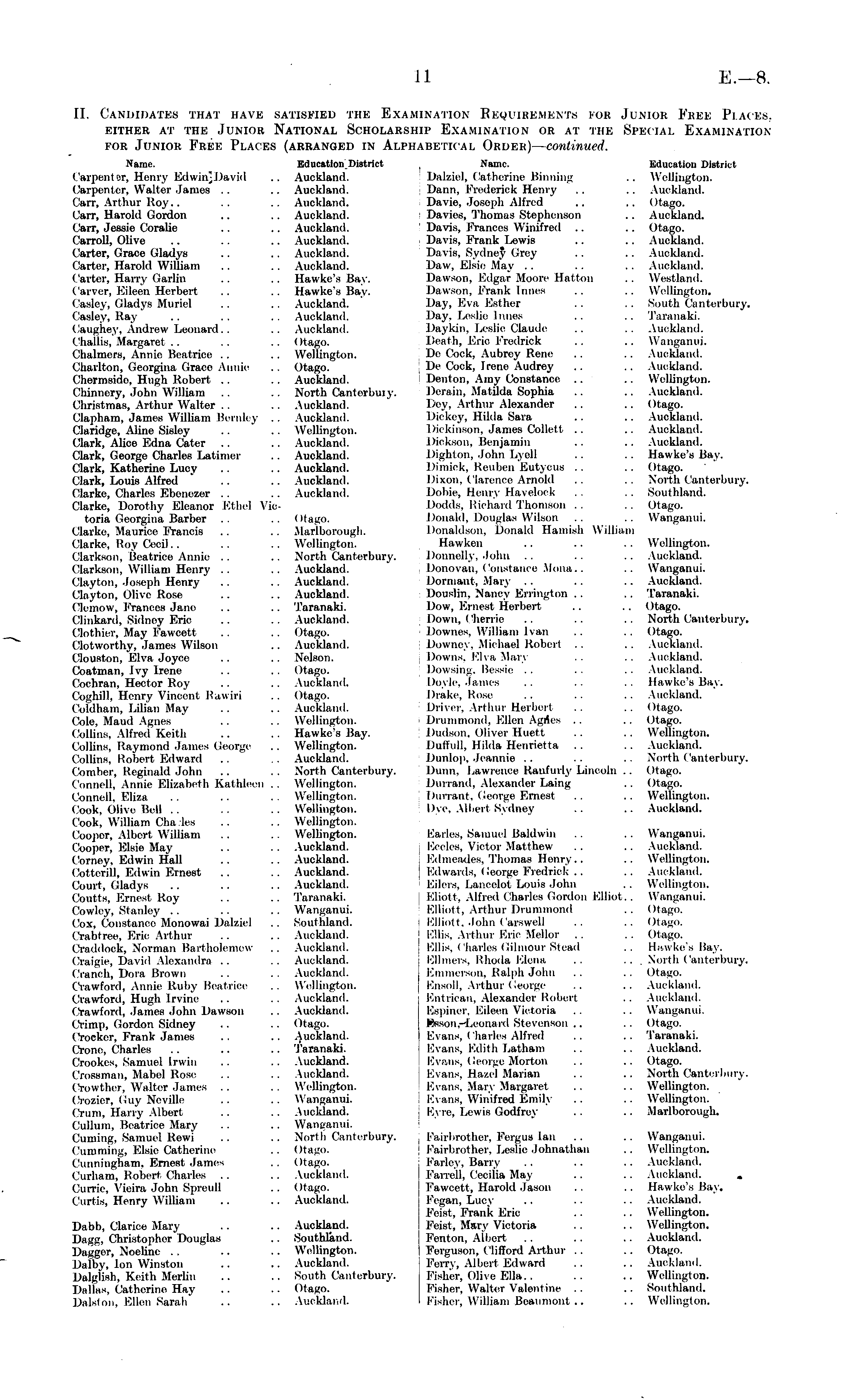 11. Candidates that have satisfied the Examination Requirements fob Junior Free Places, either a , ] , the Junior National Scholarship Examination ob at the Special Examination for Junior Free Places (arranged in Alphabetical Order) continued. Name. Education District , Name. Education District Carpenter, Henry EdwinjDavid .. Auckland. Dalziel, Catherine Binning .. Wellington. Carpenter, Walter Jamee .. .. Auckland. Dann. Frederick Henry .. .. Auckland. Carr, Arthur Roy.. .. .. Auckland. Davie, Joseph Allied .. .. Otago. Carr, Harold Gordon .. .. Auckland. Davies, Thomas Stephenson .. Auckland. Carr, Jessie Coralie .. .. Auckland. Davis, Francos Winifred .. .. Otago. Carroll, Olive .. .. .. Auckland. Davis, Frank Lewis .. .. Auckland. Carter, Grace Gladys .. .. Auckland. Davis, Sydney Grey .. .. Auckland. Carter, Harold William .. .. Auckland. Daw, Elsie May .. .. .. Auckland. Carter*, Harry Garlin .. .. Hawke's Bay. Dawson, Edgar Moore Hatton .. Westland. Carver, Eileen Herbert .. .. Hawke's Bay. Dawson, Frank lime.-' .. .. WoUington. Casley, Gladys Muriel .. .. Auckland. Day, Eva Esther .. .. South Canterbury. Casley, Kay .. .. .. Auckland. Day, Leslie Innes .. .. Taranaki. Caughey, Andrew Leonard.. .. Auckland. Daykin. Leslie Claude .. .. Auckland. ChaQis, Margaret .. .. .. Otago. Death, Erio Fredrick .. .. Wanganui. Chalmers, Annie Beatrice .. .. Wellington. De Cock, Aubrey Rene .. .. Auckland. Chnrlton, Georgina Grace Annie .. Otago. De Cook, Irene Audrey .. .. Auckland. Chermsido, Hugh Kobert .. .. Auckland. Denton, Amy Constance .. .. Wellington. Chinnery, John William .. .. North Canterbury. Derain, Matilda Sophia .. .. Auckland. Christmas, Arthur , Walter .. .. Auckland. Dey, Arthur Alexander .. .. Otago. Clapham, James William Bornley .. Auckland. Dickey, Hilda Sara .. .. Auckland. Claridge, Aline Sieley .. .. Wellington. Dickinson, James Collet* .. .. Auckland. Clark, Alice Edna Cater .. .. Auckland. Diokson, Benjamin .. .. Auckland. Clark, George Charles Latimer .. Auckland. Dighton, John Lyell .. .. Hawke's Bay. Clark, Katherino Lucy .. .. Auckland. Dimick, Reuben Eutyoue .. .. Otago. ('lark, Louis Alfred .. .. Auckland. Dixon, Clarence Arnold .. .. North Canterbury. Clarke, Charles Ebenezer .. .. Auckland. Dobie, Henri Havelock .. .. Southland. Clarke, Dorothy Eleanor Ethel Vie- Dodds, Richard Thomson .. .. Otago. toria Georgina Barber .. .. Otago. Donald, Douglas Wilson .. .. Wanganui. Clarke, Maurice Francis .. .. Mivrlborough. Donaldson. Donald Bamish William Clarke, Roy Ceoil.. .. .. Wellington. Hawken .. .. .. Wellington. Clarkeon, Heal rice Annie .. .. North Canterbury. Donnelly, John .. .. .. Auckland. Clarkson, William Henry .. .. Auckland. Donovan, Constance Mona .. .. Wanganui. Clayton, Joseph Henry .. .. Auckland. Dormant, Mary .. .. .. Auckland. Clayton, Olive Rose .. .. Auckland. Douslin, Nancy Errington .. .. Taranaki. Clemow, Franoes Jane .. .. Taranaki. Dow. Ernest Herbert .. .. Otago. Cliniard, Sidney Eric .. .. Auckland. Down, Cherrie .. .. .. North Canterbury. Clothier, May Fawoett .. .. otago. Downes, William Ivan .. .. Otago. Clol worthy, James Wilson .. Auckland. Downey, Michael Robert .. .. Auckland. Clouston, Elva Joyce .. .. Nelson. Downs. Elva Mary .. .. Auckland. Coalman, Ivy Irene .. .. Otago. Dowsing. Bessie .. .. .. Auckland. Coohran, Hector Roy .. .. Auckland. Doyle, James .. .. .. Hawke's Bay. Coghill, llenrv Vincenl Itawiri .. Otago. Drake, Rose .. .. .. Auckland. Coldliani, Lilian May .. .. Auckland. Driver, Arthur Herbert .. .. Otago. Cole. Maud Ague.- .. .. Wellington. Drummond, Ellen Agnee .. .. Otago. Collins, Alfred Keith .. .. Hawke's Hay. Dudson, Oliver Huetl .. .. Wellington. Collins, Raymond James George .. Wellington. Duffull, Hilda Henrietta .. .. Auckland. Collins. Robert Edward .. .. Auckland. Dunlop, Jeannie .. .. .. North Canterbury. Comber, Reginald John .. .. North Canterbury. Dunn. Lawrence Ranfurly Lincoln .. Otago. Council. Annie Elizabeth Kathleen .. Wellington. Durrand, Alexander Laing .. 01 Council. Eliza .. .. .. Wellington. Durrant, George Ernest .. .. Wellington. Cook, Olive Bell .. .. .. Wellington. Dye, Albert Sydney .. .. Auckland. Cook. William Clia les .. .. Wellington. Cooper, Allierl William .. .. Wellington. Earles, Samuel Baldwin .. .. Wanganui. Cooper, Elsie May .. .. Auckland. Eccles, Victor Matthew .. .. Auckland. Corney, Edwin Hall .. .. Auckland. Edmeades, Thomas Henry.. .. Wellington. Cotterill, Edwin Ernest .. .. Auckland. Edwards, George Fredrick .. .. Auckland. Court, Gladys .. .. .. Auckland. Eilers, Lancelot Louis John .. Wellington. Couiis. Ernest Roy .. .. Taranaki. Eliott, Alfred Charles Gordon Elliot.. Wanganui. Cowley, Stanley .. .. .. Wanganui. Elliott, Arthur Drummond .. otago. Cox, Constance Monowai Dalziel .. Southland. Elliott, John Carswell .. .. Otago. Crabtree, Erio Arthur .. .. Auckland. Ellis, Arthur Eric Mellor .. .. otago. Craddook, Norman Bartholemow .. Auckland. Ellis, Charles Gilmour Stead .. Hawke's Bay. Craigie, David Alexandra .. .. Auckland. EUmere, Rhoda Elena .. ... North Canterbury. ('ranch, Dora Brow D.. .. Auckland. Emmerson, Ralph John .. .. Otago. Crawford. Annie Ruby Beatrice .. Wellington. Ensoll, Arthur George .. .. Auckland. Crawford, Hugh Irvine .. .. Auckland. Entrican, Alexander Robert .. Auckland. Crawford, James John Dawson .. Auckland. Espiner, Eileen Victoria .. .. Wanganui. Crimp, Cordon Sidney .. .. Otago. Leonard Stevenson .. .. Otago. Croeker, Frank James .. .. Auckland. Evans, Charles Alfred .. .. Taranaki. Crone, Charles .. .. .. Taranaki. Evans, Edith Latham .. .. Auckland. Crookes, Samuel [rwin .. .. Auckland. Evans, George Morton .. .. Otago. Crossman, Mabel Rose .. .. taokland. Evans, Hazel Marian .. .. North Canterbury. Crowther, Walter James .. .. Wellington. Evans, Mar} Margaret .. .. Wellington. Crozief, Guy Neville .. .. Wanganui. Evans, Winifred Emily .. .. Wellington. Crum, Harry Albert .. .. Auckland. Eyre, Lewis Qodfrej .. .. Marlborou