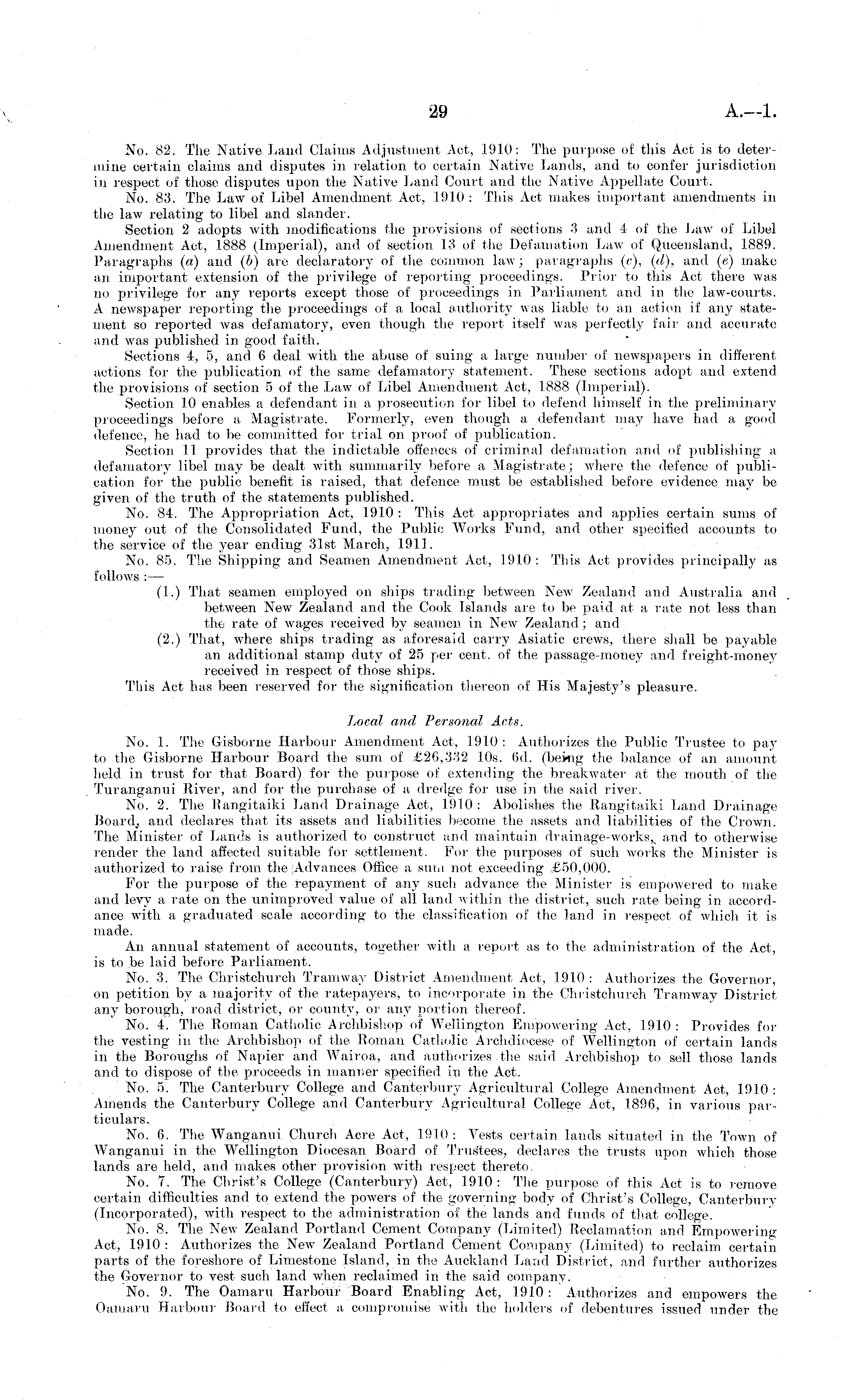 No. 82. The Native Land Claims Adjustment Act, 1910: The purpose of this Act is to determine certain claims and disputes in relation to certain Native Lands, and to confer jurisdiction in respect of those disputes upon the Native Land Court and the Native Appellate Court. No. 83. The Law of Libel Amendment Act, 1910 : This Act makes important amendments in the law relating to libel and slander. Section 2 adopts with modifications the provisions of .sections 3 and 4 of the Law of Libel Amendment Act, 1888 (Imperial), and of section 13 of the Defamation Law of Queensland, 1889. Paragraphs («) and (6) arc declaratory of the common law; paragraphs {<■), (d), and (c) make an important extension of the privilege of reporting proceedings. Prior to this Act there was no privilege for any reports except those of proceedings in Parliament and in the law-courts. A newspaper reporting the proceedings of a local authority was liable to an action if any statement so reported was defamatory, even though the report itself was perfectly fair and accurate and was published in good faith. Sections 4, 5, and 6 deal with the abuse of suing a large number of newspapers in different actions for the publication of the same defamatory statement. These sections adopt and extend the provisions of section 5 of the Law of Libel Amendment Act, 1888 (Imperial). Section 10 enables a defendant in a prosecution for libel to defend himself in the preliminary proceedings before a Magistrate. Formerly, even though a defendant ma}' have had a good defence, he had to be committed for trial on proof of publication. Section 11 provides that the indictable offences of criminal defamation and of publishing a defamatory libel may be dealt with summarily before a Magistrate; where the defence of publication for the public benefit is raised, that defence must be established before evidence may be given, of the truth of the statements published. No. 84. The Appropriation Act, 1910 : This Act appropriates and applies certain sums of money out of the Consolidated Fund, the Public Works Fund, and other specified accounts to the service of the year ending 31st March, 1911. No. 85. The Shipping and Seamen Amendment Act, 1910: This Act provides principally as follows :— (1.) That seamen employed on ships trading between New Zealand and Australia and between New Zealand and the Cook Islands are to be paid at a rate not less than the rate of wages received by seamen in New Zealand ; and (2.) That, where ships trading as aforesaid carry Asiatic crews, there shall be payable an additional stamp duty of 25 per cent, of the passage-money and freight-money received in respect of those ships. This Act has been reserved for the signification thereon of His Majesty's pleasure. Local and Personal Acts. No. 1. The Gisborue Harbour Amendment Act, 1910 : Authorizes the Public Trustee to pay to the Gisborne Harbour Board the sum of £26,332 I.os. 6d. (being the balance of an amount held in trust for that Board) for the purpose of extending the breakwater at the mouth of the Turanganui River, and for the purchase of a dredge for use in the said river. No. 2. The liangitaiki Land Drainage Act, 1910: Abolishes the Rangitaiki Land Drainage Board; and declares that its assets and liabilities become the assets and liabilities of the Crown. The Minister of Lands is authorized to construct and maintain drainage-works,, and to otherwise render the land affected suitable for settlement. For the purposes of such works the Minister is authorized to raise from the Advances Office a, sum not exceeding £50,000. For the purpose of the repayment of an}' such advance the Minister is empowered to make and levy a rate on the unimproved value of all land within the district, such rate being in accordance with a graduated scale according to the. classification of the land in respect of which it is made. An annual statement of accounts, together with a report as to the administration of the Act, is to be laid before Parliament. No. 3. The Christchurch Tramway District Amendment Act, 1910: Authorizes the Governor, on petition by a majority of the ratepayers, to incorporate in the Christchurch Tramway District any borough, road district, or county, or any portion thereof. No. 4. The Roman Catholic Archbishop of Wellington Empowering Act, 1.910 : Provides for the vesting in the Archbishop of the Roman Catholic Archdiocese of Wellington of certain lands in the Boroughs of Napier and Wairoa, and authorizes the said Archbishop to sell those lands and to dispose of the proceeds in manner specified in the Act. No. 5. The Canterbury College and Canterbury Agricultural College Amendment Act, 1910 : Amends the Canterbury College and Canterbury Agricultural College Act, 1896, in various particulars. No. 6. The Wanganui Church Acre Act, 1910: Vests certain lands situated in the Town of AVanganui in the Wellington Diocesan Board of Trustees, declares the trusts upon which those lands are held, and makes other provision with respect thereto. No. 7. The Christ's College (Canterbury) Act, 1910 : The purpose of this Act is to remove certain difficulties and to extend the powers of the governing body of Christ's College, Canterbury (Incorporated), with respect to the administration of the lands and funds of that college. No. 8. The New Zealand Portland Cement Company (Limited) Reclamation and Empowering Act, 1910 : Authorizes the New Zealand Portland Cement Company (Limited) to reclaim certain parts of the foreshore of Limestone Island, in the Auckland Land District, and further authorizes the Governor to vest such land when reclaimed in the said company. No. 9. The Oamaru Harbour Board Enabling Act, 1910 : Authorizes and empowers the Oamaru Harbour Board to effect a compromise with the holders of debentures issued under the
