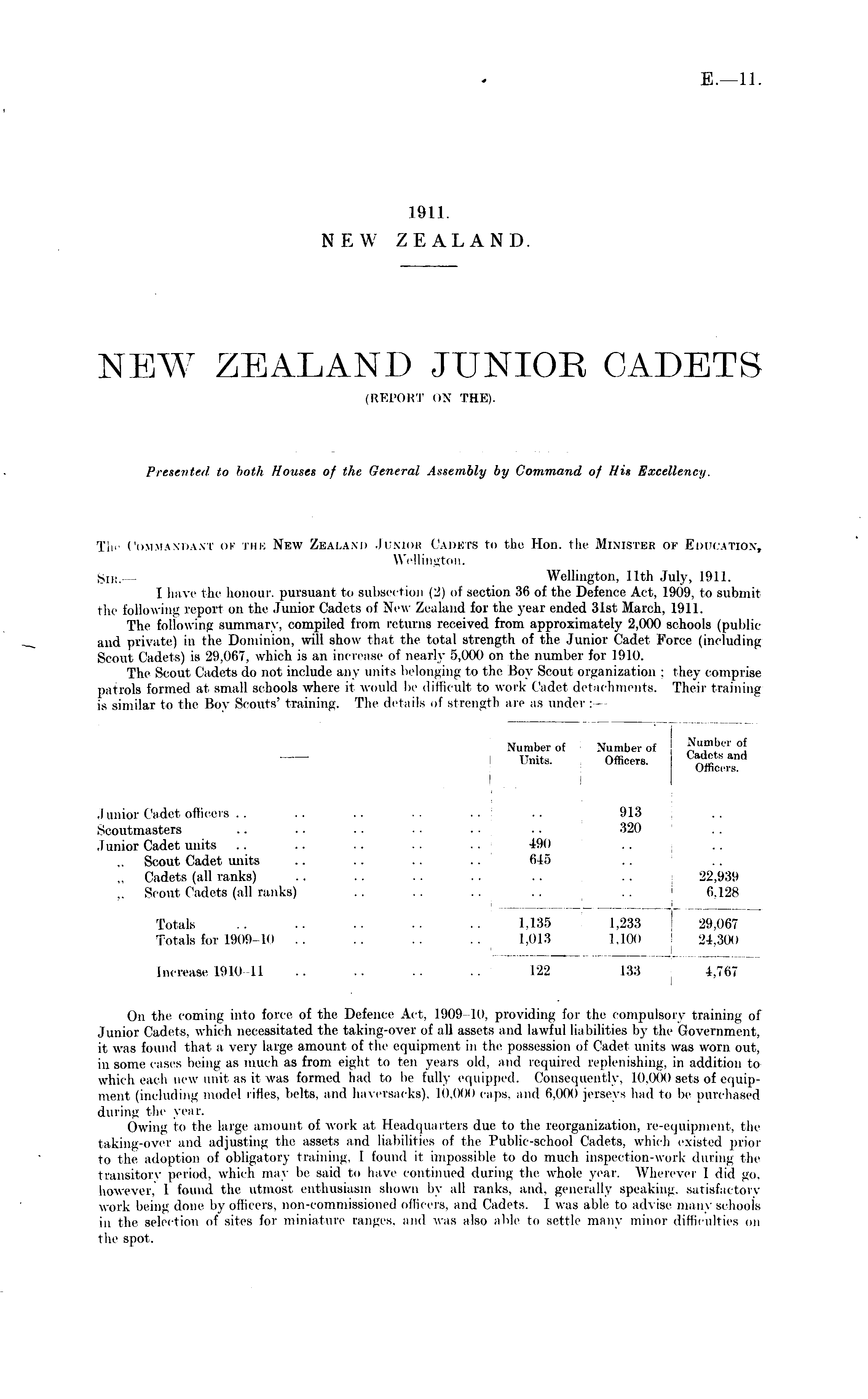 Tin Commandant of the Nh:\v Zealand Juniob Cadets to the Hon. the Minister of Education, Wellington. Sik, Wellington, 11th July, 1911. 1 have the honour, pursuant to subsection (2) of section 36 of the Defence Act, 1909, to submit the following repori on the Junior Cadets of New Zealand lor the year ended 31st March, 1911. The following summary, compiled from returns received from approximately 2,000 schools (public and private) in the Dominion, will show that the total strength of the Junior Cadet Force (including Seoul Cadets) is L'ii.OCiT. which is an increase of nearly 5,000 on the number for 1910. The Scout Cadets do not include any units belonging to the Boy Scout organization ; they comprise patrols formed at small schools where it would lie difficult to work Cadet detachments. Their training is similar to the Boy Scouts' training. The details of strength are as under : —