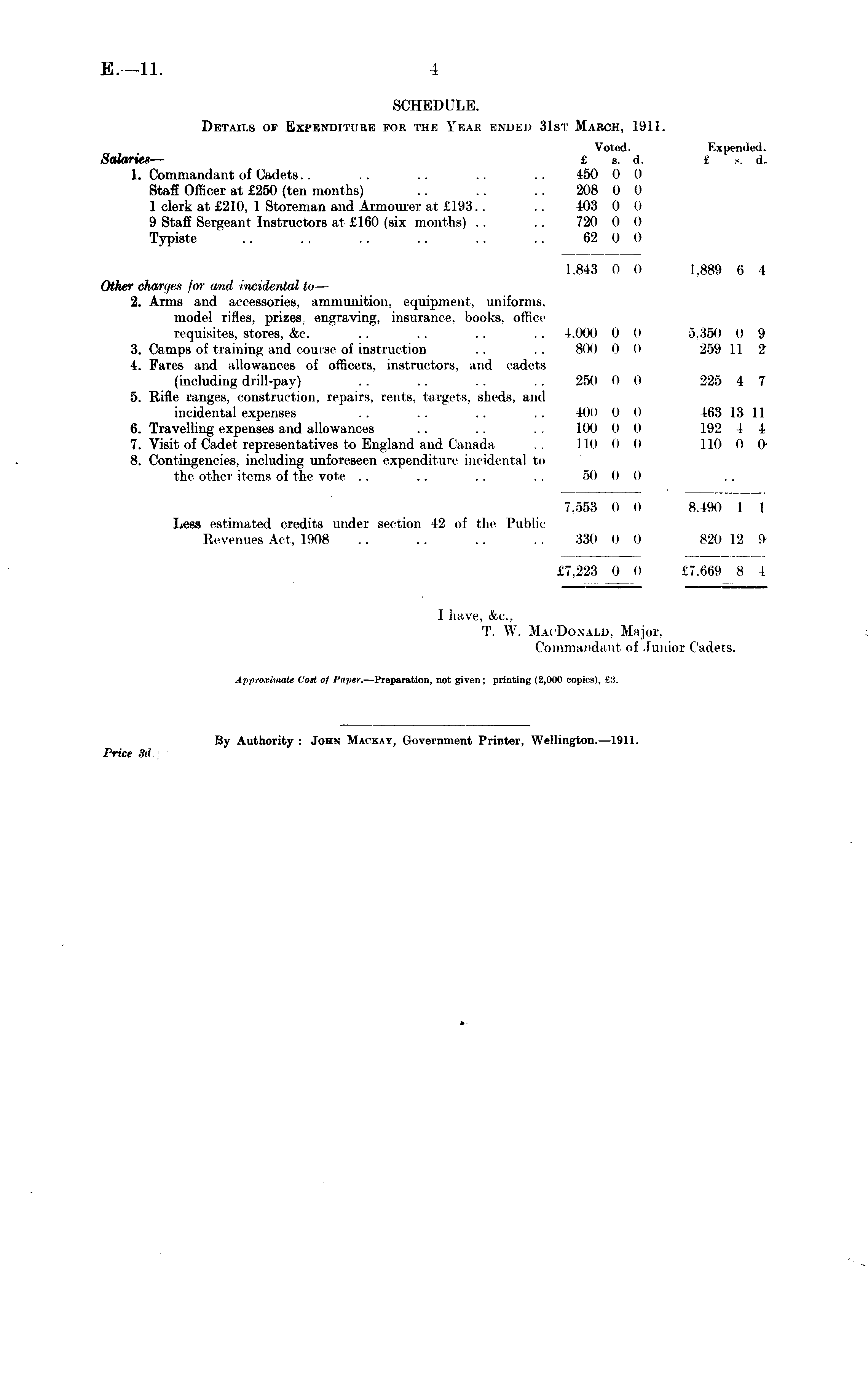 SCHEDULE. Details of Expenditure for the Year ended 31st March, 1911. Voted. Expended. Salaries . £s. d. £ -. d. 1. Commandant of Cadets.. .. .. .. .. 450 0 0 Stafi Officer at £250 (ten months) . . . . .. 208 0 0 1 clerk at £210, 1 Storeman and Armourer at £193.. .. 403 0 0 9 Staff Sergeant Instructors at £160 (six months) . . .. 720 0 0 Typiste .. .. .. .. .. .. 62 0 0 1.843 0 0 1.889 6 4 Other charges for and incidental to — 2. Arms and accessories, ammunition, equipment, uniforms, model rifles, prizes, engraving, insurance, books, office requisites, stores, &c. .. .. .. .. 4.000 0 0 5,360 (I 9 3. Camps of training and course of instruction .. .. 800 t> <• 259 11 2 4. Fares and allowances of officers, instructors, and cadets (including drill-pay) .. .. .. .. 250 0 0 225 4 7 5. Rifle ranges, construction, repairs, rents, targets, sheds, and incidental expenses .. .. .. .. 400 0 0 463 13 11 6. Travelling expenses and allowances .. .. .. 100 0 0 192 4 4 7. Visit of Cadet representatives to England and Canada .. 110 0 0 110 0 0' 8. Contingencies, including unforeseen expenditure incidental to the other items of the vote .. .. .. .. 50 0 0 7,653 0 0 8.490 1 1 Less estimated credits under section 12 of the Public Revenues Act. 1908 .. .. .. .. 330 0 0 820 12 9 £7,223 0 0 £7,669 8 I I have, &c, T. W. Mac Donald, Major, Commandant of Junior Cadets.