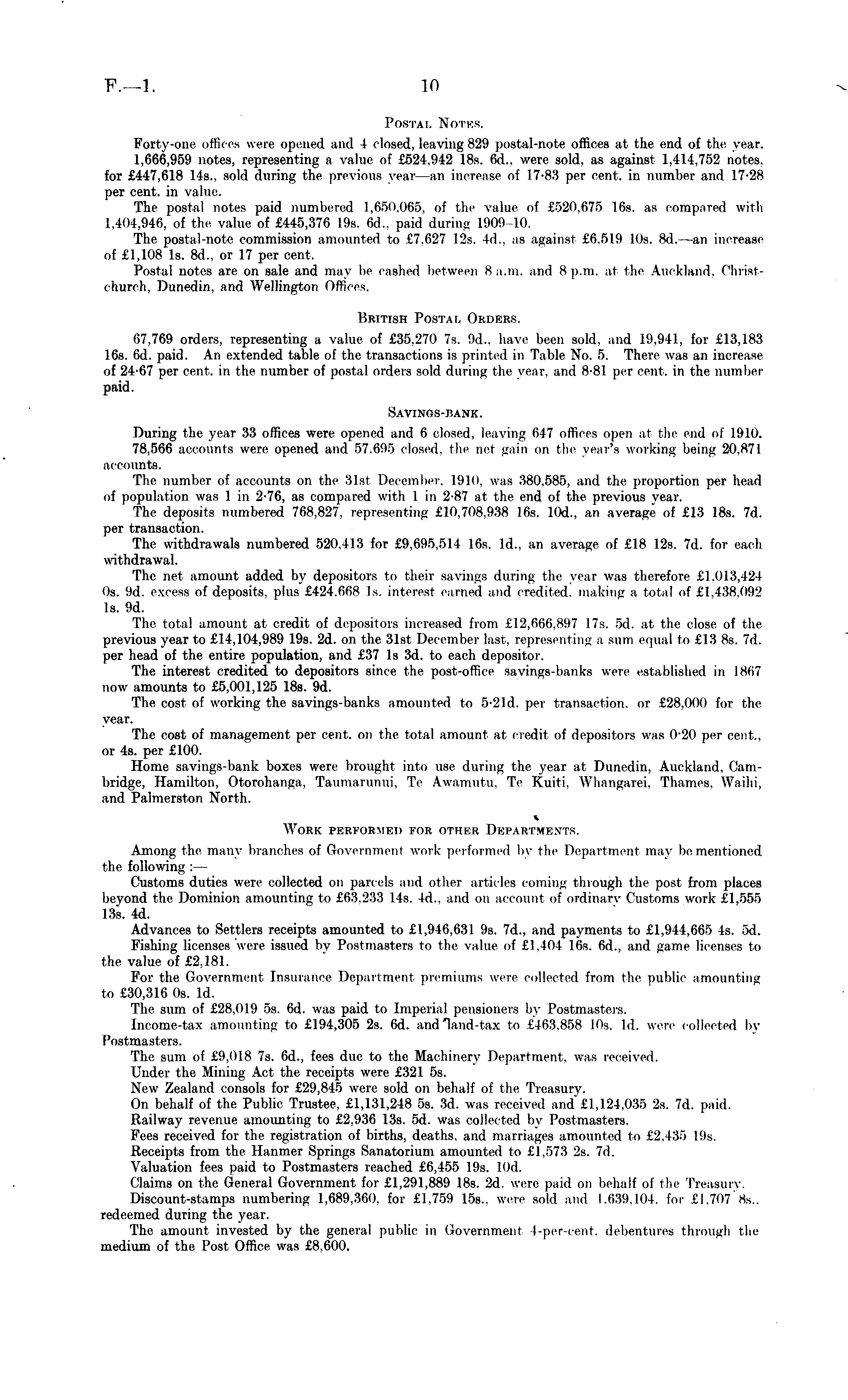 Postal Notes. Forty-one offices were opened and 1 closed, leavingB29 postal-note offices at the end of the year. 1,666,959 notes, representing a value of £524,942 18s. 6d.. were sold, as against 1,414,752 notes, for £447,618 145., sold during the previous year -an increase of 17-83 per cent, in number and 17-28 per cent, in value. The postal notes paid numbered 1,660,065, of the value of £520,675 His. as compared with 1.404,946, of the, value of £445,376 19s. 6d.. paid during 1909 10. The postal-note commission amounted to £7.627 12s. 4d.. as against £6.519 10s. 8d. —an increase of £1,108 Is. Bd., or 17 per cent. Postal notes are on sale and may be cashed between Ba.m. and Bp.m. at the Auckland. Christchurch, Dunedin. and Wellington Offices. British Postal Orders. 67,769 orders, representing a value of £35.270 7s. 9d.. have been sold, and 19.941, for £13,183 16s. 6d. paid. An extended table of the transactions is printed, in Table No. 5. There was an increase of 24-67 per cent, in the number of postal orders sold during the year, and 8-81 per cent, in the number paid. Savings-bank. During the year 33 offices were opened and 6 closed, leaving 647 offices open at the end of 1910. 78,566 accounts were opened and 57,695 closed, the net gain on the year's working being 20.871 accounts. The number of accounts on the 31st December. L9lO, was 380.585, and the proportion per head of population was 1 in 2-76, as compared with 1 in 2-87 at the end of the previous year. The deposits numbered 768,827. representing £10.708.938 16s. 10d.. an average of £13 18s. 7d. per transaction. The withdrawals numbered 520.413 for £9,695,51 I His. Id., an average of £18 12s. 7d. for each withdrawal. The net amount added by depositors to their savings during the year was therefore £1,013,424 os. 9d. excess of deposits, plus £424.668 Is. interest earned and credited, making a total of £1.438.092 Is. 9d. The, total amount at credit of depositors increased from £12,666,897 17s. sd. at the close of the previous year to £14,104,989 19s. 2d. on the 31st December last, representing a sum equal to £13 Bs. 7d. per head of the entire population, and £37 Is 3d. to each depositor. The interest credited to depositors since the post-office savings-banks were established in 18(17 now amounts to £5,001,125 18s. 9d. The cost of working the savings-banks amounted to 5-21 d. per transaction, or £28,000 lor the year. The cost of management per cent, on the total amount at credit of depositors was o*2o per cent., or 4s. per £100. Home savings-bank boxes were brought into use during the year at Dunedin, Auckland. Cam bridge, Hamilton, Otorohanga, Taumarunui, Te Awamutu, Te Kuiti, Whangarei, Thames. Waihi. and Palmerston North. Work performed for other Departments. Among the many branches of Government work performed by the Department may be mentioned the following : — Customs duties were collected on parcels and other articles coining through the post from places beyond the Dominion amounting to £63.233 1 Is. id., and on account of ordinary Customs work £1,555 13s. 4d. Advances to Settlers receipts amounted to £1,946,631 9s. 7d., and payments to £1,944,665 4s. sd. Fishing licenses were issued by Postmasters to the value of £1,404 16s. 6d., and game licenses to the value of £2,181. For the Government Insurance Department premium'- were collected from the public amounting to £30,316 os. Id. The sum of £28,019 ss. 6d. was paid to Imperial pensioners by Postmasters. Income-tax amounting to £194,305 2s. 6d. and land-tax to £163.858 10s. Id. were collected by Postmasters. The sum of £9.018 7s. 6d., fees due to the Machinery Department, was received. Under the Mining Act the receipts were £321 ss. New Zealand consols for £29,845 were sold on behalf of the Treasury. On behalf of the Public Trustee. £1,131,248 ss. 3d. was received and' £1,124,035 2s. 7d. paid. Railway revenue amounting to £2,936 13s. sd. was collected by Postmasters. Fees received for the registration of births, deaths, and marriages amounted to £2,435 IDs. Receipts from the llanmer Springs Sanatorium amounted to £1,573 2s. 7d. Valuation fees paid to Postmasters reached £6,455 19s. lOd. Claims on the General Government for £1,291,889 18s. 2d. were paid on behalf of the Treasury. Discount-stamps numbering 1.689.360. for £1.759 155.. were sold and 1,639,104, for £!.70785.. redeemed during the year. The amount invested by the general public in Government l-per-cent. debentures through the medium of the Post Office was £8,600.
