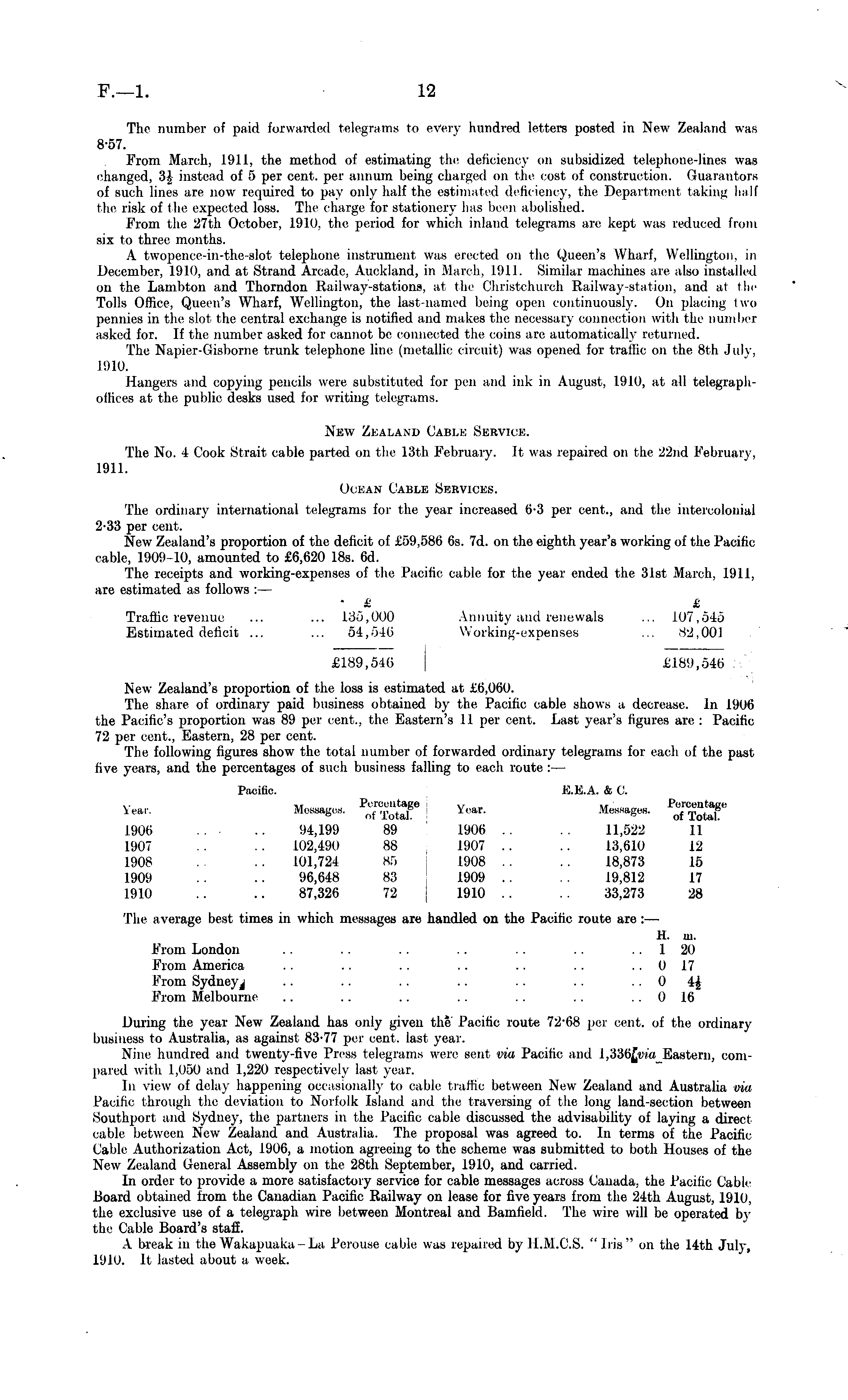 The number of paid forwarded telegrams to every hundred letters posted in New Zealand was 8-57. From March, 1911, the method of estimating the deficiency on subsidized telephone-lines was changed, 3£ instead of 5 per cent, per annum being charged on the cost of construction. Guarantors of such lines are now required to pay only half the estimated deficiency, the, Department taking half the risk of the expected loss. The charge for stationery has been abolished. From the 27th October, 1910, the period for which inland telegrams are kept was reduced from six to three months. A twopence-in-the-slot telephone instrument was erected on the Queen's Wharf, Wellington, in December, 1910, and at Strand Arcade, Auckland, in March, 1911. Similar machines are also installed on the. Lambton and Thorndon Railway-stations, at the Christchurch Railway-station, and at the Tolls Office, Queen's Wharf, Wellington, the last-named being open continuously. On placing two pennies in the slot the central exchange is notified and makes the necessary connection with the number asked for. If the number asked for cannot be connected the coins are automatically returned. The Napier-Gisborne trunk telephone line (metallic circuit) was opened for traffic on the Bth July, 1910. Hangers and copying pencils were substituted for pen and ink in August, 1910, at all telegraphoffices at the public desks used for writing telegrams. New Zealand Cable Service. The No. 4 Cook Strait cable parted on the 13th February. It was repaired on the 22nd February, 1911. Ocean Cable Services. The ordinary international telegrams for the year increased 6-3 per cent., and the intercolonial 2-33 per cent. New Zealand's proportion of the deficit of £59,586 6s. 7d. on the eighth year's working of the Pacific cable, 1909-10, amounted to £6,620 18s. 6d. The receipts and working-expenses of the Pacific cable for the year ended the 31st March, 1911, are estimated as follows : — • £ £ Traffic revenue ... ... 135,000 Annuity and renewals ... 107,545 Estimated deficit ... ... 54,540 Working-expenses ... 82,001 £189,546 £189,546 ;-."•' New Zealand's proportion of the loss is estimated at £6,060. The share of ordinary paid business obtained by the. Pacific cable shows a decrease. In 1906 the Pacific's proportion was 89 per cent., the Eastern's 11 per cent. Last year's figures are : Pacific 72 per cent., Eastern, 28 per cent. The following figures show the total number of forwarded ordinary telegrams lor each of the past five years, and the percentages of such business falling to each route : — Pacific. X.X.A. & V. Usages. ft-gjH Year. Messa.es. *$%%' 1906 .. 94,199 89 1906 .. .. 11,522 11 1907 .. .. 102,490 88 1907 .. .. 13,610 12 1908 .. 101,724 85 1908 .. .. 18,873 15 1909 .. .. 96,648 83 1909 .. 19,812 17 1910 .. .. 87,326 72 1910 .. 33,273 28 The average best times in which messages are handled on the Pacific route are : — H. in. From London .. . . .. .. 1 20 From America .. .. .. .. .. 0 17 From Sydneyj .. .. .. .. .. .. 0 44, From Melbourne .. .. .. .. .. .. 0 16 During the year New Zealand has only given the Pacific route 72-68 per cent, of the ordinary business to Australia, as against 83-77 per cent, last year. Nine hundred and twenty-five Press telegrams were sent via Pacific and i,336£wa Eastern, coin pa ied with 1,050 and 1,220 respectively last year. In view of delay happening occasionally to cable traffic between New Zealand and Australia via Pacific through the deviation to Norfolk Island and the traversing of the long land-section between Southport and Sydney, the partners in the Pacific cable discussed the advisability of laying a direct cable, between New Zealand and Australia. The proposal was agreed to. In terms of the Pacific Cable Authorization Act, 1906, a motion agreeing to the scheme was submitted to both Houses of the New Zealand General Assembly on the 28th September, 1910, and carried. In order to provide a more satisfactory service for cable messages across Canada, the Pacific Cable Board obtained from the Canadian Pacific Railway on lease for five years from the 24th August, 1910, the exclusive use of a telegraph wire between Montreal and Bainfield. The wire will be operated by the Cable Board's staff. A break in the Wakapuaka-La Perouse cable was repaired by H.M.C.S. " Iris" on the 14th July, 1910. It lasted about a week.