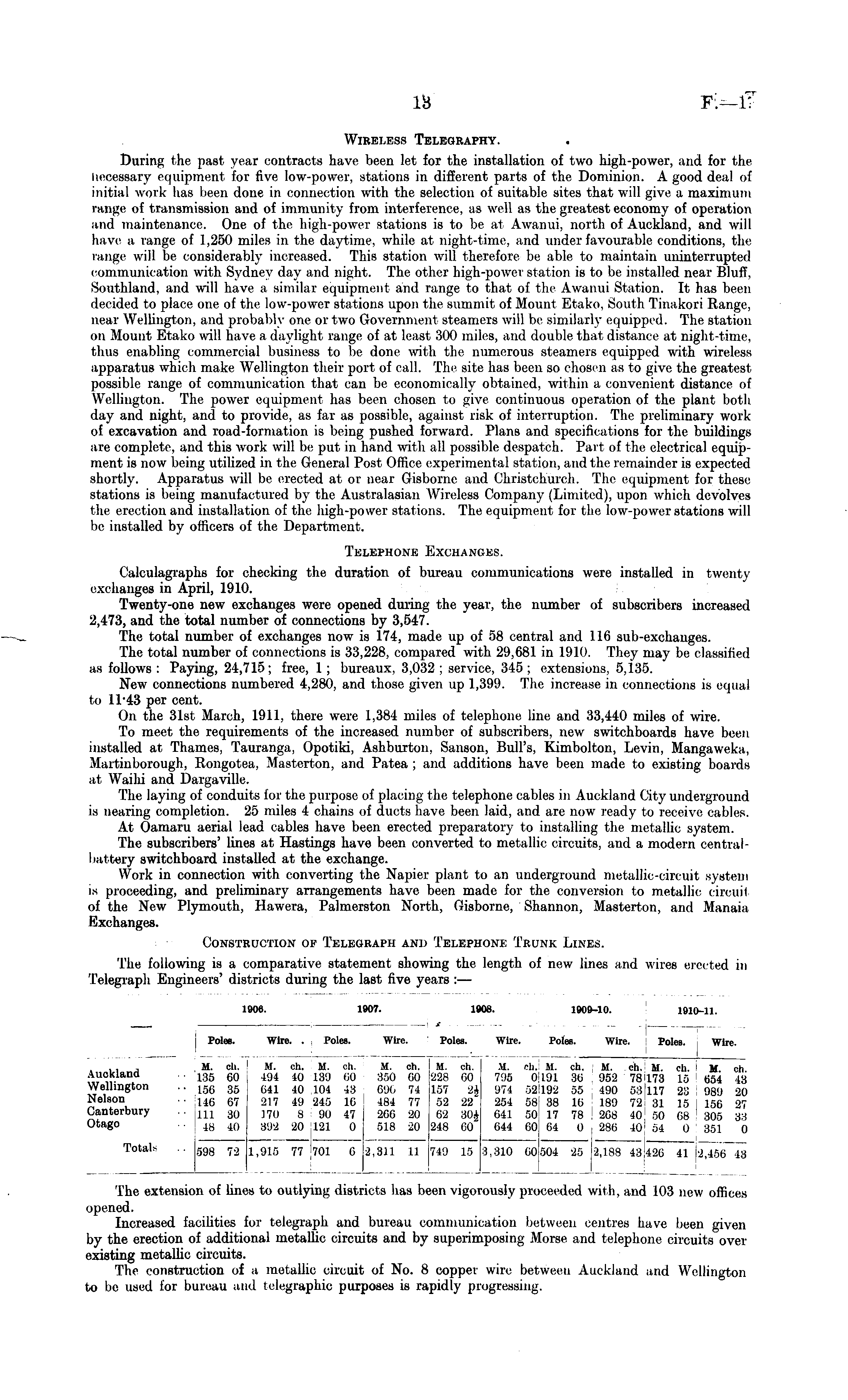Wireless Telegraphy. . During the past year contracts have been let for the installation of two high-power, and for the necessary equipment for five low-power, stations in different parts of the Dominion. A good deal of initial work lias been done in connection with the selection of suitable sites that will give a maximum range of transmission and of immunity from interference, as well as the greatest economy of operation and maintenance. One of the high-power stations is to be at Awanui, north of Auckland, and will have a range of 1,250 miles in the daytime, while at night-time, and under favourable conditions, the range will be considerably increased. This station will therefore, be able to maintain uninterrupted communication with Sydney day and night. The other high-powei , station is to be installed near Bluff. •Southland, and will have a similar equipment and range to that of the Awanui Station. It has been decided to place one of the low-power stations upon the summit of Mouin Etako, South Tinakori Range, near Wellington, and probably one or two Government steamers will be similarly equipped. The station mi Mount Etako will have a daylight range of at least 300 miles, and double that distance at night-time, thus enabling commercial business to be done with the numerous steamers equipped with wireless apparatus which make Wellington their port of call. The site has been so chosen as to give the greatest possible range of communication that can be economically obtained, within a convenient distance of Wellington. The power equipment has been chosen to give continuous operation of the plant both day and night, and to provide, as far as possible, against risk of interruption. The preliminary work of excavation and road-formation is being pushed forward. Plans and specifications for the buildings are complete, and this work will be put in hand with all possible despatch. Part of the electrical equipment is now being utilized in the General Post Office experimental station, and the remainder is expected shortly. Apparatus will be ejected at or near Gisborne and Christchurch. The equipment for these stations is being manufactured by the Australasian Wireless Company (Limited), upon which devolves the erection and installation of the high-power stations. The equipment for the low-power stations will be installed by officers of the Department. Telephone Exchanges. Calculagraphs for checking the duration of bureau communications were installed in twenty exchangee in April, 1910. Twenty-one new exchanges were opened during the year, the number of subscribers increased 2,473, and the total number of connections by 3,547. The total number of exchanges now is 174, made up of 58 central and 116 sub-exchanges. The total number of connections is 33,228, compared with 29,681 in 1910. They may be classified as follows : Paying, 24,715 ; free, 1; bureaux, 3,032 ; service, 345 ; extensions, 5,135. New connections numbered 4,280, and those given up 1,399. The increase in connections is equal to 11*43 per cent. On the 31st March, 1911, there were 1,384 miles of telephone line and 33,440 miles of wire. To meet the requirements of the increased number of subscribers, new switchboards have been installed at Thames, Tauranga, Opotiki, Ashburton, Sanson, Bull's, Kimbolton, Levin, Mangaweka, Martin borough, Rongotea, Masterton, and Patea ; and additions have been made to existing boards at Wai hi and Dargaville. The laying of conduits for the purpose of placing the telephone cables in Auckland City underground is Hearing completion. 25 miles 4 chains of ducts have been laid, and are now ready to receive cables. At Oamaru aerial lead cables have been erected preparatory to installing the metallic system. The subscribers' lines at Hastings have been converted to metallic circuits, and a modern centralbattery switchboard installed at the exchange. work in connection with converting the Napier plant to an underground metallic-circuit system is proceeding, and preliminary arrangements have been made for the conversion to metallic circuit of the New Plymouth, Hawera, Palmerston North, Gisborne, Shannon, Masterton, and Manaia Exchanges. Construction op Telegraph and Telephone Trunk Lines. The following is a comparative statement showing the length of new lines and wires erected in Telegraph Engineers' districts during the last five years : —