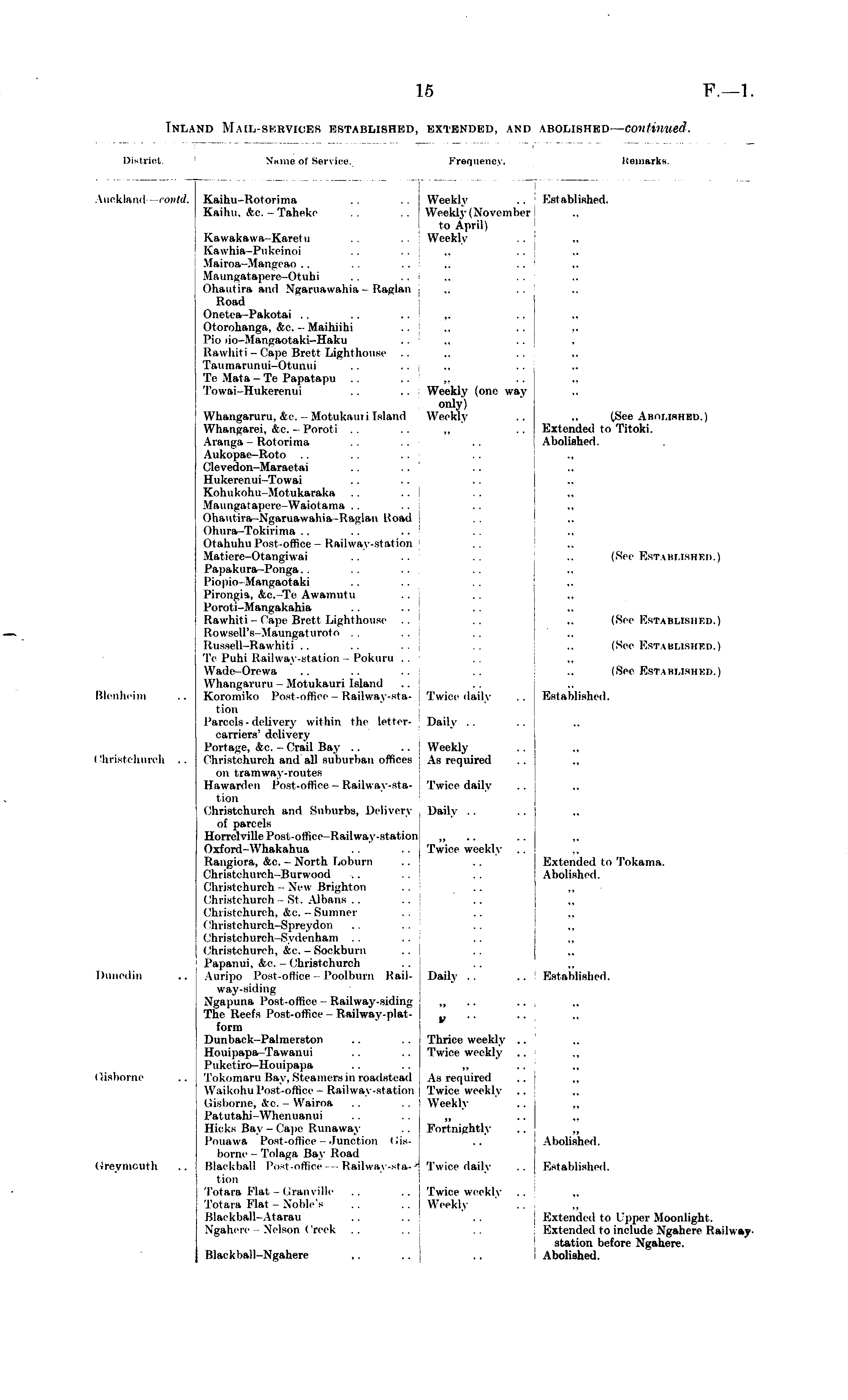 DlBtrlol \iiiiH- ol Service. Frequency. Remarks. Auckland contd. Kaihu-Rotorima .. .. Weckl\ Kaihu. So. - Tahrke .. .. Weekly (November to April) Kawakawa-Karcl u .. . . Weekly Kawhia-Pukeinoi Mairoa—Mangeao .. .. .. ,. Maungatapere—Otuhi Ohaiitira and Ngaruawahia - Raglan Road Onetea-Pakotai .. . . .. „ Otorohanga, &e. - Maihiihi .. Pio >io-Mangaotaki-Haku Rawhiti-Cape Brett Lighthouse Taiimariinui-Otumii .. .. j Tc Mata-Te Papatapu .. Towai-Hukerenui .. . . Weekly (one way only) Whangaruru, &c.-Motukauii Island Weekly Whangarei, &e. - Poroti .. .. ,, Aranga - Rotorima Aukopae-Roto Clevedon-Maraetai Qukerenui—Towai Kohukohu-Motukaraka Maungataperc-Waiotama .. Ohautira-Ngaruawahia-Rajrlini Road Ohura— Tokirima .. Otahuhu Post-office - Railway-atat ion Matiere—Otangiwai Papakura-Ponga.. Piopio .MaiiL'iiotaki Pirongia, &o. Te Awamutu Porot i-Mangakahia Rawhiti - Cape Brett Lighthouse RowseU's-Maungaturoto .. Russell—Rawhiti .. Te Puhi Railway-station Pokuru .. Wade—Orewa Whangaruru - Motuiauri Island Koromiko Poat-offloe - Railway-eta- j Twice daily tion 1'areels- delivery within the Letter- Daily .. carriers' delivery Portage, to. Crail Bay .. .. Weekly Christ church and all suburban offices As required on tramway-routes Hawardcn Poet-office — Railway-eta- Twice daily tion Christohuroh and Suburbs, Delivery Daily .. of parcels HorrelvillePost-offioe Railway-station ,, OxfoT'd-Whakahua . . .. Twice weekly Rangiora, to. — North Loburn .. Christohurch—Burwood Christchiirch - New Brighton Christchuroh St. Albans .. Christohurch, <feo. - Sumner Christchurch—Spreydon (.'hristchiirch-Sydeiihain Christchiirch. &O. - Soekbuni Papanui, &e. — ('hristchurch Auripo Post-offioe Poolbum Rail- Daily .. way-siding Ngapuna Post-offioe - Railway-siding ,, The Reefs Post-office - Railway-plat- i> •• form Dunbaek-Palmerston .. .. I Thrice weekly .. Houipapa-Tawaiuii .. .. Twice weekly Puketiro-Houipapa .. .. ,, Tokomaru Bay, Steamers in roadstead As required WaikohuPost-offioe Railway-station Twice weekly Gieborne, &c. W'airoa .. .. Weekly Patutahi—Whenuanui .. .. „ Hicks Ua\ -Cape Runaway .. Fortnightly Pouawa Post-offioe Junotion (iisborne Tolaga Bay Road Blackball Post-offioe -Railway-eta- 9 Twice daily tion Totara Flat -Granville .. .. Twice weekly Totara Flat - Noble's .. .. Weekly Blackball-Atarau .. .. Ngahere Nelson Creek Kstablished. (See Abolished.) Extended to Titoki. Abolished. (Sec Established.) (See Established.) (Sec ESTABLISHED.) (See Established.) Blenheim Kstablished. Chrintchurch Extended to Tokama. Abolished. • • )unedin Established. lisborae Sreyniouth Abolished. Kstablished. Extended to Upper Moonlight. Extended to include Ngahere Railway station before Ngahere. Abolished. Blackball-Ngahere