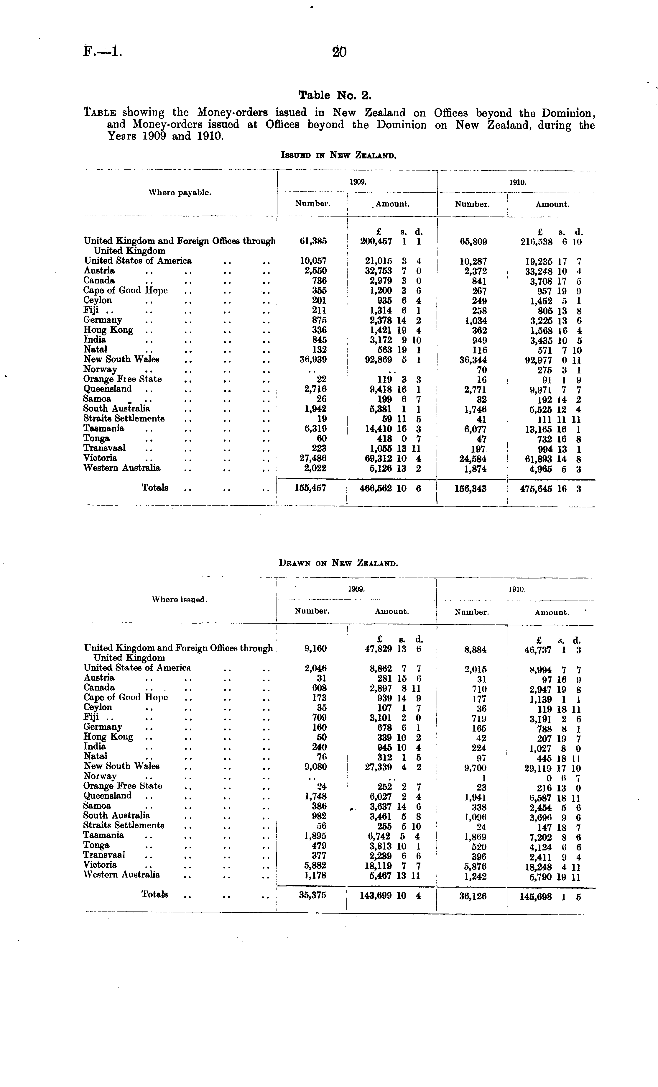 Table No. 2. Table showing the Money-orders issued in New Zealand on Offices beyond the Dominion, and Money-orders issued at Offices beyond the Dominion on New Zealand, during the Years 1909 and 1910.