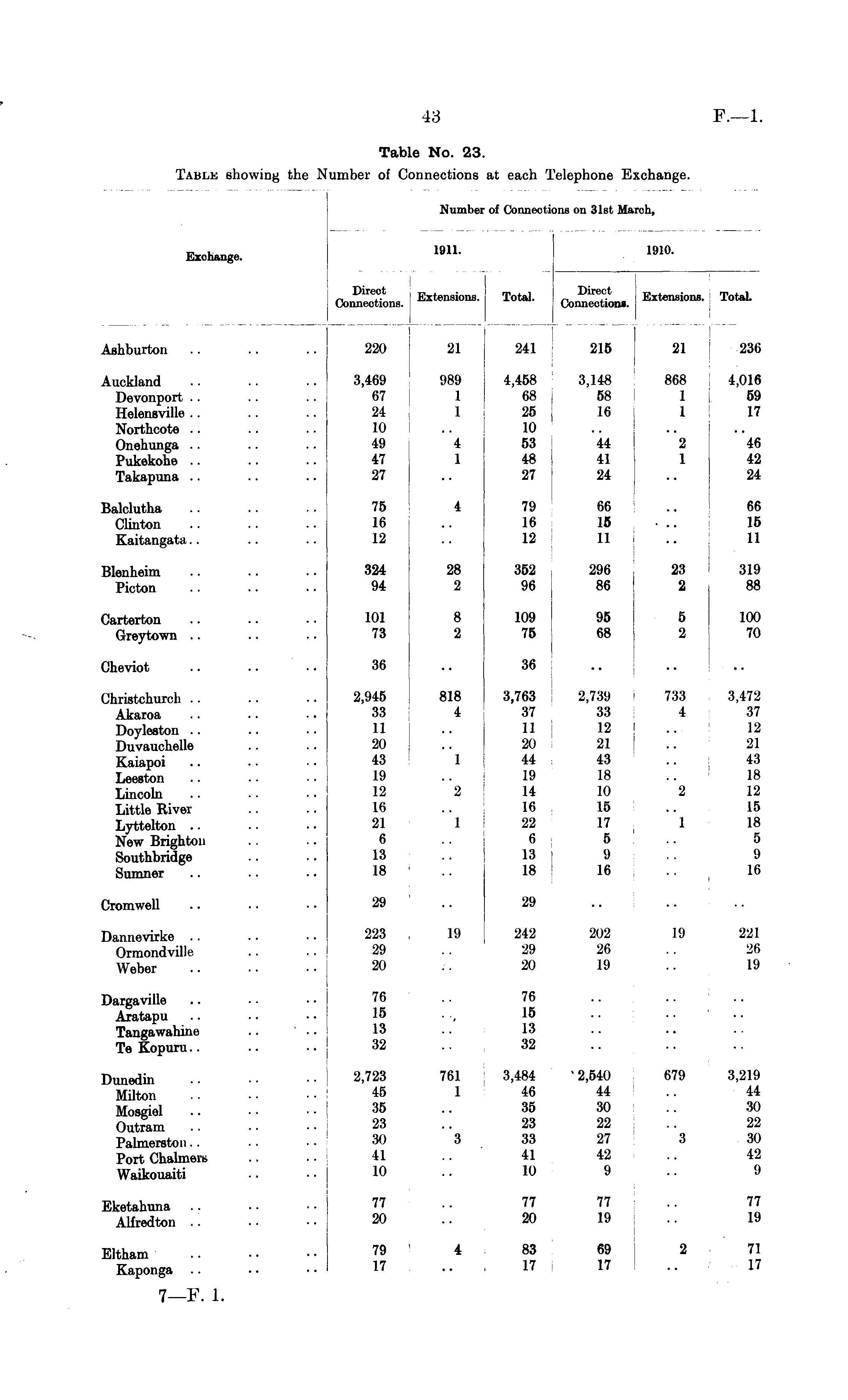 Number of Connectioi >ns on 31st Ma ins on 31st March, rch, 1911. 1910. 1910. Exchange. Direot Connections. Extensions. Total. Direct Connection!. Extensions. Total. I I Lehburton 220 21 241 216 21 236 Auckland Devonport Helensville Northcote Onehunga Pukekohe Takapuna .. 3,469 67 24 10 49 47 27 989 4,458 1 68 j 1 25 10 4 53 1 48 27 3,148 58 16 44 41 24 868 1 1 "2 1 4,016 59 17 46 42 24 Jalclutha Clinton Kaitangatii.. 75 16 12 4 79 16 12 66 15 11 66 15 11 Jlenheim Picton 324 94 28 352 2 96 296 86 23 2 319 88 )arterton Greytown .. 101 73 8 109 2 75 95 68 5 2 100 70 /heviot 36 36 • ■ }hristchurch Akaroa Doyleston Duvauchelle Kaiapoi Leeston Lincoln Little Kiver Lyttelton New Brighton Southbridge Sumner 2,945 33 11 20 43 19 12 16 21 6 13 18 818 3,763 4 37 11 20 1 44 19 2 14 16 1 22 6 13 18 2,739 33 12 21 43 18 10 15 17 5 9 16 733 4 2 "l 3,472 37 12 21 43 18 12 15 18 5 9 16 I I /romwell 29 29 )annevirke Ormondville Weber 223 29 20 19 242 29 20 202 26 19 19 221 26 19 )argaville Aratapu Tangawahine Tβ Kopuru.. 76 15 13 32 76 15 13 32 )unedin Milton Mosgiel Outram Palmerston Port Chalmers Waikouaiti 2,723 45 35 23 30 41 10 761 3,484 1 46 35 23 3 33 41 10 1 2,540 44 30 22 27 42 9 679 3 3,219 44 30 22 30 42 9 Sketahuna Alfredton .. 77 20 77 20 77 19 77 19 Sltham Kaponga .. 79 17 4 83 17 69 17 2 71 17
