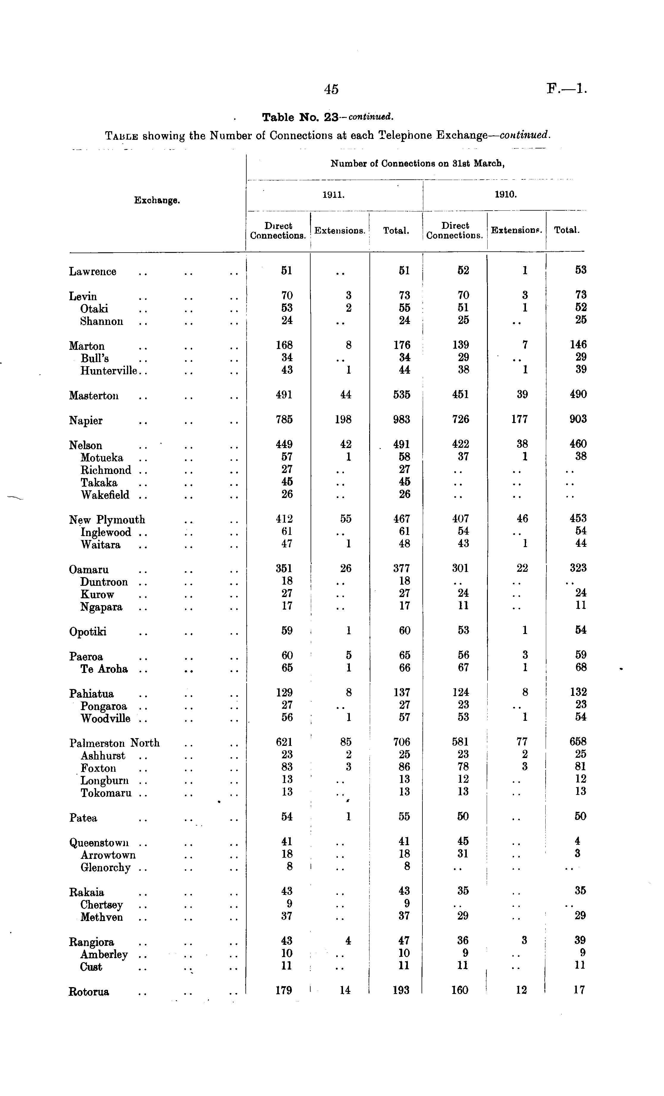 Number of Connections on 31st March, Exchange. 1911. 1910. Direct Connections. Extensions. Total. L Dire Extension*. Connections. Total. Lawrence 51 51 52 1 53 53 Levin Otaki .Shannon 70 53 24 3 2 73 55 24 70 51 25 3 1 73 52 25 73 52 25 Marton Bull's Hunterville.. 168 34 43 8 1 176 34 44 139 29 38 7 1 146 29 39 146 29 39 Masterton 491 44 535 451 39 490 490 Napier 785 198 983 726 177 903 903 Nelson Motueka Richmond .. Takaka Wakefield .. 449 57 27 45 26 42 1 491 58 27 45 26 422 37 38 1 460 38 460 38 New Plymouth Inglewood .. Waitara 412 61 47 55 1 467 61 48 407 54 43 46 1 453 54 44 453 54 44 Oamaru Duntroon .. Kurow Ngapara 351 18 27 17 26 :i77 18 27 17 301 24 11 22 323 "24 11 323 24 11 Opotiki 59 1 60 53 1 54 54 Paeroa Tβ Aroha .. 60 65 5 1 65 66 56 67 3 1 59 68 59 68 Pahiatua Pongaroa .. Woodville .. 129 27 56 8 1 137 27 57 124 23 53 8 1 132 23 54 132 23 54 Palmerston North Ashhurst .. Foxton Loiigburn .. Tokomaru .. 621 23 83 13 13 85 2 3 706 25 86 13 13 581 23 78 12 13 77 2 3 658 25 81 12 13 658 25 81 12 13 • Patea 54 1 55 50 50 Queenstown .. Arrowtown Glenorchy .. 41 18 8 41 18 8 45 31 4 3 Rakaia Chertsey Methven 43 9 37 43 9 37 35 29 35 29 Rangiora Amberley .. Oust 43 10 11 4 47 10 11 193 36 9 11 160 3 12 39 9 11 17 Rotorua 179 14