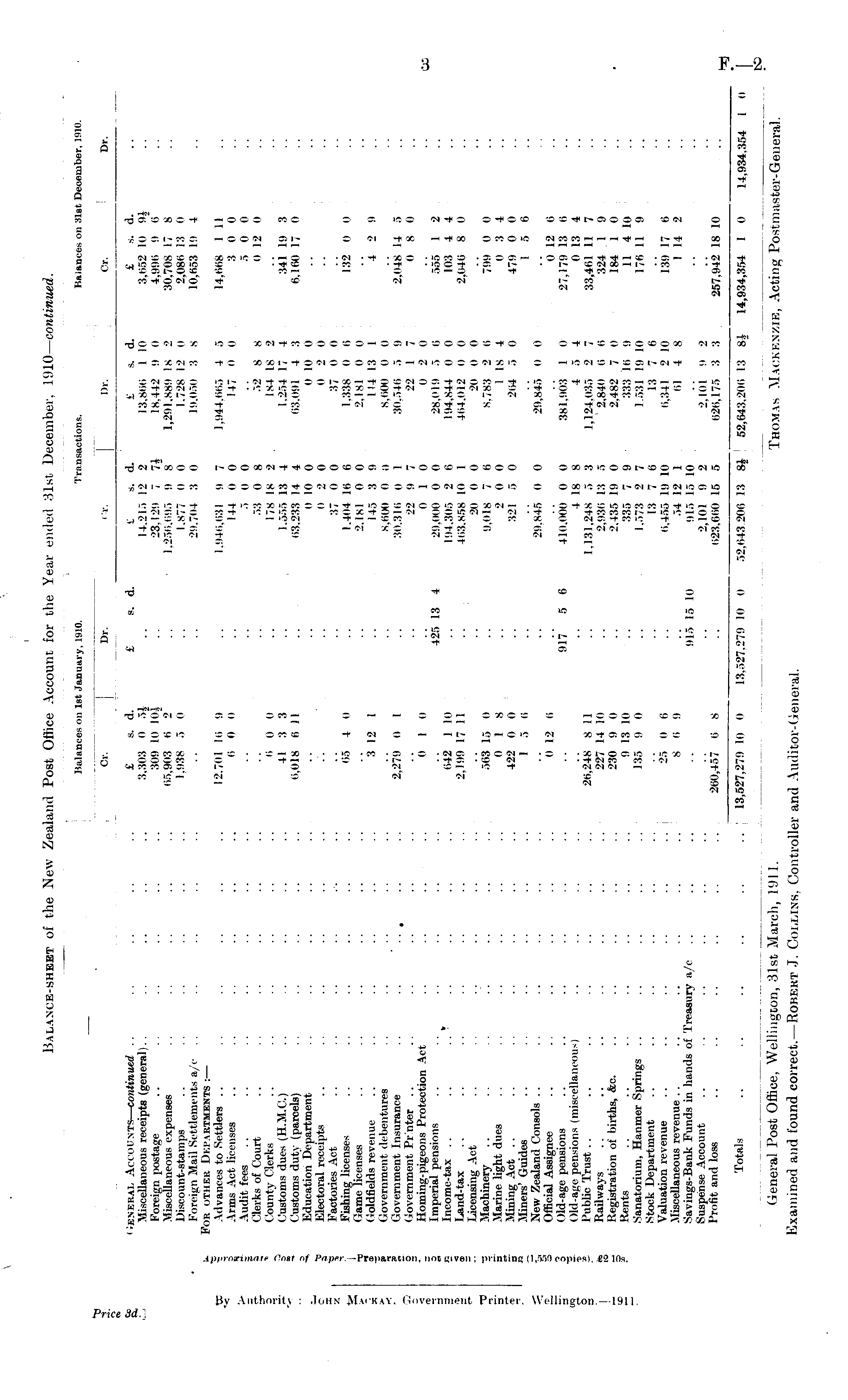 General Post Office, Wellington, 31st March, l.M 1. Thomas Mackenzie, Acting Postmaster-General. Examined and found correct.— Robert J. Collins, Controller and Auditor-General.