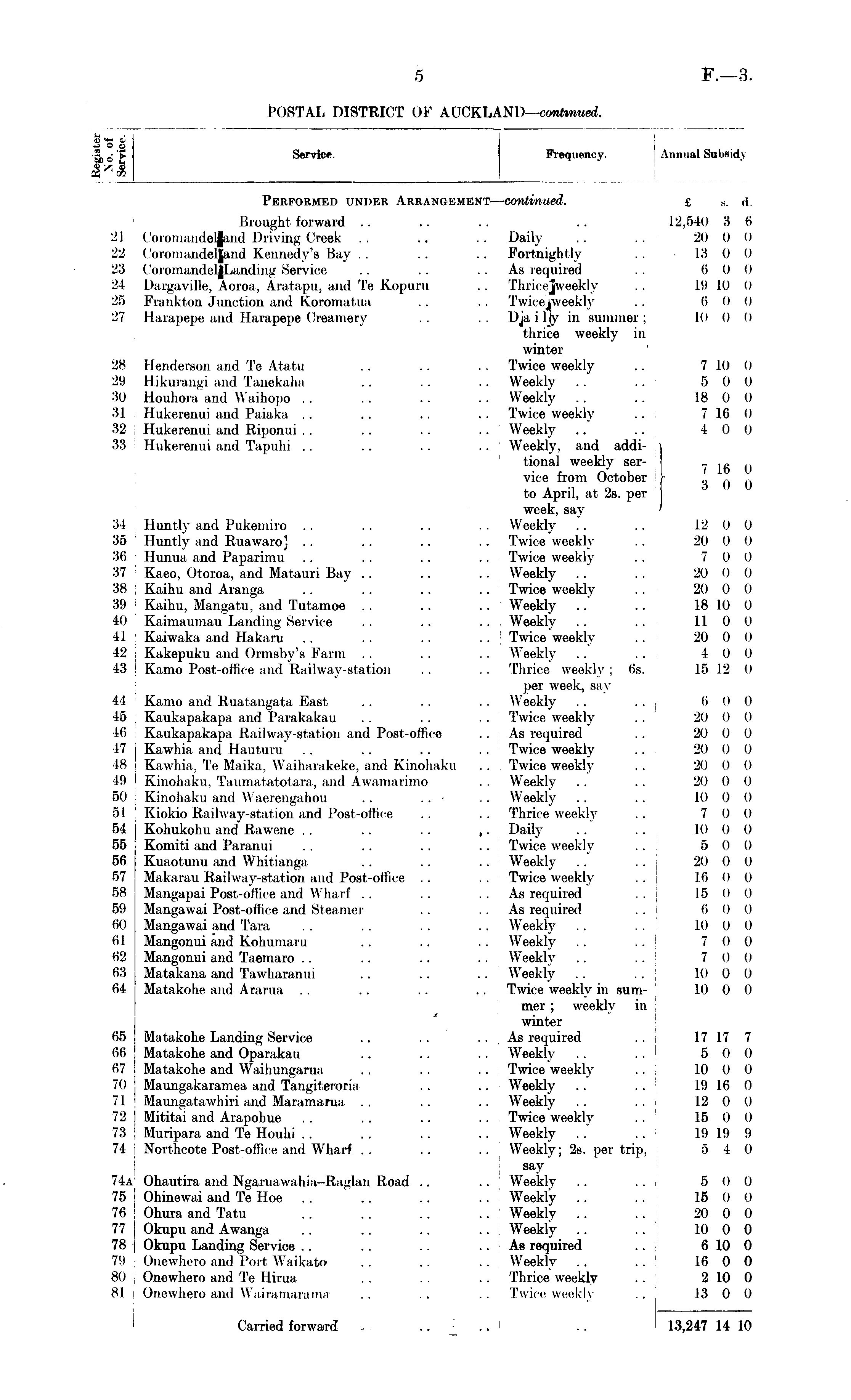 .1*1 boo £ '£ Service. Frequency. Annual Subsidy '* Service. Performed under Arrangement— continued. £ a. <I Brought forward .. .. .. .. 12,540 3 6 21 Coromandelland Driving Creek .. .. .. Daily .. .. 20 0 o 22 Coromandeljand Kennedy's Bay .. .. .. Fortnightly .. 13 0 0 23 CoiomandellLanding Service .. .. .. As required .. 6 0 0 24 Dargaville, Aoroa, Aratapu, and Tβ Kopuru .. ThriceJweekly .. 19 10 0 25 Frankton Junction and Koromatua .. .. Twiceiweekly .. 6 0 0 27 Harapepe and Harapepe Creamery .. .. Djailly in summer; 10 0 0 thrice weekly in winter 28 Henderson and Te Atatu . . . . .. Twice weekly .. 7 10 0 29 Hikurangi and Tanekaha .. .. .. Weekly .. .. 5 d <> ■■10 Eouhora and Waihopo . . .. .. . . Weekly .. .. 18 0 0 31 Hukerenui and Paiaka .. .. .. .. Twice weekly .. 7 16 0 32 Hukerenui and Riponui . . .. . . .. Weekly .. .. 4 0 0 33 Hukerenui and Tapuhi .. .. .. .. Weekly, and additional weekly ser- _ .„ vice from October „ A ., to April, at 2s. per week, say 34 Huntly and Pukemiro .. .. .. .. Weekly .. .. 12 0 0 •35 Huntly and Ruawaro] .. .. .. . . Twice weekly .. 20 0 0 36 Hunua and Paparimu .. .. .. .. Twice weekly .. 7 0 0 37 Kaeo, Otoroa, and Matauri Hay .. .. .. Weekly .. .. 20 0 0 38 Kaihu and Aranga .. .. .. . . Twice weekly . . 20 0 0 39 Kaihu, Mangatu, and Tutamoe .. .. .. Weekly .. .. 18 10 0 40 Kaimaumau Landing Service .. .. .. Weekly .. .. 110 0 41 Kaiwaka and Hakaru .. .. .. .. Twice weekly .. 20 0 0 12 Kakepuku and Ormsby's Farm . . .. . . Weekly .. . . 10 0 13 Kamo Post-office and Railway-station .. . . Thrice weekly ; (5s. 15 12 0 per week, say II Ktiino and Ruatangata East .. .. .. Weekly .. .. (i 0 0 45 Kaukapakapa and Parakakau .. .. . . Twice weekly .. 20 0 0 46 Kaukapakapa Railway-station and Post-office .. As required .. 20 0 0 47 Kawhia and Hauturu .. .. .. . . Twice weekly .. 20 0 0 48 Kawhia, Te Maika, Waiharakeke, and Kinohaku .. Twiceweekly .. 20 0 0 49 I Kinohaku, Taumatatotara, and Awamarimo .. Weekly .. .. 20 0 0 50 J Kinohaku and Waerengahou .. .. • .. Weekly .. .. 10 0 0 r>1 KioMo Railway-station and Post-office .. ■• Thrice weekly .. 7 0 0 54 Kohukohu and Rawene .. .. . . ,. Daily . . . . 10 0 0 55 Komiti and Paranui .. .. .. .. Twice weekly .. 5 0 0 56 Kuaotunu and Whitianga .. .. . . Weekly .. .. 20 0 0 57 Makarau Railway-station and Post-office . . . . Twice weekly . . 16 0 0 58 Mangapai Post-office and Wharf .. .. .. As required .. 15 (> o 59 Mangawai Post-office and Steamer .. As required .. 6 0 0 60 Mangawai and Tara .. .. .. .. Weekly .. .. I 10 0 0 61 Mangonui and Kohumaru .. .. . . Weekly .. .. I 7 0 0 62 Mangonui and Taemaro .. .. .. .. Weekly .. .. I 7 0 0 63 Matakana and Tawliaranui .. .. .. Weekly . . .. 10 0 0 64 Matakohe and Ararua . . .. .. .. Twice weekly in sum- 10 0 0 mer; weekly in winter 65 j Matakohe Landing Service .. .. .. As required .. 17 17 7 66 Matakohe and Oparakau .. .. . . Weekly .. . . I 5 0 0 67 Matakohe and Waihungarus .. .. .. Twice weekly .. 10 0 0 70 j Maungakaramea and Tangiteroria .. .. Weekly .. .. 19 16 0 71 ] Maungatawhiri and Maramarua .. .. .. Weekly .. .. j 12 0 0 72 Mititai and Arapohue .. .. .. .. Twice weekly .. '' 15 0 0 73 Muripara and Te Houhi . . . . . . . . Weekly . . .. I 19 19 9 74 j Northcote Post-office and Wharf .. .. .. Weekly; 2s. per trip, ; 5 4 0 say 74a Ohautira and Ngaruawahia-Raglan Road .. .. Weekly .. .. j 5 0 0 75 j Ohinewai and Te Hoe .. .. .. .. Weekly .. .. 15 0 0 76 : Ohura and Tatu .. .. .. .. Weekly .. .. 20 0 0 77 j Okupu and Awanga .. .. .. .. Weekly .. .. 10 0 0 78 I Okupu Landing Service .. .. .. .. | As required .. 6 10 0 79 Onewhero and Port Waikato .. .. .. Weekly .. .. 16 0 0 80 J Onewhero and Te Hirua .. .. .. Thrice weekly •• 2 10 0 81 i Onewhero and Wairamarama .. .. .. Twice weekly .. 13 0 0 Carried forward .. .... .. 13,247 14 10
