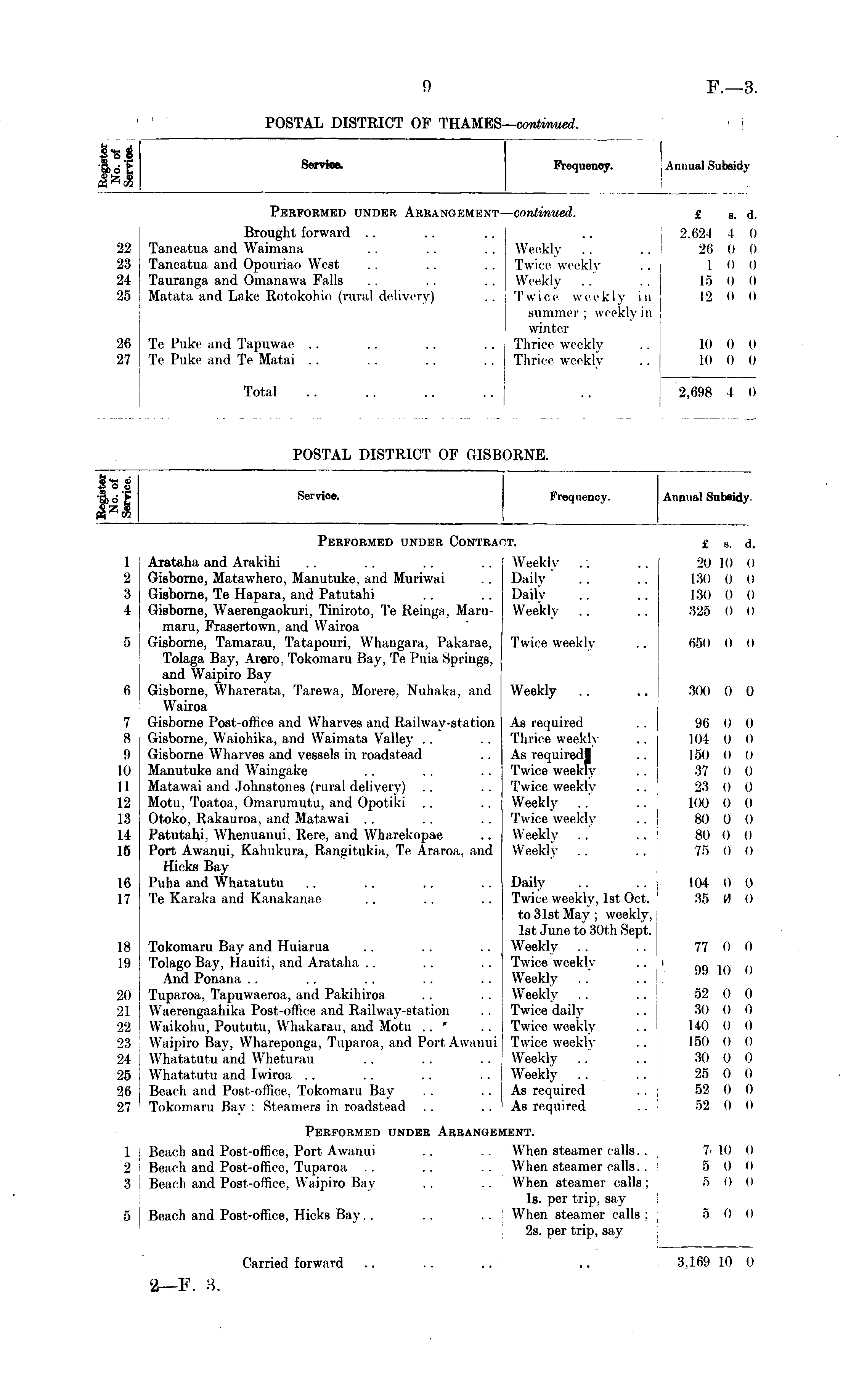'Sod £ Frequenoy. ; Annual Subsidy Service. Performed under Arrangement ■continued. £ a. d. 22 23 24 25 Brought forward .. Taneatua and Waimana Taneatua and Opouriao West Tauranga and Omanawa Palls Matata and Lake Rotokohio (rural delivery) Weekly .. Twice weekly Weekly T W 1 <■(■ wee k I V i II summer ; weekly in winter Thrioe weekly Thrice weekly 2.624 4 0 26 0 0 1 0 0 15 0 0 12 (I 0 26 27 Te Puke and Tapuwae Te Puke and Te Matai 10 0 0 10 0 i> Total 2,898 I 0