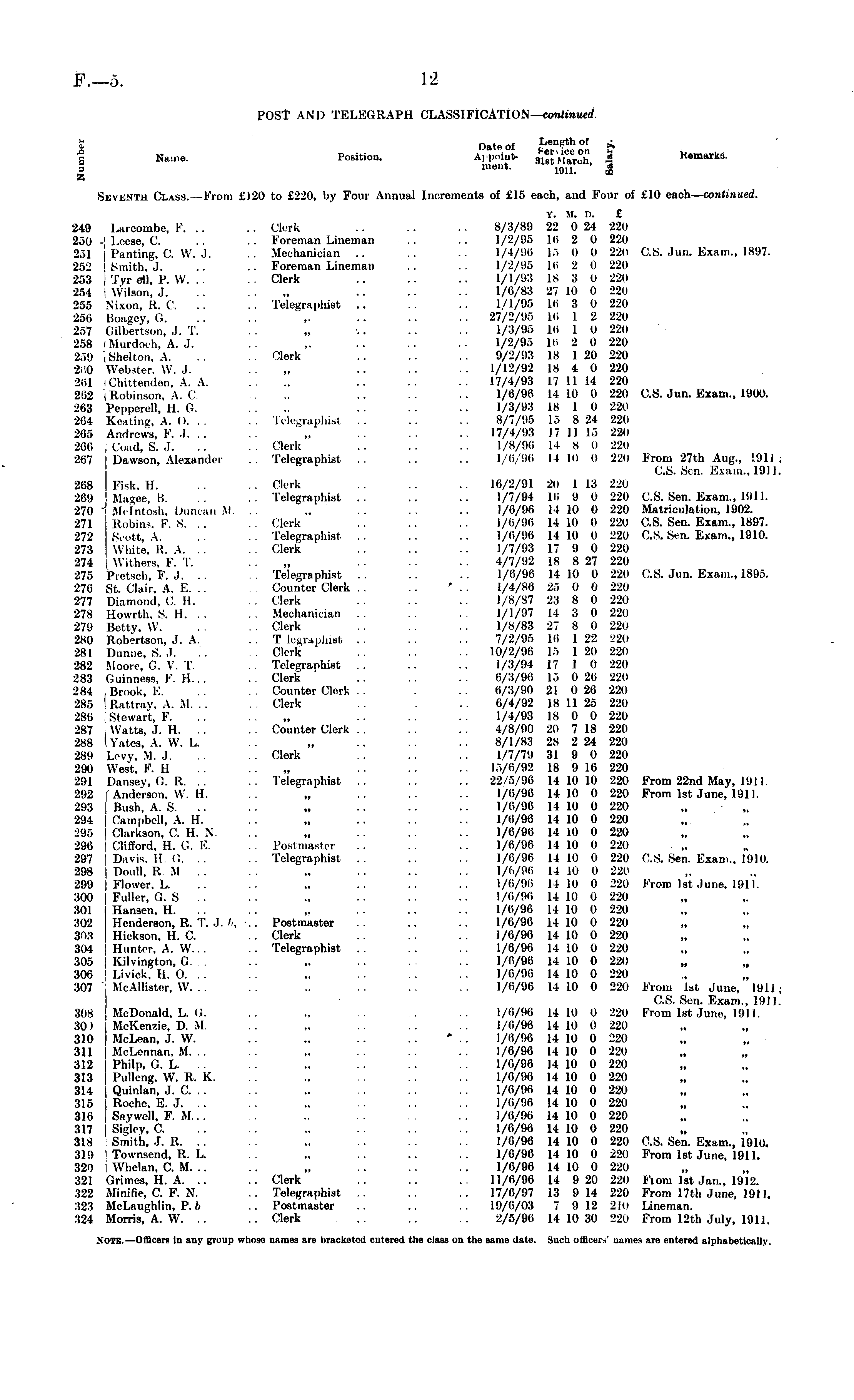 POSt AND TELEGRAPH CLASSIFICATION— continued £ Dats of Length of 3 Name. Position. A, poiut- j iTr™, 2 Kemarke. B ment. j 9n< - Seventh Class.—From £120 to £220, by Four Annual Increments of £15 each, and Four of £10 each— continued. Y. m. r>. £ 249 Larcombe, F. .. .. Clerk .. .. .. 8/3/89 22 024 220 250 -] ].eeae, C. .. .. Foreman Lineman .. .. 1/2/95 Iβ 2 0 220 251 J Panting, C. \V. J. .. Mechanician .. .. .. 1/4/9G 16 0 0 220 C.S. Jun. Exam., 1897. 252 I Smith, J. .. .. Foreman Lineman .. .. 1/2/95 1H 2 0 220 253 | Tyr eil, P. W. . . .. Clerk 1/1/93 IS 3 0 220 254 I Wilson, J. . . „ . • ■ • ■ • 1/6/83 27 10 0 220 255 Nixon, K. C. .. .. Telegraphist .. .. .. 1/1/95 Iβ 3 0 220 256 Boagey, G. .. .. ~ .. .. .. 27/2/115 Iβ 1 2 220 257 Gilberteon, J. T. .. „ • 1/3/95 l(i 1 0 220 258 (Murdoch, A. J. .. „ .. .. .. 1/2/85 In 2 0 220 260 ',Bhelton. A. .. .. Clerk .. .. .. 9/2/03 18 120 220 200 Webster. W. J. .. .. •• . ■ 1/12/92 18 4 0 220 2M iChittenden, A. A .. .. ~ 17/4/93 17 1114 220 262 , Robinson, A. (' ... .. .. .. 1/0/96 14 10 0 220 C.S. Jun. Exam., 19uu. 203 Pepperell, H. G. .... .. .. .. 1/3/93 18 1 0 220 204 Keating, A. O. .. .. 'Telegraphist .. 8/7/05 15 824 220 265 Andrews, F. J. .. .. „ 17/4/93 17 1115 2flU 200 loud, S. J. .. .. Clerk .. .. .. 1/8/96 14 8 0 220 267 Dawson, Alexander .. Telegraphist .. .. .. 1/6/96 U 111 0 220 From 27th Aug., 1911 C.S. Son. Exam., 1911 268 Fisk. H. .. .. Clerk .. .. .. 16/2/91 20 113 220 269 Magee, B. .. .. Telegraphist .. .. .. 1/7/94 Hi 9 0 220 C.S. Sen. Exam., 1911. 270 ■> Mclntosh, Duncan M. . . ~ . . . . .. 1/6/96 14 10 0 220 Matriculation, 1902. 271 Robins, F. 8. .. .. Clerk .. .. .. 1/6/96 14 Hi o 220 C.S. Sen. Exam., 1897. 272 Bcott, A. .. Telegraphist .. .. .. 1/6/96 14 10 0 220 C.S. Sin. Exam., 1910. 273 White, R, A. .. .. Clerk .. .. .. 1/7/93 17 9 0 220 274 I Withers, F. T. „ .. • • .. 4/7/92 18 827 220 275 Pretsch, F. J. .. .. Telegraphist .. .. .. 1/6/96 14 10 0 220 C.S. Jun. Exam., 1895. 270 St. Clair, A. E. .. . . Counter Clerk . . .. *.. 1/4/86 25 0 0 220 277 Diamond, C. 11. .. Clerk .. .. .. 1/8/87 23 8 0 220 278 Howrth, S. H. . . . . Mechanician . . .. . . 1/1/97 14 3 0 220 279 Betty, VV. • ■ • Clerk . . . . .. 1/8/83 27 8 0 220 280 Robertson, J. A. .. T lugrapniet . . .. .. 7/2/95 Iβ 122 220 281 Dunne, S.J. .. Clerk .. .. .. 10/2/96 15 120 220 282 Moore, G. V. T. . . Telegraphist . . . . . . 1/3/94 17 1 0 220 283 Guinness, F. H... . Clerk .. .. .. 6/3/96 16 026 220 284 .Brook, K. .. .. Counter Clerk .. . .. 0/3/90 21 026 220 285 Rattray, A. M. .. Clerk .. . .. 6/4/92 18 1125 220 286 Stewart, F. . • „ ■ ■ . ■ ■ • 1/4/93 18 0 0 220 287 Watts, J. H. .. . . Counter Clerk .. . . . . 4/8/90 20 718 220 288 (Yates, A. W. L. .. „ .. .. .. 8/1/83 28 224 220 289 Levy, M. J. .. . . Clerk . . . . .. 1/7/79 31 9 0 220 290 West, F. H .. . . „ .. .. .. 15/6/92 18 9 16 220 291 Dansey, O. R. .. .. Telegraphist .. .. .. 22/5/90 14 10 10 220 From 22nd May, 191 I. 292 ("Anderson. \V. 11. .. „ .. .. .. 1/6/96 14 10 0 220 From Ist June, 1911. 293 I Bush. A. S. .. .. „ .. .. .. 1/0/96 14 10 0 220 294 J Campbell, A. H. .. „ .. .. .. 1/0/96 14 10 0 220 296 J Clarkson, C. H. N .. „ .. .. .. 1/6/96 14 10 0 220 296 I Clifford, H. G. E. .. Postmaster .. .. .. 1/0/90 14 10 0 220 297 Davis. H. O. .. .. Telegraphist .. .. .. 1/6/96 14 10 0 220 C.S. Sen. Exam.. 1910. 298 I Doiill, R M . . .. „ .. .. .. l/f./9fl 14 10 0 220 299 I Flower. L. .. .. „ .. .. .. 1/6/96 14 10 0 220 From Ist June. 1911. 300 J Fuller, G. S .. .. ~ .. .. .. 1/6/96 14 10 0 220 301 Hansen, H. .. . . .. .. .. .. 1/6/96 14 10 0 220 302 Henderson, R. T. J. /.,-.. Postmaster .. .. .. 1/6/96 14 10 0 220 303 Hickson, H. C. . . Clerk .. . . .. 1/0/96 14 10 0 220 304 I Hunter. A. U .. Telegraphist .. .. .. 1/6/96 14 10 0 22(1 305 I Kilvington, G. . .. ~ .. .. .. 1/0/96 14 10 0 220 „ „ 306 ! Livick, H. O. .. . . .. . . . . .. 1/0/96 14 10 0 220 307 ' McAllister, W. .. .. .. .. .. .. 1/6/96 14 10 0 220 From Ist June, 1911 C.S. Son. Exam., 1911 308 McDonald, L. G. .. ~ .. . .. 1/6/96 14 10 0 220 Prom Ist June, 1911. 30) j McKenzie, D. M. .. „ .. .. .. 1/6/96 14 10 0 220 310 I McLean, J. W. .. .. .. .. **.. 1/0/96 14 10 0 220 311 McLennan, M. .. .. .. .. .. .. 1/6/96 14 10 0 220 312 Philp, G. L. . . .. .. .. .. .. 1/0/96 14 10 0 220 313 I Pullcng. W. R. l<. .. ~ .. . . .. 1/0/96 14 10 0 220 314 I Quinlan, J. C. .. .. .. . . .. .. 1/6/96 14 10 0 220 315 Roche, E. J. .. . . .. .. .. .. 1/6/96 14 10 0 220 316 Saywell, F. M... . .. .. .. .. 1/6/96 14 10 0 220 317 I Siglo.v, C. .. . . ~ . . . . .. 1/6/96 14 10 0 220 318 I Smith, J. R. .. . . „ . . . . .. 1/0/96 14 10 0 220 C.S. Sen. Exam., 1910. 319 I Townsend, R. L. . ~ .. .. .. 1/0/96 14 10 0 220 From Ist June, 1911. 320 i Whelan, C. M. .. .. „ .. .. .. 1/6/96 14 10 0 220 321 Grimes, H. A. .. .. Clerk .. .. .. 11/6/96 14 920 220 Fiom Ist Jan., 1912. 322 Minifie, C. F. N. .. Telegraphist .. .. .. 17/6/97 13 914 220 From 17th June, 1911. 323 McLaughlin, P. b .. Postmaster .. .. .. 19/6/03 7 912 210 Lineman. 324 Morris, A. W. .. .. Clerk .. .. .. 2/5/96 14 10 30 220 From 12th July, 1911. Note.—Officers in any group whose uames are bracketed entered the class on the same date. Such officers' uanics are entered alphabetically.