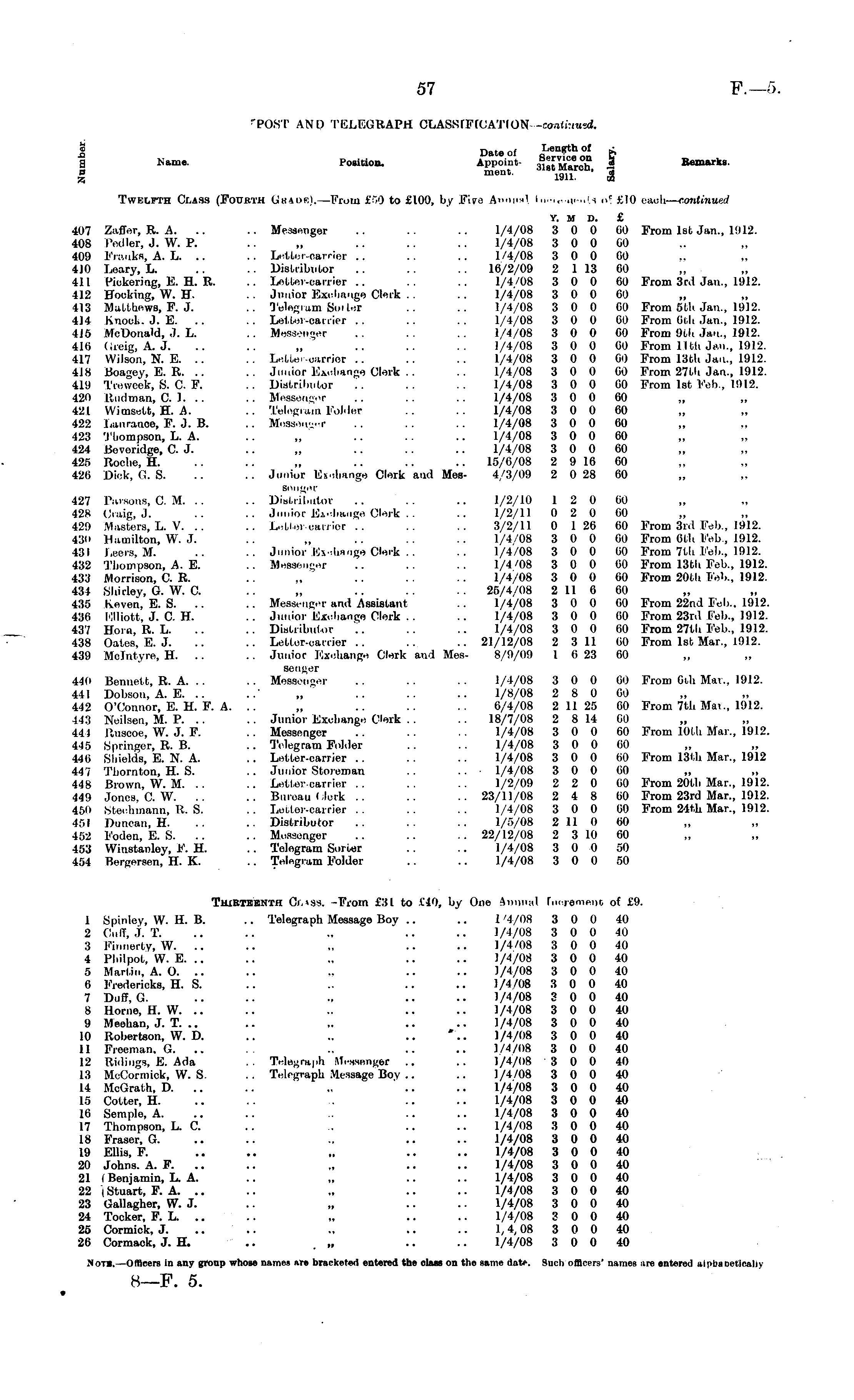 r POST AND TELEGRAPH CLASSIFICATION— continued. I Date of Length of .; Name. Position. Appoint- HgJjMaroh X Bemarke. a meat. ml • £ Twelfth Class (Foukth Gsadb). —From £50 to £100, by Fisre A»nn»l i ,> c £!0 each — continued Y. M D. £ 407 Zaffer, R. A. .. .. Messenger .. .. .. 1/4/08 3 0 0 00 From Ist Jan., I'M. , . 408 IVdler, J. W. P. .. „ .. .. .. 1/4/08 3 0 0 GO 40'J Frank*, A. L. .. .. L»tU»r-oarrier .. .. .. 1/4/08 3 0 0 CO 410 Leary, L. .. .. Distributor .. .. .. 16/2/09 2 113 00 „ 411 Pickering, E. H. R. .. Lettei-oarrier .. .. .. 1/4/08 3 0 0 60 From 3rd Jan., 1912. 412 Hocking, W. H. .. Junior Exubange Clerk .. .. 1/4/08 3 0 0 60 „ „ 413 Matthews, F. J. .. Telegram Sol U»r .. .. 1/4/08 3 0 0 00 From sth Jan., 1912. 414 Knock. J. E. .. .. Let.toi -carrier . . .. .. 1/4/08 3 0 0 60 From Oth Jan., 1912. 415 McDonald, J. L. .. H« mget .. .. .. 1/4/08 3 0 0 00 From 911. Jan., 1912. 410 (Jreig, A. J. .. .. „ .. .. .. 1/4/08 3 0 0 00 From Nth Jan., 1912. 417 Wilson, N. E. .. .. L»lU»i oarrier .. .. .. 1/4/08 3 0 0 CO From I3fcli Jan., 1912. 4JB Boagey, E. R. .. .. Junior E&iibange Clerk .. .. 1/4/08 3 0 0 GO From 27Wi Jan., 1912. 41!) Treweek, S. C. F. .. Distributor '.. .. .. 1/4/08 3 0 0 00 From let Feb., 1912. ■120 Hodman, C. I. .. .. Messenger .. .. .. 1/4/08 3 0 0 60 421 Wimsett, H. A. .. Telegram Folder .. .. 1/4/08 3 0 0 60 422 Lanrance, F. J. B. .. Mose i .. .. .. 1/4/08 3 0 0 60 123 Thompson, L. A. .. „ .. .. .. 1/4/08 3 0 0 60 424 Bovoridge, C. J. .. „ .. .. .. 1/4/08 3 0 0 60 42fi Roche, H. .. .. „ .. .. .. 15/6/08 2 916 60 420 Dick, G. S. .. .. Junior Esnbange Clerk and Mes- 4/3/09 2 028 60 SlllllMM - -427 Piivsons, C. M. .. .. Dinlriliiitor .. .. .. 1/2/10 1 2 0 00 428 Craig, J. .. .. Junior Ei-iliaiige Clerk .. .. 1/2/11 0 2 0 60 420 Masters, L. V. .. .. L.itloi eairior .. .. .. 3/2/11 0 126 60 From 3rd Feb., 1912. 430 Hamilton, W. J. .. „ .. . . .. 1/4/08 3 0 0 00 From 6th I'eb, 1912. 431 l.i-crs. .M. .. .. Junior Bx-tbange Clerk .. .. 1/4/08 3 0 0 60 From 7th Feb., 1912. 432 Thompson, A. E. .. Messenger .. .. .. 1/4'oB 3 0 0 00 From 13tli Feb., 1912. 433 Morrison, C. R. .. .. .. .. . . 1/4/08 3 0 0 60 From 20tli Feb., 1912. ■m Shirley, Q. W. a .. „ •• •• ■■ 26/4/08 211 0 60 435 Ivi-ven, E. S. .. .. McHs t -ii!<fr and Assistant .. 1/4/08 3 0 0 60 From 22nd Feb.. 1912. 4IJ(i Mlliott, J. C. H. .. Junior Hailiange Clerk .'. .. 1/4/08 30 0 00 From 23rd Deb., 1912. 437 Horn, R. L. .. .. Distributor ".. .. .. 1/4/08 3 0 0 60 From 27tli Feb., 1912. 438 Oates, E. J. .. .. Letter-carrier .. .. .. 21/12/08 2 311 CO From Ist Mar., 1912. 439 McJntyre, H. .. .. Junior Exchange Clerk and Mes- 8/9/09 1 623 00 „ „ sender 440 Bennett, R. A. .. .. Messenger .. .. .. 1/4/08 3 0 0 GO From GUi May., 1912. 441 Dobsou, A. E. .. ..' „ .. .. .. 1/8/08 2 8 0 00 442 O'Connor, E. H. F. A. .. „ .. .. .. 6/4/08 211 25 CO From 7th Mai., 1912. 443 Noilsen, M. P. .. .. Junior Exchange Clerk . . .. 18/7/08 2 814 00 44 i lluscoe, W. J. F. . . Messenger .. . . .. 1/4/08 3 0 0 00 From lOtli Mar., 1912. 445 Springer, R. B. .. Telegram Folder .. .. 1/4/08 3 0 0 60 „ „ 440 Shields, E. N. A. .. Letter-carrier .. .. .. 1/4/08 3 0 0 00 From 13th Mar., 1912 447 Thornton, H. S. .. Junior Storeman .. .. 1/4/08 3 0 0 00 448 Brown, W. M. .. .. Letter carrier .. .. .. 1/2/09 2 2 0 00 From 20th Mar., 1912. 449 Jones, C. W. .. .. Bureau (lerk .. .. .. 23/11/08 2 4 8 00 From 23rd Mar., 1912. 450 Meuhinann, R. S. .. Letter-carrier .. .. .. 1/4/08 3 0 0 00 From 24t,h Mar., 1912. 461 Duncan, H. .. .. Distributor .. .. .. 1/5/08 211 0 60 452 Foden, E. S. .. .. Messenger .. .. .. 22/12/08 2 310 60 453 Winstar-loy, l< , . H. .. Telegram Sorter .. .. 1/4/08 3 0 0 00 454 Bergeraen, H. K. . . Telegram Folder .. .. 1/4/08 3 0 0 50 Thirteenth 0l«88. -From £31 to £40, by One Annual fucrenienc of £9. 1 Spinley, W. H. B. .. Telegraph Message Boy .. .. 1 '4/08 3 0 0 40 2 Cuff, J. T. .. .. ~ .. .. 1/4/08 3 0 0 40 3 Firinerty, W. .. .. „ .. .. 1/4/08 3 0 0 40 4 Plulpot, W. E. .. .. „ .. .. 1/4/08 3 0 0 40 5 Martin, A. O. .. .. .. .. .. J/4/08 3 0 0 40 6 Fredericks, H. S. .. „ .. .. 1/4/08 3 0 0 40 7 Duff, G. .. .. ~ .. .. 1/4/08 3 0 0 40 8 Home, H. W. .. .. .. .. .. 1/4/08 3 0 0 40 9 Meehan, J. T. .. .. ~ .. .. 1/4/08 3 0 0 40 10 Robertson, W. D. .. .. .. .. 1/4/08 3 0 0 40 II Freeman. G. .. .. .. .. .. 1/4/08 3 0 0 40 12 Ridings, E. Ada .. T«legra|ih Miosenger .. .. 1/4/08 3 0 0 40 13 McCormick, W. S. . . Telegraph Message Boy .. .. 1/4/08 3 0 0 40 14 McGrath, D. .. .. ~ .. .. 1/4/08 3 0 0 40 16 Cotter, H .. .. .. 1/4/08 3 0 0 40 16 Semple, A. .. .. .. .. 1/4/08 3 0 0 40 17 Thompson, L. C. .. . .. .. 1/4/08 3 0 0 40 18 Fraser, G. .. .. .. .. 1/4/08 3 0 0 40 19 Ellis, F. .. .. „ .. .. 1/4/08 3 0 0 40 20 Johns. A. F. .. .. ~ .. .. 1/4/08 3 0 0 40 21 (Benjamin, L. A. .. „ .. .. 1/4/08 3 0 0 40 22 (Stuart, F. A. .. .. „ .. .. 1/4/08 3 0 0 40 23 Gallagher, W. J. .. „ .. .. 1/4/08 3 0 0 40 24 Tocker, F. L. .. .. „ .. .. 1/4/08 3 0 0 40 25 Cormick, J. .. .. .. .. .. 1, 4, 08 3 0 0 40 26 Cormack, J. H. .. „ .. .. 1/4/08 3 0 0 40 -NaTB. —Officers in any group whose names nre bracketed entered the class on the same date. Such officers' names ;ire entered alpbaDeticaliy