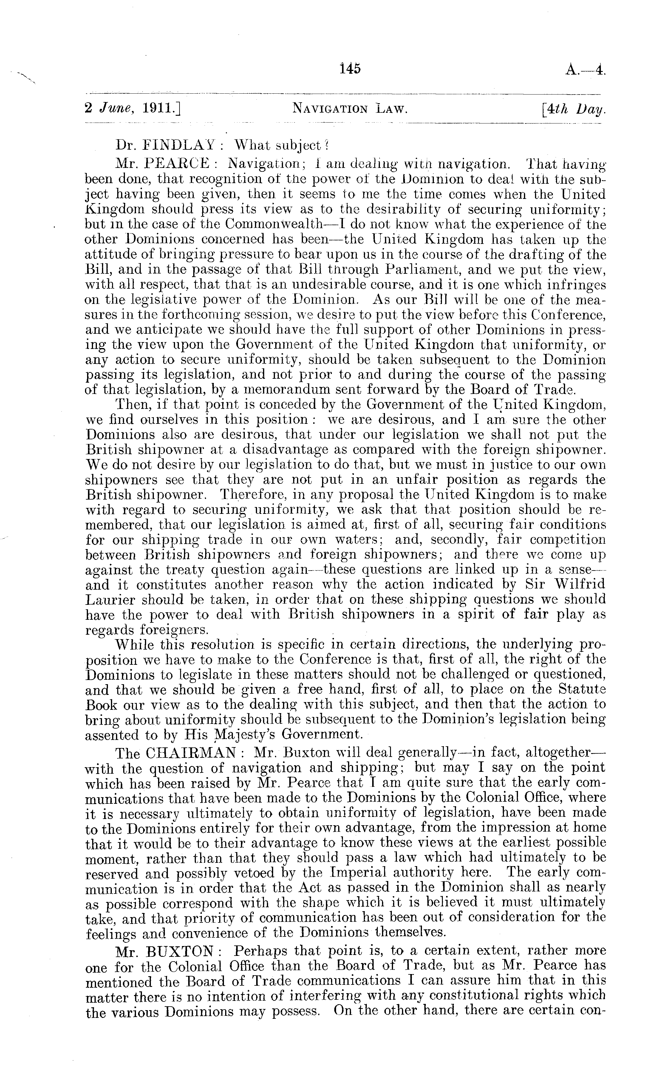 2 June, 1911.] Navigation Law. [kth Day. Dr. FINDLAY : What subject? Mr. PEARCE : Navigation; lam dealing with navigation. That having been done, that recognition of the power of the Dominion to deal with the subject having been given, then it seems to me the time comes when the United Kingdom should press its view as to the desirability of securing uniformity; but in the case of the Commonwealth —I do not know what the experience of the other Dominions concerned has been —the United Kingdom has taken up the attitude of bringing pressure to bear upon us in the course of the drafting of the Bill, and in the passage of that Bill through Parliament, and we put the view, with all respect, that that is an undesirable course, and it is one which infringes on the legislative power of the Dominion. As our Bill will be one of the measures in the forthcoming session, we desire to put the view before this Conference, and we anticipate we should have the full support of other Dominions in pressing the view upon the Government of the United Kingdom that uniformity, or any action to secure uniformity, should be taken subsequent to the Dominion passing its legislation, and not prior to and during the course of the passing of that legislation, by a memorandum sent forward by the Board of Trade. Then, if that point is conceded by the Government of the United Kingdom, we find ourselves in this position : we are desirous, and I am sure the other Dominions also are desirous, that under our legislation we shall not put the British shipowner at a disadvantage as compared with the foreign shipowner. We do not desire by our legislation to do that, but we must in justice to our own shipowners see that they are not put in an unfair position as regards the British shipowner. Therefore, in any proposal the United Kingdom is to make with regard to securing uniformity, we ask that that position should be remembered, that our legislation is aimed at, first of all, securing fair conditions for our shipping trade in our own waters; and, secondly, fair competition between British shipowners and foreign shipowners; and there we come up against the treaty question again—these questions are linked up in a sense — and it constitutes another reason why the action indicated by Sir Wilfrid Laurier should be taken, in order that on these shipping questions we should have the power to deal with British shipowners in a spirit of fair play as regards foreigners. While this resolution is specific in certain directions, the underlying proposition we have to make to the Conference is that, first of all, the right of the Dominions to legislate in these matters should not be challenged or questioned, and that we should be given a free hand, first of all, to place on the Statute Book our view as to the dealing with this subject, and then that the action to bring about uniformity should be subsequent to the Dominion's legislation being assented to by His Majesty's Government. The CHAIRMAN : Mr. Buxton will deal generally—in fact, altogether— with the question of navigation and shipping; but may I say on the point which has been raised by Mr. Pearce that T am quite sure that the early communications that have been made to the Dominions by the Colonial Office, where it is necessary ultimately to obtain uniformity of legislation, have been made to the Dominions entirely for their own advantage, from the impression at home that it would be to their advantage to know these views at the earliest possible moment, rather than that they should pass a law which had ultimately to be reserved and possibly vetoed by the Imperial authority here. The early communication is in order that the Act as passed in the Dominion shall as nearly as possible correspond with the shape which it is believed it must ultimately take, and that priority of communication has been out of consideration for the feelings and convenience of the Dominions themselves. Mr. BUXTON : Perhaps that point is, to a certain extent, rather more one for the Colonial Office than the Board of Trade, but as Mr. Pearce has mentioned the Board of Trade communications I can assure him that in this matter there is no intention of interfering with any constitutional rights which the various Dominions may possess. On the other hand, there are certain con-