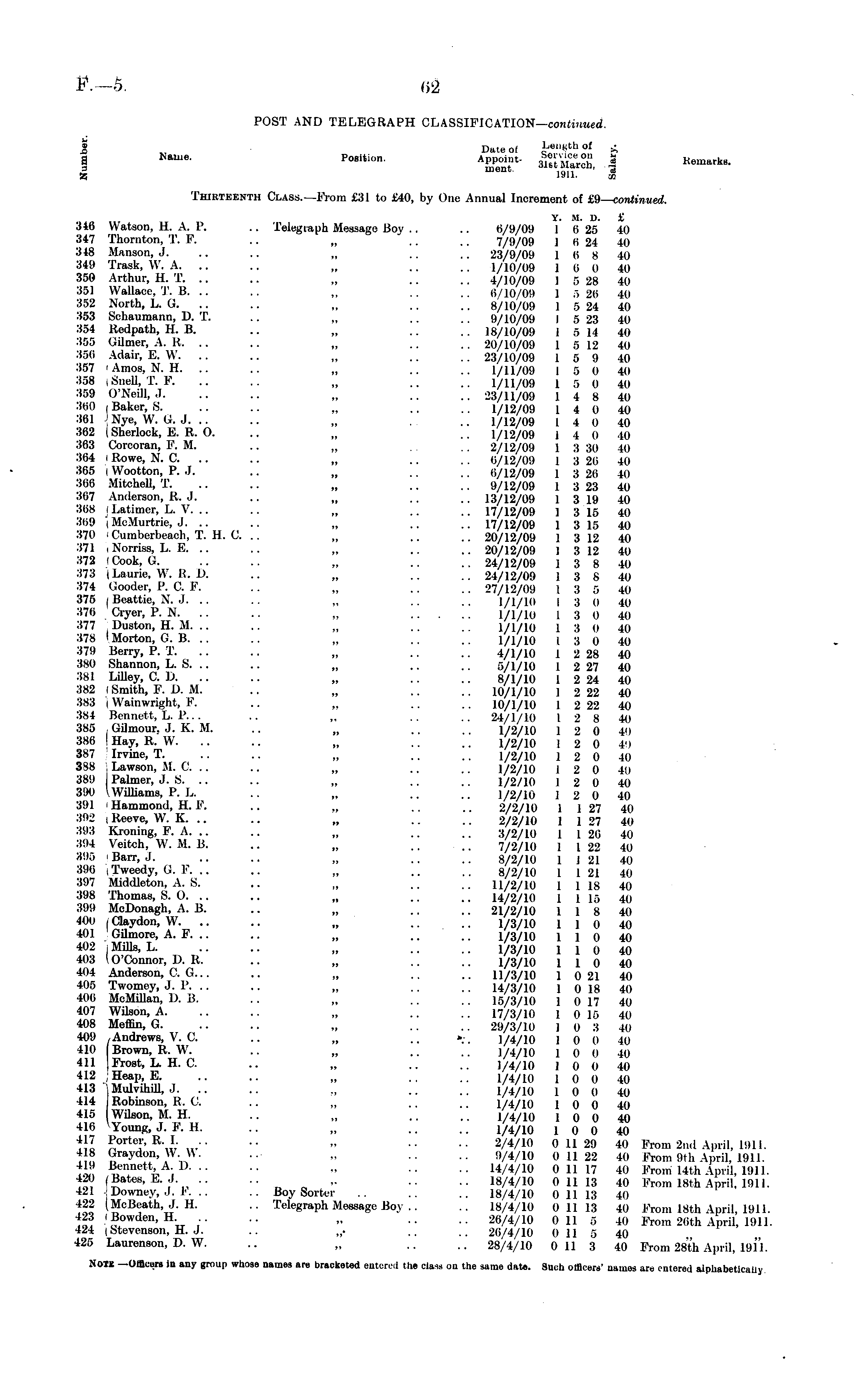 POST AND TELEGRAPH CLASSIFICATION— continued. I Date of Length O« g Thirteenth Class.— From £31 to £40, by One Annual Increment of £9— continued. Y. M. D. £ Hβ Watson, H. A. P. .. Telegraph Message Boy .. .. 6/9/09 I t> 25 40 347 Thornton, T. F. .. „ .. ~ 7/9/09 1 li 24 lo :tlB Manson, J. .. .. „ .. ~ 23/9/O'J I <i 8 40 349 Traak, W. A. .. .. „ .. .. l/io/oi) I (i o 4<> 350 Arthur, H. T. .. .. „ .. .. 4/10/09 1 528 10 351 Wallace. , !'. B. .. .. .. .. .. 6/10/09 1 ."> 26 40 352 North, L. G. .. .. .. .. .. 8/10/0!) 1 524 40 353 Sehauraann, D. T. .. „ .. . . 9/10/o*l I 523 40 354 Redpath, H. B. .. .. .. .. 18/10/09 I 514 40 355 Gilmer, A. R. .. .. „ .. .. 20/10/0!) 1 512 40 356 Adair, E. W. .. .. .. .. .. 23/10/09 1 :> <i 40 357 Amos. X. H. .. .. „ .. .. 1/11/0!) | ,~, {) 40 358 |SneU,T. F. .. .. „ .. .. i/n/09 1 r> 0 40 359 O'Neill,.!. .. .. „ .. .. 23/11/09 1 4 8 40 380 , Baker, S. .. .. „ .. .. 1/12/09 14 0 40 :mi Nye, W. G. J. .. .. . .. 1/12/09 14 0 40 362 I Sherlock, E. R. O. „ .. 1/12/09 14 0 40 303 Corcoran, P. M. .. „ .. .. 2/12/0!) I 330 40 364 ißowe.N. C. .. .. „ .. .. fi/12/0!) I 326 40 365 1 VVootton, P. .J. .. „ .. ~ 6/12/09 1 3 2<i 40 366 Mitchell,'!'. .. .. „ .. .. "1/12/09 I 3 23 40 367 Anderson, R. J. .. „ .. .. 13/12/0!) I 319 40 368 Latimer, L. V. .. .. „ .. .. 17/12/Oii 1 315 40 3ii9 Ur.Murtrie, J. .. .. „ .. .. 17/12/09 1 315 40 370 Ctiinberbeach, T. H. C. .. „ .. .. 20/12/0!) I 312 40 371 1 Norriss, L. E. .. .. „ .. .. 20/12/09 1 312 40 372 'Cook. C. .. .. „ .. .. 24/12/09 13 8 40 373 I Laurie, W. R. D. .. „ .. .. 24/12/09 1 3 8 40 374 Gooder, P. C. F. .. „ .. .. 27/12/09 1 3 :. 40 375 (Beattie, N. J. .. .. ~ .. .. 1/1/10 i 3 0 40 376 Cryer, P. N. .. .. „ l/l/lO 13 0 40 377 Duston, H. il. .. .. „ .. .. 1/1/10 1 3 0 40 378 'Morton, G. B. .. .. .. .. .. 1/1/10 I 3 0 40 ■iT'.i Berry, P. T. .. .. „ .. .. 4/1/10 J 228 40 3sn Shannon, L. S. .. .. „ .. .. 5/1/10 I 2 27 40 381 Lilley, C. 1). .. .. „ .. .. 8/1/10 1 224 40 382 | Smith, F. D. M. .. „ .. .. 10/1/10 I 222 40 383 IWainwright, F. .. .. .. .. 10/ I/10 1 222 40 354 Bennett, L. P... .. .. .. .. 24/1/10 I 2 8 40 385 Gilmour. J. K. M. .. „ .. .. 1/2/10 12 0 H) 386 Hay, K. W. .. .. „ .. .. 1/2/10 12 0 4'i 887 Irvine, T. .. .. „ .. .. 1/2/10 1 2 0 10 3sB Lawson, il. C. .. .. „ .. .. 1/2/10 I 2 0 !n :(s!i Palmer, J. & .. .. .. .. .. 1/2/10 I 2 0 40 3.mi I Williams, P. L. .. ~ .. .. 1/2/10 1 2 0 40 3!U Hammond, H. l< , . .. ~ ~ ~ 2/2/10 1 127 40 392 | Reeve, W. K. .. .. „ .. .. 2/2/10 1 127 40 393 Kroning, F. A. .. .. „ .. .. 3/2/10 1 126 40 394 Veitch, W. M. 13. .. „ .. .. 7/2/10 1 122 40 896 Barr, J. .. .. „ .. .. 8/2/10 1 J2l 40 396 (Tweedy, G. F. .. .. „ .. .. 8/2/10 1 121 40 397 Middleton, A. S. .. „ .. .. 11/2/IO 1 118 40 398 Thomas, ,S. O. .. .. „ .. .. 14/2/10 1 115 40 :!'."'.i McDonagh, A. B. .. „ .. .. 21/2/10 1 1 8 40 400 1 Claydon, W. .. .. „ .. .. 1/3/10 1 1 0 40 401 Gilmore, A. F. .. .. „ .. .. 1/3/10 1 1 0 40 402 : Mills, L. .. .. „ .. .. 1/3/10 1 1 0 40 403 \ O'Connor, I). R. .. „ .. .. 1/3/10 1 1 0 40 404 Anderson, C. G... .. „ .. .. u/3/10 1 021 40 405 Twomey, J. I. .. .. „ .. . . 14/3/10 1 018 40 406 McMillan, D. J!. .. „ .. .. 15/3/10 1 017 40 407 Wilson, A „ .. .. 17/3/10 1 015 40 408 Meffin, G. .. .. „ .. .. 29/3/10 1 0 3 40 409 .Andrews, V. C. .. „ .. -.. 1/4/10 10 0 40 UO Brown, R. W. .. „ .. .. 1/4/1,, , 0 0 40 411 J Frost, L. H. C. .. „ .. .. 1/4/10 10 0 40 412 ;Heap, E. .. .. „ .. .. 1/4/10 1 0 0 40 413 Mulvihill, J. .. .. ~ .. .. 1/4/10 1(I 0 Hi 414 Robinson, R. C. .. „ .. .. 1/4/10 1 0 0 40 415 Wilson, M. H. .. „ .. .. J/4/10 10 0 40 Hi; Young, J. F. H. .. „ .. .. 1/4/10 10 0 40 [!', ': , " t, '- K -J; „.•• •■ ■• ■• •• 2/4/10 0 1129 40 Prom 2nd April, 1911. 18 .lav.lon, W. \\. .. .. .. .. 9/4/xo 0 1122 40 Prom 9th AprU, 1911. !, A l) .. .. .. H/4/10 0 1117 40 From 14th April, 191 i. m< B ' ;,■ ■' ■ , - ■' • J «/4/10 0 1113 40 From 18th April 1911. 421 Downey, J. F. .. .. Boy Sorter .. .. .. 18/4/10 011 13 40 122 (Mcßeath, J. H. .. Telegraph Message Boy.. .. 18/4/10 0 1113 40 From 18th April, 1911. f fßowden, H. .. „ .. .. 26/4/10 011 5 40 Prom 26th Apri£ 191] 424 (Stevenson, H. J. .. ... .. .. 26/4/10 (I 11 5 40 425 Uurenson, D. W. .. .. .. .. 28/4/10 011 3 40 From 28th April, 1911. .Vote — Offlcura in any group whose names are bracketed entered the class on the same dnte. Such officers , uamos are entered alphabetically