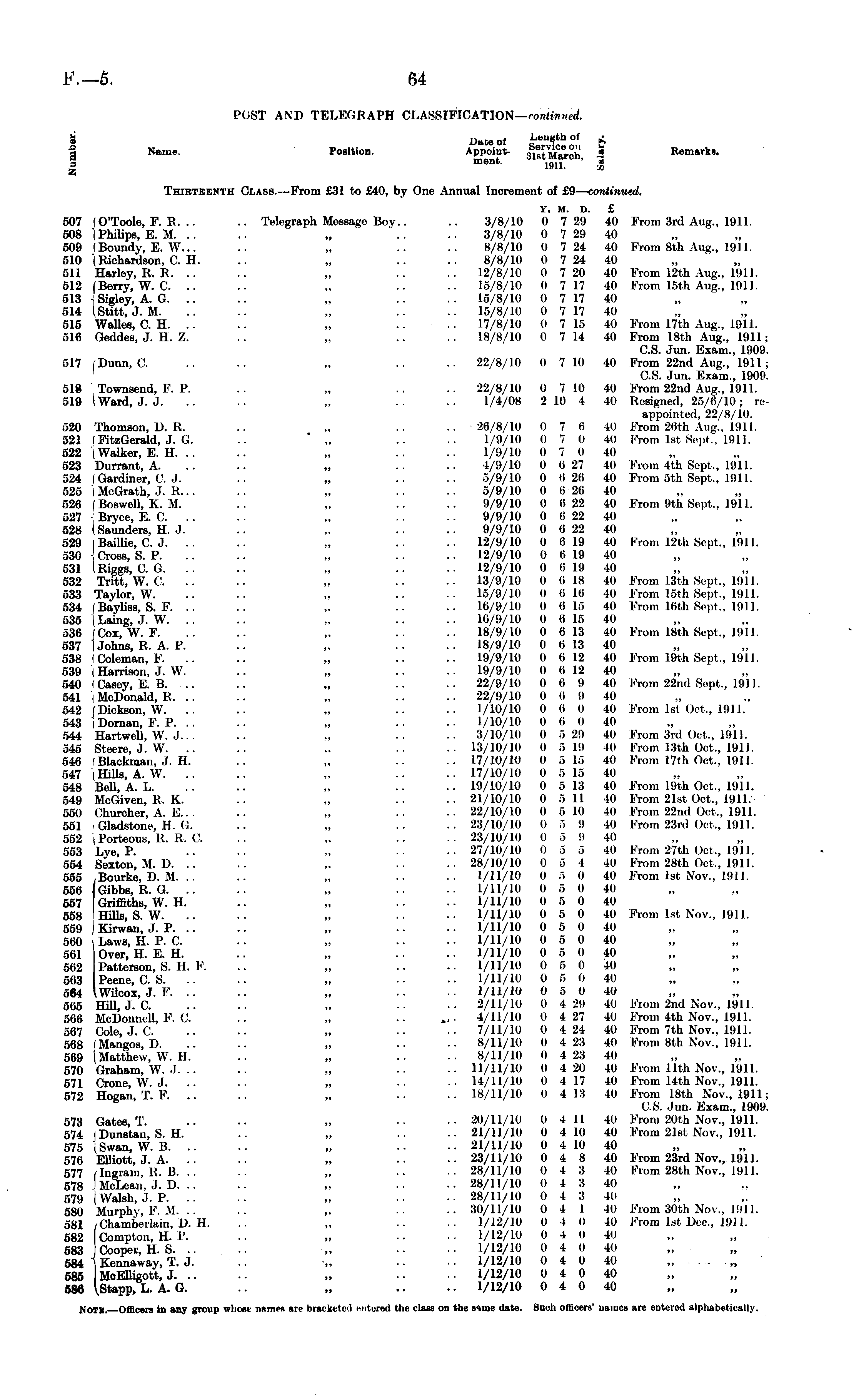 POST AND TELEGRAPH CLASSIFICATION— continued. S Bate of £ I Name. Position. Appoint- 5 Remarks. I ment. 1911 ' * X Thirteenth Class. —From £31 to £40, by One Annual Increment of £9— continued. Y. M. D. £ 507 (O'Toole, F. R. .. .. Telegraph Message Boy.. .. 3/8/10 0 729 40 From 3rd Aug., 1911. 508 1 Philips, E. M. .. .. „ ' .. .. 3/8/10 0 729 40 509 IBoundy, E. W... .. „ .. .. 8/8/10 0 724 40 From Bth Aug., 1911. 510 (Richardson, C. H. .. „ .. .. 8/8/10 0 724 40 511 Harley, R. R. .. .. „ .. .. 12/8/10 0 720 40 Prom 12th Aug., 1911. 512 (Berry, W. C. .. .. „ .. .. 15/8/10 0 717 40 From loth Aug., 1011. 513 -Sigley, A. G. .. .. „ .. .. 15/8/10 0 717 40 514 (Stitt, J. M. .. .. „ .. .. 15/8/10 07 17 40 515 Walles, C. H. .. .. „ .. .. 17/8/10 o 715 40 From 17th Aug., 1911. 516 Geddes, J. H. Z. .. ~ .. .. 18/8/10 0 714 40 From 18th Aug., 1911; C.S. Jun. Exam., 1909. 517 (Dunn, C. .. .. „ .. .. 22/8/10 0 710 40 From 22nd Aug., l<lll ; C.S. Jun. Exam., 1909. 518 Townsend, F. P. .. „ .. .. 22/8/10 0 710 40 From 22nd Aug., 1911. 519 (Ward, J. J. .. .. „ .. .. 1/4/08 210 4 40 Resigned, 25/6/10; reappointed, 22/8/10. 520 Thomson, 1). IS. .. .. .. .. 26/8/10 0 7 6 40 From 26th Aug., 1911. 521 (FitzGerald, J. G. .. „ .. .. 1/9/10 0 7 0 40 Prom lit Sept., 1911. 522 (Walker, E. H. .. .. „ .. .. 1/9/10 0 7 0 40 523 Durrant, A. .. .. „ .. .. 4/9/10 0 027 40 Prom 4th Sept., 1911. 524 I Gardiner, ('. .1. .. „ .. .. 5/9/10 0 826 40 From sth Sept., 1911. 525 iMcGrath, J. R... .. „ .. .. 5/9/10 0 020 40 526 (Boswell, K. M. .. „ .. .. 9/9/10 0 022 40 From 9th Sept., 1911. 527 Bryce, E. C. .. .. „ .. .. 9/9/10 0 022 40 528 ISaunders, H. .1. .. „ .. .. 9/9/10 0 022 40 529 (Baillie, C. J. .. .. „ .. .. 12/9/10 0 019 40 From 12th Sept., 1911. 530 -Cross, S. P. .. .. „ .. .. 12/9/10 0 619 40 531 (Riggs, C. G. .. .. „ .. .. 12/9/10 0 619 4(1 532 Tritt, W. (', .. .. „ .. .. 13/9/10 0 (i 18 40 Prom 13th Sept., 1911. 533 Taylor, W. .. .. „ .. .. 15/9/10 0 010 40 From 16th Sept., 1911. 534 [ Baylies, S. F. .. .. „ .. •• 16/9/10 0 i>ls 40 From 16th Sept., 1911. 535 (Laing, J. W. .. .. „ .. .. 16/9/10 0 615 40 536 ICox, W. F. .. .. .. .. .. 18/9/10 0 613 40 From 18th Sept., 1911. 537 "(Johns, R. A. P. .. .. .. .. 18/9/10 0 013 40 538 (Coleman. F. .. .. „ .. .. 19/9/10 0 612 40 From 19th Sept., 1911. 539 (Harrison. .I. W. .. „ .. .. 19/9/10 0 612 40 540 I Casey, E. B. .. .. „ .. .. 22/9/10 0 0 9 40 From 22nd Sept., 1911. 541 , McDonald, K. .. .. „ .. .. 22/9/10 0 (i 9 40 542 JDickson, W. .. .. „ .. .. 1/10/10 0 0 o 40 From Ist Oot., 1911. 543 iDornan, F. P „ .. .. 1/10/10 0 0 0 40 544 Hartwell, \V. .!.. . .. „ .. .. 3/10/10 0 r>29 40 Prom 3rd Oct., 1911. 545 Steere, J. W. .. .. ~ .. .. 13/10/10 0 519 40 From 13th Oct., 1911. 546 I Blackmail, J. H. .. .. .. .. 17/10/10 0 ."> 15 40 Prom 17th Oct., 1911. 047 , Hills, A. W „ .. .- 17/10/10 o 515 40 548 Bell, A. L. .. .. „ .. .. 19/10/10 0 513 40 From 19th Oct.. 1911. 549 McGiven, R. K. .. „ .. .. 21/10/10 0 511 40 From 21st Oct., 1911. 550 Churcher, A. X.. . .. „ .. .. 22/10/10 0 510 40 From 22nd Oct.. 1911. 551 Gladstone, H. (J. .. „ .. .. 23/10/10 0 5 9 40 Prom 23rd Oot., 1911. 552 t Porteous, K. R. C. .. „ .. .. 23/10/10 0 5 (I 40 553 Lye, P. .. .. „ •• •• 27/10/10 0 6 S 40 From 27th Oct., 1911. 554 Sexton, M. D. .. .. „ .. .. 28/10/10 0 5 4 40 From 28th Oct., 1911. 555 Bourke, D. il. .. .. „ .. .. 1/11/10 0 5 0 40 From Ist Nov., 1911. 556 iGibbs, R. G „ .. .. 1/11/10 0 5 0 40 557 Griffiths, W. H. .. „ .. .. 1/11/10 0 5 0 40 558 Hills, S. W. .. .. „ .. •• 1/11/10 0 5 0 40 Prom let Nov., 1911. 559 JKirwan, J. P „ .. .. 1/11/10 0 5 0 40 500 i Laws, H. P. ('. .. „ .. ■• 1/11/10 0 5 0 40 561 Over, H. E. H. .. „ .. .. 1/11/10 0 5 0 40 562 Patterson, S. H. F. .. „ .. .. 1/11/10 0 5 0 40 563 Peene, C. S „ •■ •• 1/11/10 0 5 0 40 564 Wilcox, J. F „ .. .. 1/11/10 0 ."» 0 40 565 Hill, J. C. .. .. „ •• •• 2/11/10 0 4 2!i 4(1 Fiom 2nd Nov., 1911. 566 McDonnell, F. (J. .. „ .. ~. 4/11/10 0 427 40 From 4th Nov., 1911. 567 Cole, J. ('. .. .. „ .. . ■ 7/11/10 0 424 40 From 7th Nov., 1911. 568 (Mangos D. .. „ .. .. 8/11/10 0 423 40 From Bth Nov., 1911. 569 I Matthew, W. H. .. „ .. .. 8/11/10 0 423 40 570 Graham, W. •I. .. .. „ •• •• 11/11/10 0 420 40 From 11th Nov., 1911. 571 Crone, W. J. .. .. „ .. •■ 14/11/10 0 417 40 From 14th Nov., 1911. 572 Hogan, T. F. .. .. „ .. .. 18/11/10 0 413 40 From 18th Nov., 1911 ; C.S. Jun. Exam., 1909. 573 Gates, , ! , . .. .. „ .. •• 20/11/10 0 411 40 From 20th Nov., 1911. 574 iDunstan S. H. .. „ .. .. 21/11/10 0 410 40 From 21st Nov., 1911. 575 (Swan, W. B „ .. .. 21/11/10 0 410 40 576 Elliott, J. A. .. .. „ .. •• 23/11/10 0 4 8 40 From 23rd Nov., 1911. 577 flngram, K. B. . . .. „ .. .. 28/11/10 0 4:! 40 From 28th Nov., 1911. 578 McLean. J. D „ •• •• 28/11/10 0 4 3 40 579 I Walsh, J. P „ •• ■• 28/11/10 0 4 3 40 580 Murphy, F. it. .. .. ~ .. •• 30/11/10 0 4 1 40 From 30th Nov.. I ill I. 581 Chamberlain, D. H. .. „ .. .. 1/12/10 0 4 0 40 From Ist Due, lit 11. 582 Compton, H. P. .. „ •• •• 1/12/10 0 4 0 40 583 Cooper, H. S „ .. .. 1/12/10 0 4 0 40 584 1 Kennaway, T. J. .. -„ •• ■• 1/12/10 0 4 0 40 „ . „ 585 McElligott, J. .. .. „ .. .. 1/12/10 0 4 0 40 586 istapp, L. A. G. .. „ .. .. 1/12/10 0 4 0 40 jioTK. Officers in any group whose namn arr bracketed sutured the class on the s<trae date. Such officers' names are entered alphabetically.
