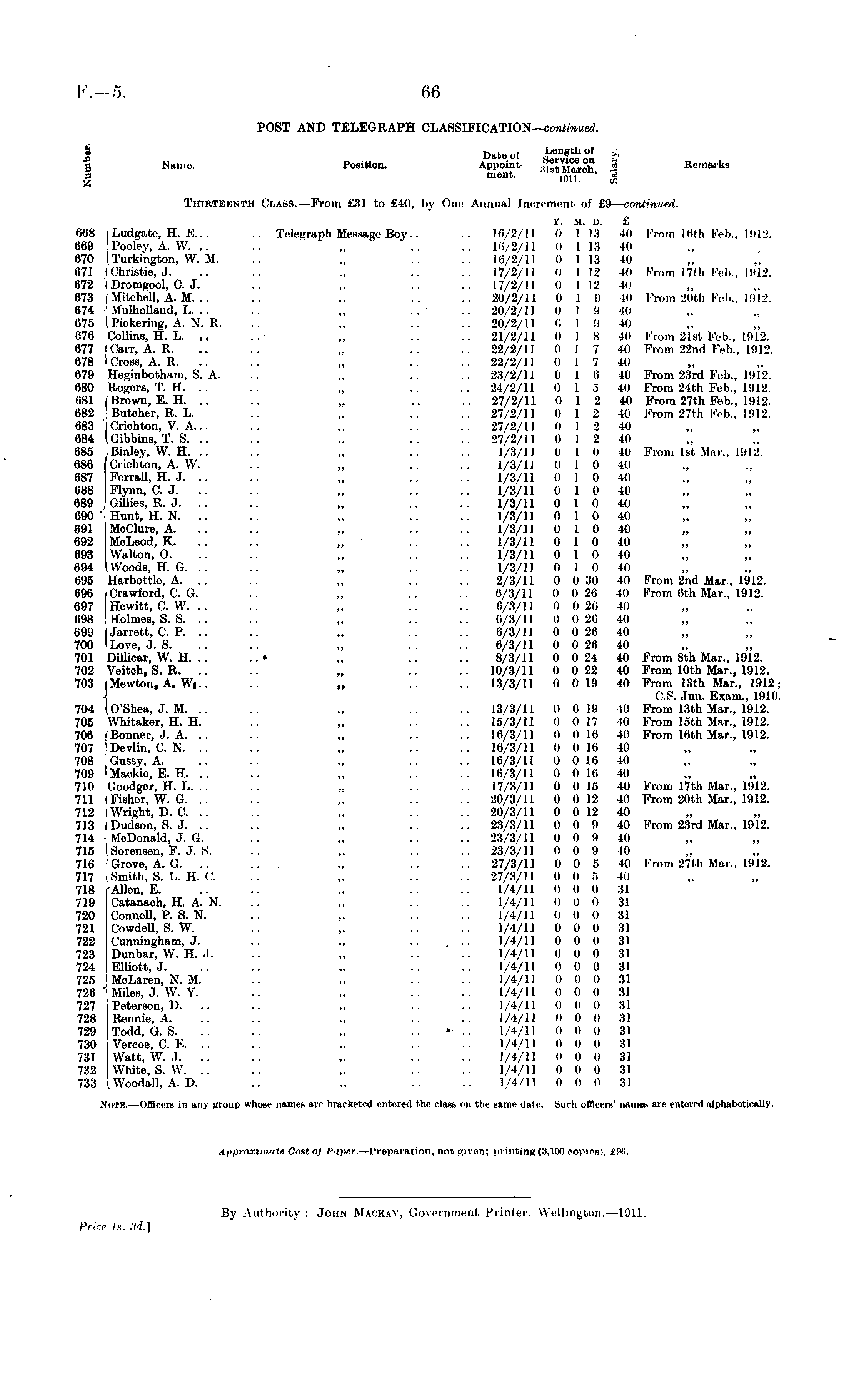 POST AND TELEGRAPH CLASSIFICATION— continued. • Date of Ijength of £ g Name. Position. Appoint- -3 Bemerke. .= ment - ' 1011. ' I Thirtkkkth Class.—From £31 to £40, by One Annual Increment of £9— continued. y. M. d. £ 668 fLudgate, H. X... .. Telegraph Messages Boy.. .. 16/2/11 (I 113 40 From 16th Feb., 1912. 669 J'ooley, A. VV. .. .. „ .. .. 16/2/11 (t 113 40 670 ll'urkington, W. .\!. .. ~ .. .. 16/2/11 0 113 lo 671 (Christie, J. .. .. „ .. .. 17/2/11 0 112 Ml From 17th Feb., 1912. (572 i Dromgool, C. J. .. .. .. .. 17/2/11 (I 112 4(1 673 I Mitchell, A. M. .. .. „ .. .. 20/2/11 0 1 9 40 From 20th Feb., 1912. 674 Mulholland, L. .. .. „ .. .. 20/2/11 0 1 !l 40 675 (Pickering, A. N. R. .. .. .. .. 20/2/11 0 I 9 40 876 Collins, H. L. .. ..■ „ .. .. 21/2/11 0 1 8 40 From 21et Feb., 1912. t>77 M'aiT, A. R. .. .. „ .. .. 22/2/11 0 17 40 From 22nd Feb., 1912. 678 1 Cross, A. R. .. .. „ .. .. 22/2/11 0 1 7 X) 679 Heginbotham, S. A. .. „ .. .. 23/2/11 0 1 <i 40 From 23rd Feb., 1912. 680 Rogers, T. H. .. .. .. .. .. 24/2/11 0 1 S 40 From 24th Feb., 1912. 681 (Brown, E. H. .. .. „ .. .. 27/2/11 0 1 2 40 From 27th Feb., 1912. 682 Butcher, R. L. .. „ .. .. 27/2/11 0 1 2 40 From 27th Feb., 1912. t>B3 , Crichton, V. A... .. .. .. .. 27/2/11 0 I 2 40 684 (.Uibbins, T. S. .. .. .. .. .. 27/2/11 0 1 2 40 685 Binley, W. H. .. .. .. .. .. 1/3/11 0 I 0 40 From Ist Mar.. lIMI , . 686 Crieh'ton, A. W. .. .. .. .. 1/3/11 0 I (I 40 687 Forrall, H. J. .. .. „ .. .. 1/3/11 0 1 0 40 688 Flynn, C. J. .. .. „ .. .. 1/3/11 0 1 0 40 689 J Gillies, R. J. .. .. „ .. .. 1/3/11 0 10 40 690 Hunt, H. N. .. .. „ .. .. 1/3/11 0 10 40 691 McClure, A. .. .. „ .. .. 1/3/11 0 1 0 40 692 McLeod, K. .. .. „ .. .. 1/3/11 0 1 0 40 693 Walton, 0. .. .. ~ .. .. 1/3/11 0 10 40 694 Woods, H. G. .. .. „ .. .. 1/3/11 0 10 40 695 Harbottle, A. .. .. „ .. .. 2/3/11 0 030 40 From 2nd Mar., 1912. 696 Crawford, C. G. .. „ .. .. 6/3/11 0 026 40 From (ith Mar., 1912. 697 Hewitt, C. W. .. .. „ .. .. 6/3/11 0 026 40 698 Holmos, S. S. .. .. „ .. .. 6/3/11 0 026 40 699 I Jarrett, C. P. .. .. „ .. .. 6/3/11 0 026 40 700 I Love, J. S. .. .. „ .. .. 6/3/11 00 26 40 701 Dillicar, W. H. .. ..• „ .. .. 8/3/11 0 024 40 From Bth Mar., 1912. 702 Veitch, S. R. .. .. „ .. .. 10/3/11 0 022 40 From 10th Mar., 1912. 703 iMewton, A. W|.. .. „ .. .. 13/3/11 o 019 40 From 13th Mar., 1912; •I C.S. Jun. Exam., 1910. 704 (O'Shea, J. M. .. .. ~ .. .. 13/3/11 0 0 lit 40 From 13th Mar., 1912. 705 Whitaker, H. H. .. „ .. .. 15/3/11 0 017 40 From 16th Mar., 1912. 706 /Bonner, J. A. .. .. „ .. .. 16/3/11 0 016 40 HYom 16th Mar., 1912. 707 'Devlin, C.N. .. .. „ .. .. 16/3/11 0 016 40 708 Gussy, A. .. .. „ .. .. 16/3/11 0 olβ 40 709 'Mackie, E. H. .. .. „ .. .. 16/3/11 0 0 l(i 40 Tin (ioodger, H. L. .. .. .. .. .. 17/3/11 0 015 40 From 17th Mar., 1912. 711 I Fisher, W. G. .. .. ~ .. .. 20/3/11 o 012 40 From 20th Mar., 1912. 712 I Wright, D. C. .. .. ~ .. .. 20/3/11 0 012 40 713 |Dudson, S. J. .. .. „ .. .. 23/3/11 0 0 9 40 From 23rd Mar.. 1912. 714 McDonald, J. G. .. „ .. .. 23/3/11 0 0 9 40 715 I Sorensen, F. J. N. .. „ .. .. 23/3/11 (I 0 9 40 716 i Grove, A. G. .. .. „ .. .. 27/3/11 0 0 5 40 From 27th Mat., 1912. 717 i Smith, S. L. H. C. .. .. .. .. 27/3/11 0 o 5 40 718 rAllen, E. .. .. .. .. .. 1/4/11 o 0 0 :il 719 Catanach, H. A. N. .. ~ .. .. 1/4/11 0 0 o 31 720 Connell, P. S. N. .. .. .. .. 1/4/11 0 0 0 31 721 Cowdell, S. W. .. .. .. .. 1/4/11 0 0 0 :(l 722 Cunningham, J. .. .. ..... 1/4/11 t) 0 o 31 723 Dunbar, W. H. .1. .. .. .. .. 1/4/11 0 0 0 SI 724 Elliott, J. .. .. .. .. .. 1/4/11 0 0 0 :il 725 I McLaren, N. M. .. .. .. .. 1/4/11 0 0 0 31 726 " Miles, J. W. Y. .. .. .. .. 1/4/11 0 0 0 31 727 Peterson, D. .. .. „ .. .. 1/4/11 0 0 0 31 728 Rennie, A. .. .. .. .. .. 1/4/11 0 0 0 31 729 Todd, G. S. .. .. ~ .. 1/4/11 (I 0 0 31 730 Vercoe, C. X .. .. .. .. .. 1/4/1 1 0 0 0 :!l 731 Watt, W. J. .. .. ~ .. .. 1/4/11 0 0 0 31 732 White, S. W. .. .. ~ .. .. 1/4/11 0 0 0 1)1 733 (.Woodall, A. D. .. .. .. .. 1/4/11 0 0 0 :SI Note. —Officers in any uroup whose name* arc bracketed entered the class on the same date, such officers' nenwis arc entered alphabetically.