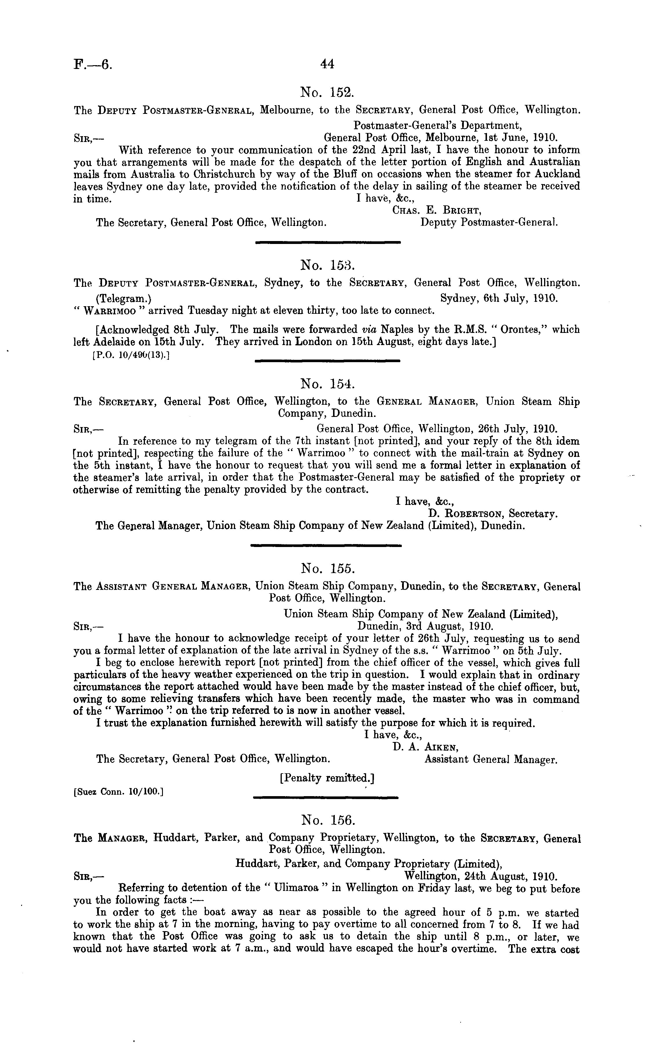 No. 154. The Secretary, General Post Office, Wellington, to the General Manager, Union Steam Ship Company, Dunedin. Sir,— General Post Office, Wellington, 26th July, 1910. In reference to my telegram of the 7th instant [not printed], and your reply of the Bth idem [not printed], respecting the failure of the " Warrimoo " to connect with the mail-train at Sydney on the sth instant, I have the honour to request that you will send me a formal letter in explanation of the steamer's late arrival, in order that the Postmaster-General may be satisfied of the propriety or otherwise of remitting the penalty provided by the contract. I have, &c, D. Robertson, Secretary. The General Manager, Union Steam Ship Company of New Zealand (Limited), Dunedin.