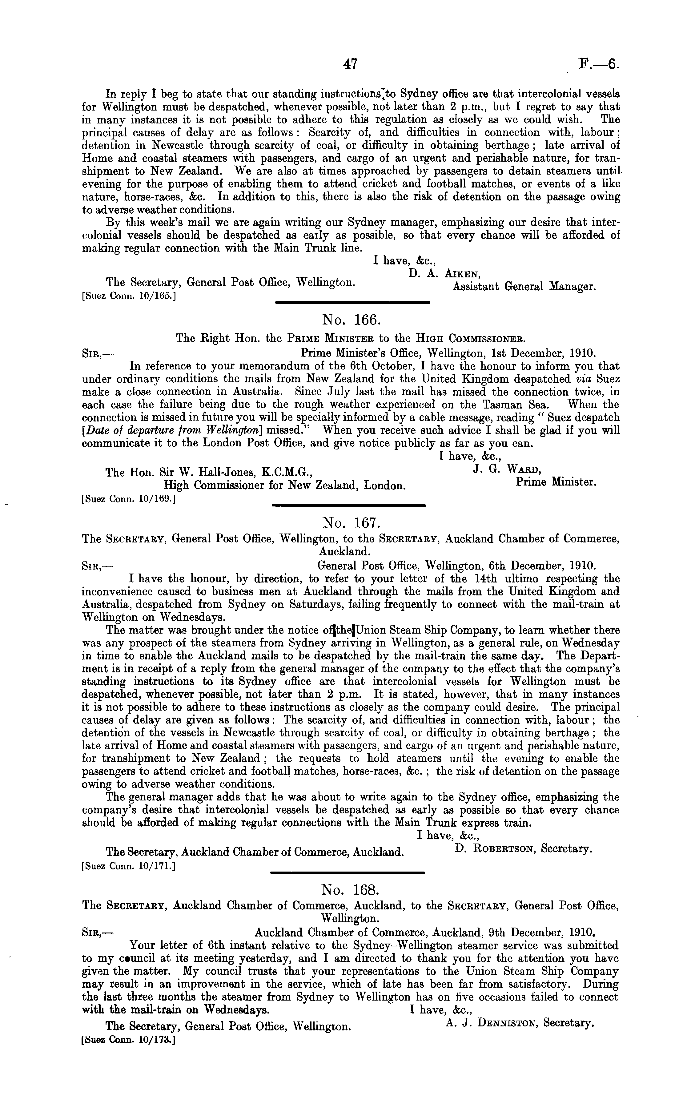 No. 167. The Secretary, General Post Office, Wellington, to the Secretary, Auckland Chamber of Commerce, Auckland. Sir,— General Post Office, Wellington, 6th December, 1910. I have the honour, by direction, to refer to your letter of the 14th ultimo respecting the inconvenience caused to business men at Auckland through the mails from the United Kingdom and Australia, despatched from Sydney on Saturdays, failing frequently to connect with the mail-train at Wellington on Wednesdays. The matter was brought under the notice ofJtheJUnion Steam Ship Company, to learn whether there was any prospect of the steamers from Sydney arriving in Wellington, as a general rule, on Wednesday in time to enable the Auckland mails to be despatched by the mail-train the same day. The Department is in receipt of a reply from the general manager of the company to the effect that the company's standing instructions to its Sydney office are that intercolonial vessels for Wellington must be despatched, whenever possible, not later than 2 p.m. It is stated, however, that in many instances it is not possible to adhere to these instructions as closely as the company could desire. The principal causes of delay are given as follows: The scarcity of, and difficulties in connection with, labour; the detention of the vessels in Newcastle through scarcity of coal, or difficulty in obtaining berthage; the late arrival of Home and coastal steamers with passengers, and cargo of an urgent and perishable nature, for transhipment to New Zealand ; the requests to hold steamers until the evening to enable the passengers to attend cricket and football matches, horse-races, &c. ; the risk of detention on the passage owing to adverse weather conditions. The general manager adds that he was about to write again to the Sydney office, emphasizing the company's desire that intercolonial vessels be despatched as early as possible so that every chance should be afforded of making regular connections with the Main Trunk express train. I have, &c, The Secretary, Auckland Chamber of Commerce, Auckland. D - Robertson, Secretary. [Suez Conn. 10/171.] _^^^^^_^_^______
