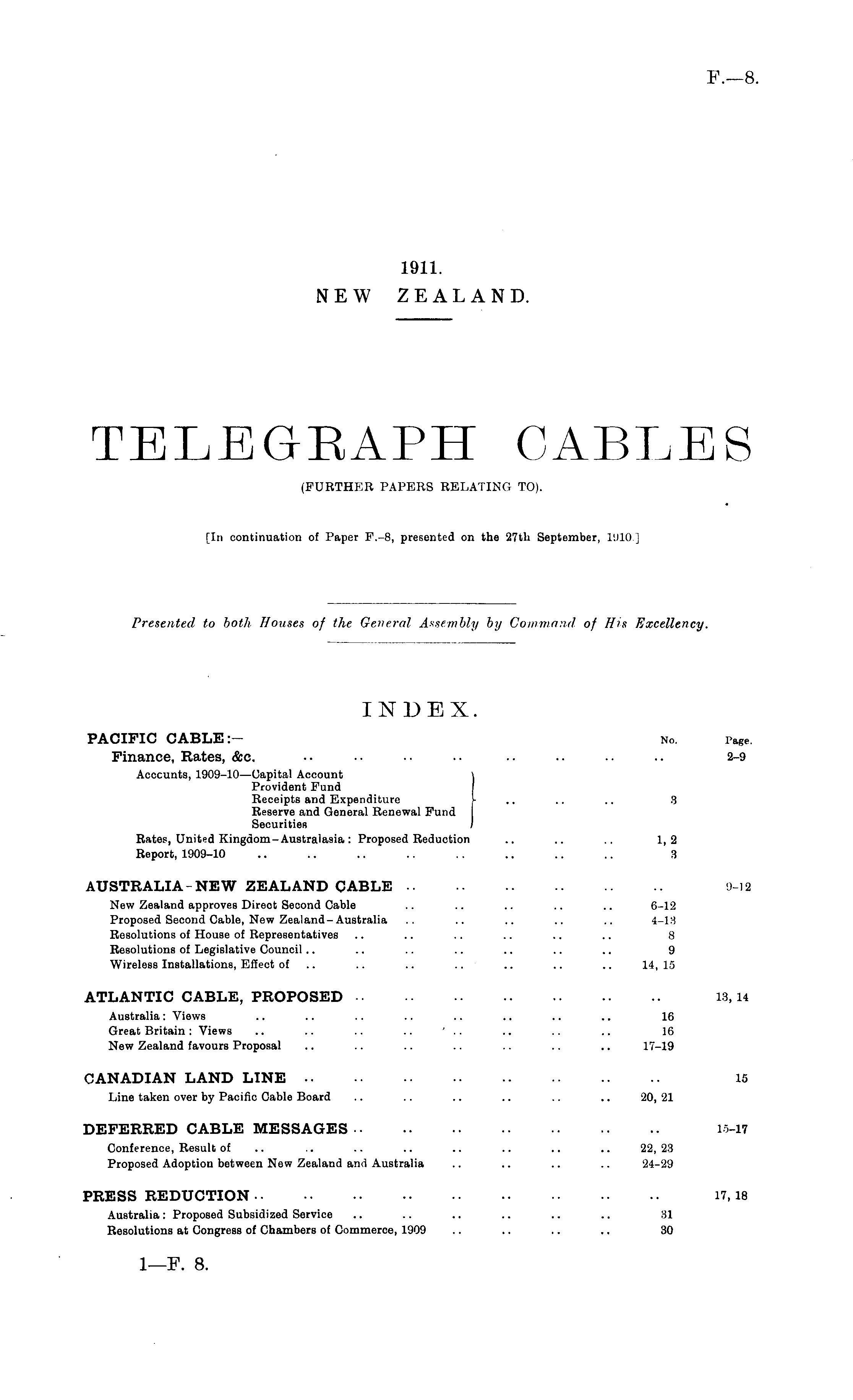 TELEGRAPH CABLES (FURTHER PAPERS RELATING TO). [In continuation of Paper F.-8, presented on the 27th September, 1910.]
