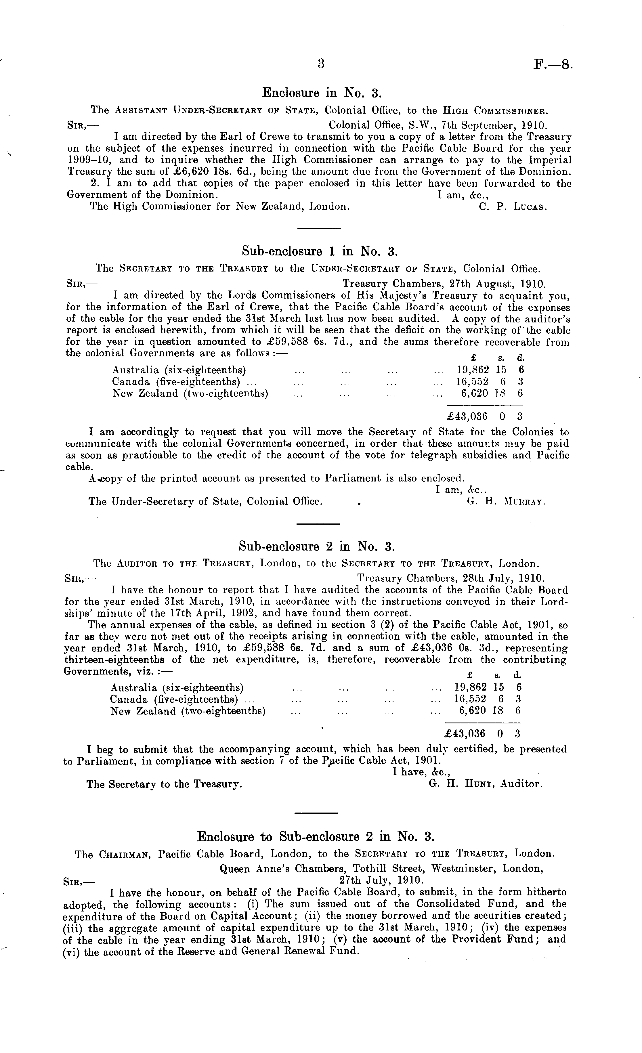Enclosure to Sub-enclosure 2 in No. 3. The Chairman, Pacific Cable Board, London, to the Secretary to the Treasury, London. Queen Anne's Chambers, Tothill Street, Westminster, London, Sir,— 27th July, 1910. I have the honour, on behalf of the Pacific Cable Board, to submit, in the form hitherto adopted, the following accounts : (i) The sum issued out of the Consolidated Fund, and the expenditure of the Board on Capital Account; (ii) the money borrowed and the securities created; (iii) the aggregate amount of capital expenditure up to the 31st March, 1910; (iv) the expenses of the cable in the year ending 31st March, 1910; (v) the account of the Provident Fund; and (vi) the account of the Reserve and General Renewal Fund.