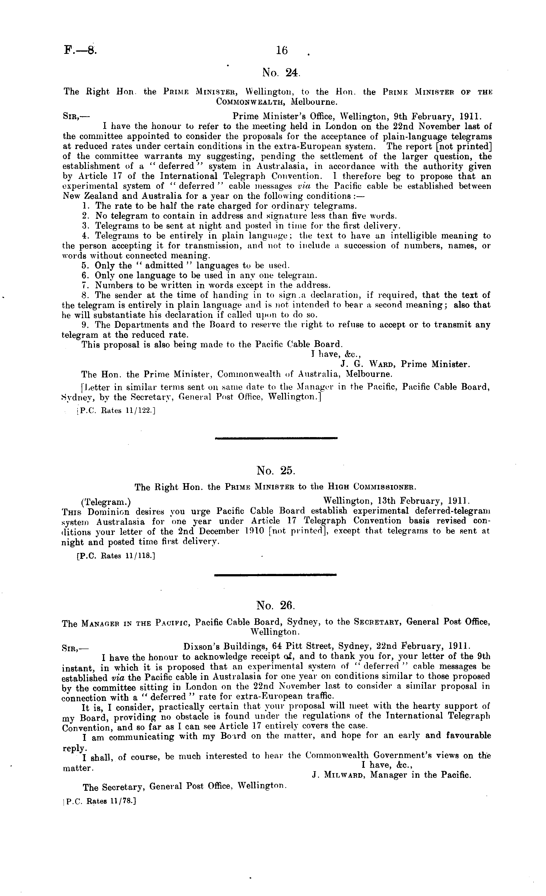 No. 24 The Right Hon. the Prime Minister, Wellington, to the Hon. the Prime Minister of the Commonwealth, Melbourne. Sir, — Prime Minister's Office, Wellington, 9th February, 1911. 1 have the honour to refer to the meeting held in London on the 22nd November last of the committee appointed to consider the proposals for the acceptance of plain-language telegrams at reduced rates under certain conditions in the extra-European system. The report [not printed] of the committee warrants my suggesting, pending the settlement of the larger question, the establishment of a " deferred " system in Australasia, in accordance with the authority given by Article 17 of the International Telegraph Convention. I therefore beg to propose that an experimental system of "deferred" cable messages via the Pacific cable be established between New Zealand and Australia for a year on the following conditions :— 1. The rate to be half the rate charged for ordinary telegrams. 2. No telegram to contain in address and signature less than five words. 3. Telegrams to be sent at night and posted in time for the first delivery. i. Telegrams to be entirely in plain language; the text to have an intelligible meaning to the person accepting it for transmission, and not to include a succession of numbers, names, or words without connected meaning. 5. Only the " admitted " languages to be used. 6. Only one language to be used in any one telegram. 7. Numbers to be written in words except in the address. 8. The sender at the time of handing in to sign a declaration, if required, that the text of the telegram is entirely in plain language and is not intended to bear a second meaning; also that he will substantiate his declaration if called upon to do so. 9. The Departments and the Board to reserve the righi to refuse to accept or to transmit any telegram at the reduced rate. This proposal is also being made to the Pacific Cable Board. 1 have, &c, J. G. Ward, Prime Minister. The Hon. the Prime Minister, Commonwealth of Australia, Melbourne. [Letter in similar terms sent on same date to the Manager in the Pacific, Pacific Cable Board, Sydney, by the Secretary, General Post Office, Wellington.] P.C. Rates 11/122.]