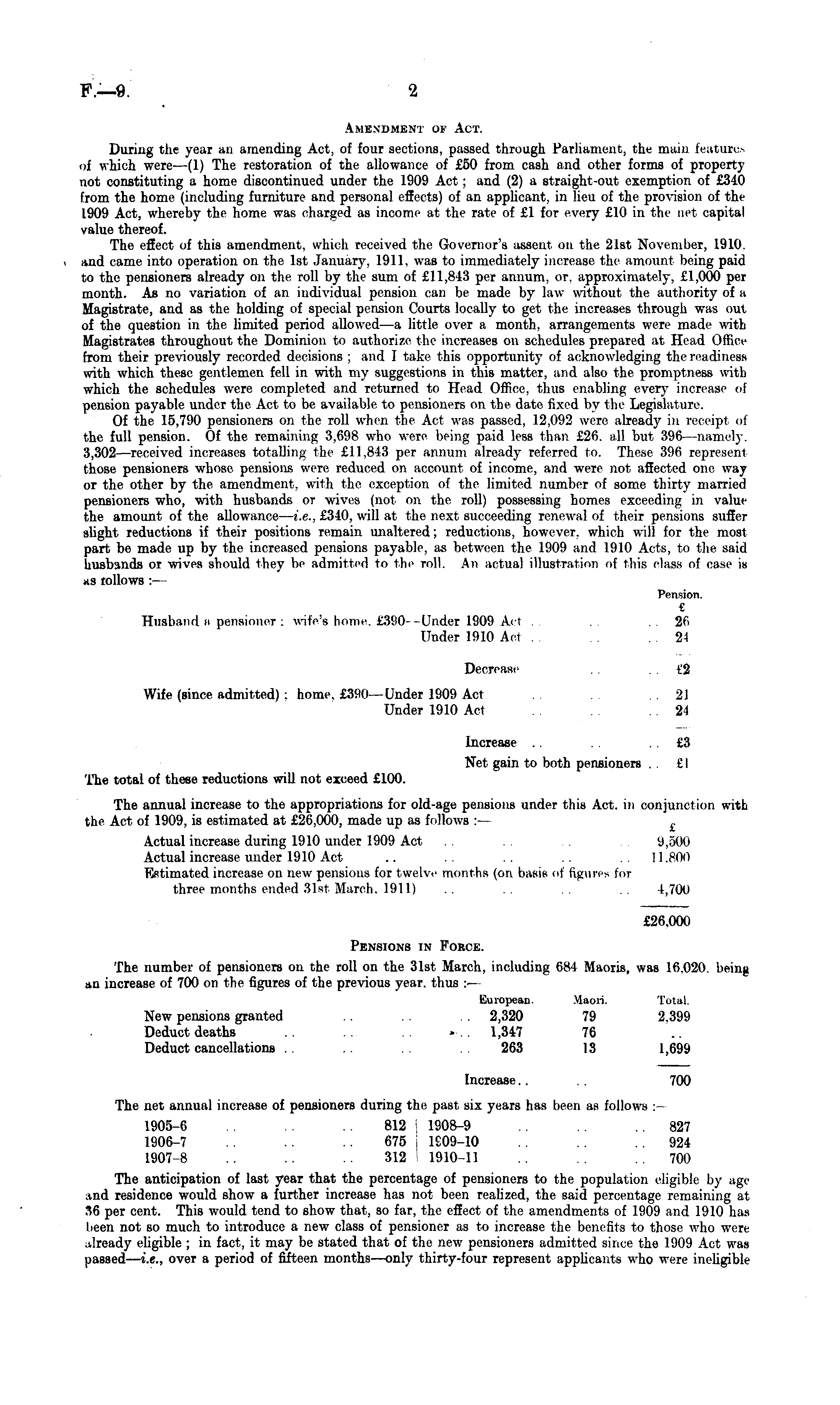 Amendment or Act. During the year an amending Act, of four sections, passed through Parliament, the main features of which were —(1) The restoration of the allowance of £50 from cash and other forms of property not constituting a home discontinued under the 1909 Act; and (2) a straight-out exemption of £340 from the home (including furniture and personal effects) of an applicant, in lieu of the provision of the 1909 Act, whereby the home was charged as income at the rate of £1 for every £10 in the net capital value thereof. The effect of this amendment, which received the Governor's assent on the 21st November, 1910. and came into operation on the Ist January, 1911, was to immediately increase the amount being paid to the pensioners already on the roll by the sum of £11,843 per annum, or. approximately, £1,000 per month. As no variation of an individual pension can be made by law without the authority of a Magistrate, and as the holding of special pension Courts locally to get the increases through was out of the question in the limited period allowed —a little over a month, arrangements were made with Magistrates throughout the Dominion to authorize the increases on schedules prepared at Head Office from their previously recorded decisions ; and I take this opportunity of acknowledging the readiness with which these gentlemen fell in with my suggestions in this matter, and also the promptness with which the schedules were completed and returned to Head Office, thus enabling every increase o! pension payable under the Act to be available to pensioners on the date fixed by the Legislature. Of the 15,790 pensioners on the roll when the Act was passed, 12,092 were already in receipt of the full pension. Of the remaining 3,698 who were being paid less than £26. all but 396 —namely. 3,302 —received increases totalling the £11,843 per annum already referred to. These 396 represent those pensioners whose pensions were reduced on account of income, and were not affected one way or the other by the amendment, with the exception of the limited number of some thirty married pensioners who, with husbands or wives (not on the roll) possessing homes exceeding in value the amount of the allowance — i.e., £340, will at the next succeeding renewal of their pensions suffer slight reductions if their positions remain unaltered; reductions, however, which will for the most part be made up by the increased pensions payable, as between the 1909 and 1910 Acts, to the said husbands or wives should they be admitted to the roll. An actual illustration of this class of case is as rollows :— Pension. Husband a pensioner ; wife's home. £390--Under 1909 Act . ..26 Under 1910 Acl .21 Decrease . . £2 Wife (since admitted) ; home. £390—Under 1909 Act .21 Under 1910 Act .24 Increase .. .. £3 Net gain to both pensioners . £ I The total of these reductions will not exceed £100. The annual increase to the appropriations for old-age pensions under this Act. in conjunction with the. Act of 1909, is estimated at £26,000, made up as follows : — „ Actual increase during 1910 under 1909 Act 9,500 Actual increase under 1910 Act .. .. .. .. 11.800 Estimated increase on new pensions for twelve months (on basis of figures foT three months ended 31st March, 1911) .. 4,700 £26.000 Pensions in Force. The number of pensioners on the roll on the 31st March, including 684 Maoris, was 16.020. being an increase of 700 on the figures of the previous year, thus : — European. .Maori. Total. New pensions granted 2,320 79 2,399 Deduct deaths - . 1,347 76 Deduct cancellations .. 263 13 1,699 Increase.. 700 The net annual increase of pensioners during the past six years has been as follows :— 1905-6 812 j 1908-9 .827 1906-7 675 i 1909-10 ..924 1907-8 .. .. 312 1910-11 .700 The anticipation of last year that the percentage of pensioners to the population eligible by age and residence would show a further increase has not been realized, the said percentage remaining at 36 per cent. This would tend to show that, so far, the effect of the amendments of 1909 and 1910 has been not so much to introduce a new class of pensioner as to increase the benefits to those who were already eligible ; in fact, it may be stated that of the new pensioners admitted since the 1909 Act was passed— i.e., over a period of fifteen months—only thirty-four represent applicants who were ineligible