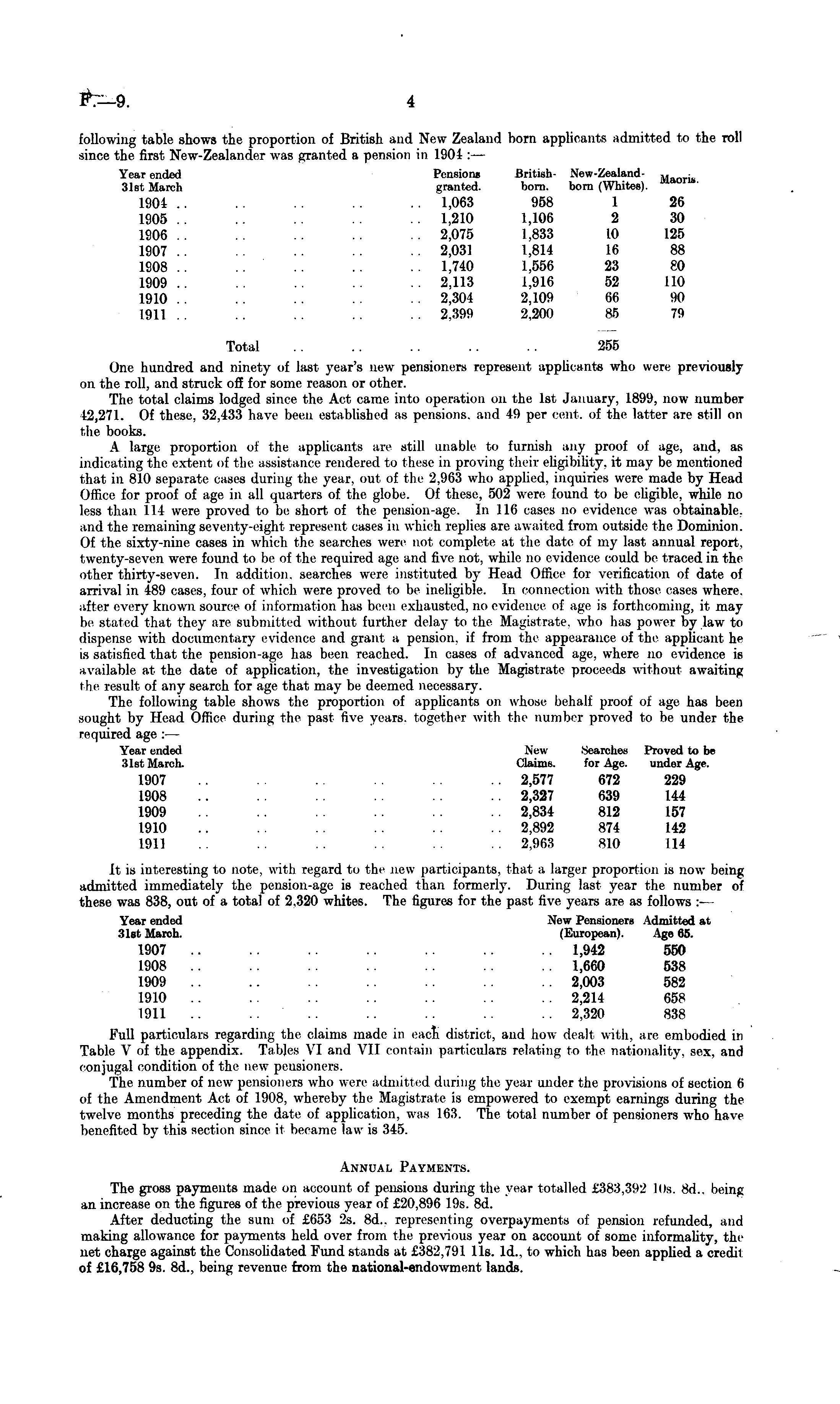 following table shows the proportion of British and New Zealand born applicants admitted to the roll since the first New-Zealander was granted a pension in 1904 : — Year ended Pension* British- New-Zealand- Mluvr j31st March granted. born. born (Whiten). Maulu, - 1904 .. .. .. .. .. 1,063 958 1 26 1905 .. .. .. .. .. 1,210 1,106 2 30 1906 .. .. .. .. .. 2,075 1,833 10 125 1907 .. .. .. .. .. 2,031 1,814 16 88 1908 .. .. .. .. .. 1,740 1,556 23 80 1909 .. .. .. .. .. 2,113 1,916 52 110 1910 .. .. .. .. .. 2,304 2,109 66 90 1911 .. .. .. .. .. 2,399 2,200 85 79 Total 255 One hundred and ninety of last year's new pensioners represent applicants who were previously on the roll, and struck oS for some reason or other. The total claims lodged since the Act came into operation on the 1st January, 1899, now uumber 12,271. Of these, 32,433 have been established as pensions, and 49 per cent, of the latter are still on the books. A large proportion of the applicants are still unable to furnish any proof of age, and, as indicating the extent of the assistance rendered to these in proving their eligibility, it may be mentioned that in 810 separate cases during the year, out of the 2,963 who applied, inquiries were made by Head Office for proof of age in all quarters of the globe. Of these, 502 were found to be eligible, while no less than 114 were proved to be short of the pension-age. In 116 cases no evidence was obtainable, and the remaining seventy-eight represent cases in which replies are awaited from outside the Dominion. Of the sixty-nine cases in which the searches vhtv not complete at the date of my last annual report, twenty-seven were found to be of the required age and five not, while no evidence could be traced in the other thirty-seven. In addition, searches were instituted by Head Office for verification of date of arrival in 489 cases, four of which were proved to be ineligible. In connection with those cases where. after every known source of information has been exhausted, no evidence of age is forthcoming, it may be. stated that they are submitted without further delay to the Magistrate, who has power by law to dispense with documentary evidence and grant a pension, if from the appearance of the applicant he is satisfied that the pension-age has been reached. In cases of advanced age, where no evidence is available at the date of application, the investigation by the Magistrate proceeds without awaiting the result of any search for age that may be deemed necessary. The following table shows the proportion of applicants on whose behalf proof of age has been sought by Head Office during the past five years, together with the number proved to be under the required age : — Year ended New Searches Proved to be 31st March. Claims. for Age. under Age. 1907 .. .. .. . . .. .. 2,577 672 229 1908 .. . . . . . . .. .. 2,327 639 144 1909 .. .. .. 2,834 812 157 1910 .. .. 2,892 874 142 1911 .. .. .. . . . . . . 2,963 810 114 It is interesting to note, with regard to the new participants, that a larger proportion is now being admitted immediately the pension-age is reached than formerly. During last year the number of these was 838, out of a total of 2.320 whites. The figures for the past five years are as follows :—- Year ended New Pensioners Admitted at 31et March. (European). Age 65. 1907 1,942 550 1908 .. .. .. .. .. .. .. 1,660 538 1909 .. .. .. .. .. .. .. 2,003 582 1910 .. .. .. .. .. .. .. 2,214 658 1911 .. .. .. .. ... .. .. 2,320 838 Full particulars regarding the claims made in each district, and how dealt will), are embodied in Table V of the appendix. Tables VI and VII contain particulars relating to the nationality, sex, and conjugal condition of the new pensioners. The number of new pensioners who were admitted during the year under the provisions of section 6 of the Amendment Act of 1908, whereby the Magistrate is empowered to exempt earnings during the twelve months preceding the date of application, was 163. The total number of pensioners who have benefited by this section since it became law is 345. Annual Payments. The gross payments made on account of pensions during the year totalled £383,392 IDs. 8d.. being an increase on the figures of the previous year of £20,896 19s. 8d. After deducting the sum of £653 2s. 8d.. representing overpayments of pension refunded, and making allowance for payments held over from the previous year on account of some informality, the net charge against the Consolidated Fund stands at £382,791 11s. Id., to which has been applied a credh of £16,758 9s. 8d., being revenue from the national-endowment lands.