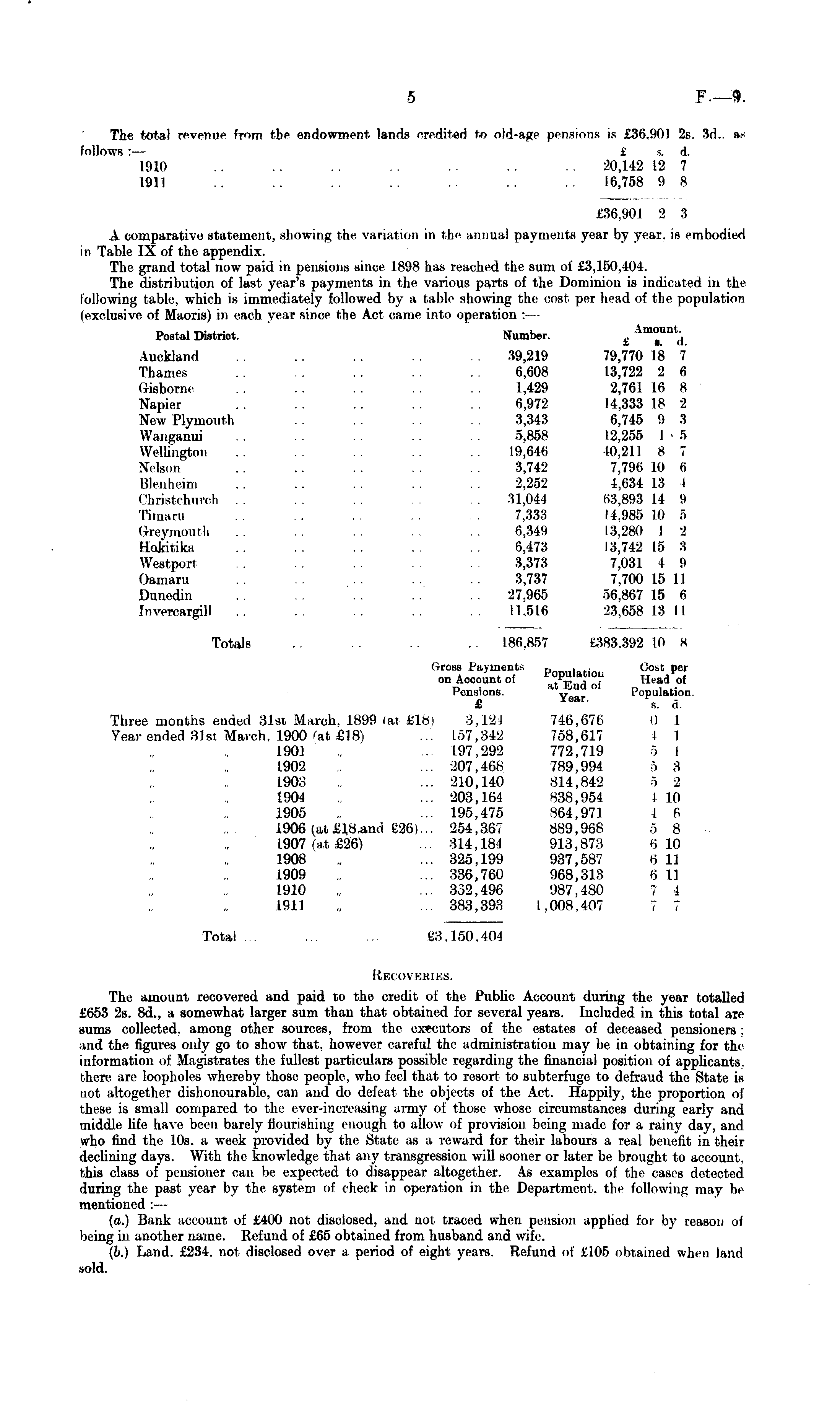 The total revenue from the endowment lands credited to old-age pensions is £36.901 2k. 3d.. »* follows : — £ s. d. 1910 20,142 12 7 1911 .. .. .. .. .. .. .. 16,758 9 8 £36,901 2 3 A comparative statement, .showing the variation in the annual payments year by year, is embodied in Table IX of the appendix. The grand total now paid in pensions since 1898 has reached the sum of £3,150,404. The distribution of last year's payments in the various parts of the Dominion is indicated in the following table, which is immediately followed by a table showing the cost per head of the population (exclusive of Maoris) in each year since the Act came into operation : — Postal District. Number. £ Am ° unt^ Auckland .. .. .. . . .. 39,219 79,770 18 7 Thames .. .. .. .. .. 6,608 13,722 2 6 Gisborn, .. 1,429 2,761 16 8 Napier .. .. .. .. . . 6,972 14,333 18 2 New Plymouth .. .. .. .. 3,343 6,745 9 3 Wanganui .. . . .. . . .. 5,858 12,255 I • 5 Wellington .. .. .. .. .. 19,646 40,21 J 8 7 Nelson .. .. .. .. .. 3,742 7,796 10 6 Blenheim .. .. .. .. .. 2,252 4,634 13 1 Cliristrhurch .. .. .. .. .. 31,044 f>3.893 14 9 Timarn .. .. . . . . . . 7,333 14,985 10 5 Greymoiith .. .. .. .. .. 6,349 13,280 J 2 Hokitikii .. .. .. .. .. 6,473 13,742 15 8 Westport .. .. .. .. .. 3,373 7,031 4 9 Oamaru .. .. .. .. .. 3,737 7,700 15 11 Dunedin . . .. .. .. .. 27,965 56,867 15 6 Invcrcargill .. .. .. .. .. 11,516 23,658 13 11 Totals .. .. . .. 186,857 £383.392 10 H Gross Payments D . . Cost per on Account of Po *" 1 *?™ Head of Pensions. *V™ o[ Population. £ * ear s. a. Three months ended 31st March, 1899 (at £18) 3,124 746,676 0 1 Year ended 31st March, 1900 fat £18) ... L57,34y 758,617 I I 1901 „ ... 197,292 772,719 5 1 1902 „ ... 207,468 789,994 5 8 1903 „ ... 210,140 814,842 5 2 1904 „ ... 203,164 838,954 i 10 1905 ,. ... 195,475 864,971 1 6 1906 (at £18,and E26|... 254,367 889,968 5 8 1907 iat 626) ... 314,184 913,873 6 10 1908 „ ... 325,199 937,587 6 11 1909 „ ... 336,760 968,313 6 I] 1910 „ ... 332,496 987,480 7 4 1911 „ ... 383,393 1,008,407 7 7 Total ... ... ... W. 150,404 Recoveries. The amount recovered and paid to the credit of the Public Account during the year totalled £653 2s. 8d., a somewhat larger sum than that obtained for several years. Included in this total are sums collected, among other sources, from the executors of the estates of deceased pensioners : and the figures only go to show that, however careful the administration may be in obtaining for the information of Magistrates the fullest particulars possible regarding the financial position of applicants, there are loopholes whereby those people, who feel that to resort to subterfuge to defraud the State is not altogether dishonourable, can aud do defeat the objects of the Act. Happily, the proportion o) these is small compared to the ever-increasing army of those whose circumstances during early and middle life have been barely flourishing enough to allow of provision being made for a rainy day, and who find the 10s. a week provided by the State as a reward for their labours a real benefit in their declining days. Witli the knowledge that any transgression will sooner or later be brought to account, this class of pensioner can be expected to disappear altogether. As examples of the cases detected during the past year by the system of check in operation in the Department, the following may be mentioned : — (a.) Bank account of £400 not disclosed, and not traced when pension applied for by reason of being in another name. Refund of £65 obtained from husband and wife. (i.) Land. £234. not disclosed over a period of eight years. Refund of £105 obtained when land sold.