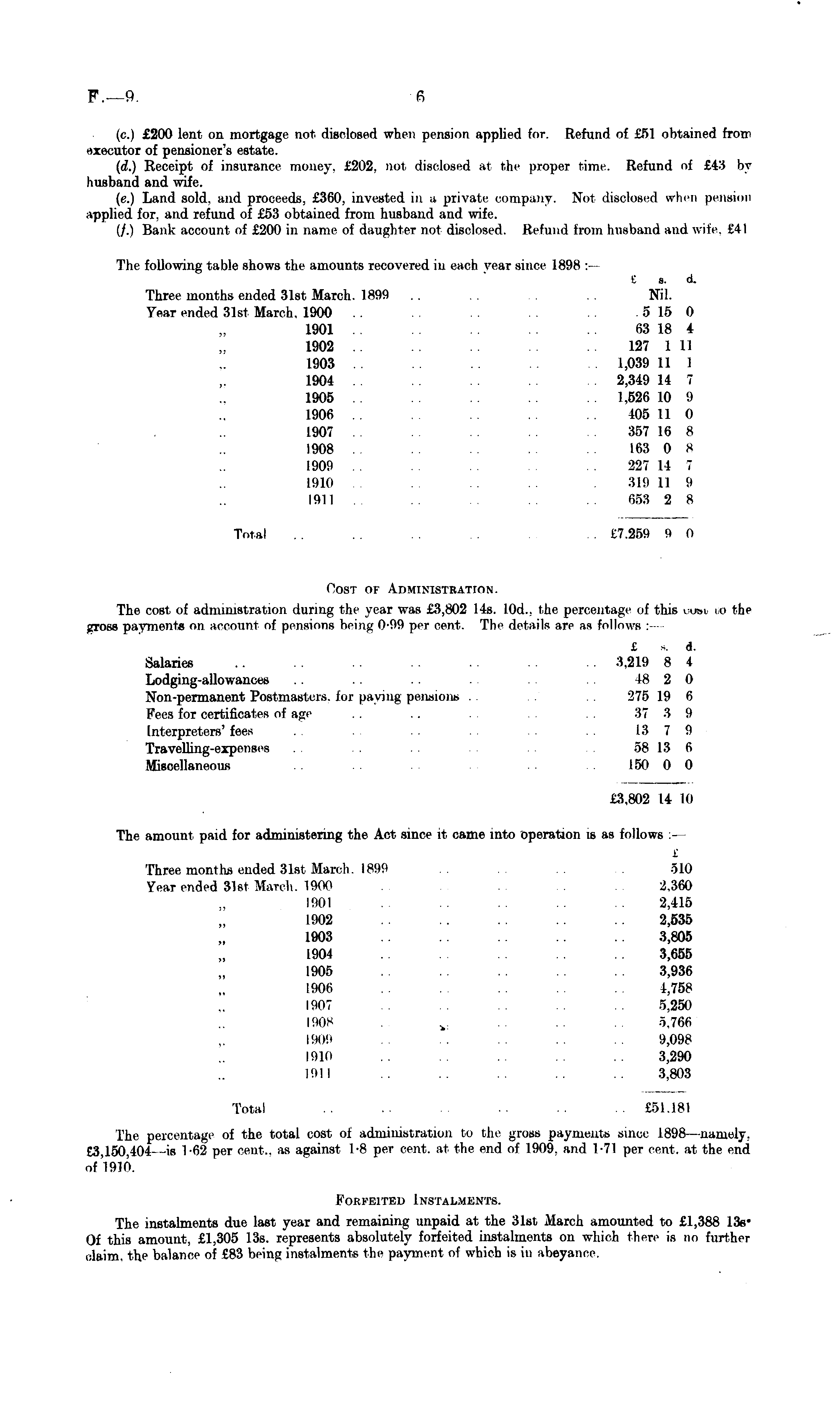 (c.) £200 lent on mortgage not disclosed when pension applied for. Refund of £51 obtained from nxecutor of pensioner's estate. (d.) Receipt of insurance money. £202. not disclosed at the proper time. Refund of £43 by husband and wife. (c.) Land sold, and proceeds, £360, invested in a private company. Not disclosed when pension applied for. and refund of £53 obtained from husband and wife. (/.) Bank account of £200 in name of daughter not disclosed. Refund from husband and wife. £41 The following table shows the amounts recovered in each year since iB9K ; C s. d. Three months ended 31st March. 1899 .. Nil. Year ended 31st March, 1900 5 15 0 1901 . . 63 18 4 1902 .. 127 1 11 1903 .. 1,039 11 1 1904 . . . 2,349 14 7 1905 .. 1,526 10 9 1906 .. 405 11 0 1907 357 16 8 1908 .. 163 0 s 1909 . . 227 14 7 1910 319 11 '.i 1911 653 2 8 Total . . . . £7.259 9 0 Cost of Administration. The cost of administration during the year was £3,802 14s. 10d., the percentage of this uuttt no the gross payments on account of pensions heiny 0-99 per cent. The details are as follows : £ s. d. Salaries .. .. 3,219 8 4 Lodging-allowances .. I*2o Non-permanent Postmasters, for paying pensions . 275 19 6 Fees for certificates of acre .. .. 37 3 9 Interpreters' fees 13 7 9 Travelling-expenses 58 13 6 Miscellaneous 15000 £3,802 14 10 The amount paid for administering the Act since it oame into operation is as follows :— £ Three months ended 31st March. 1899 510 Year ended 31st March. 1900 2,360 1901 2,415 19(12 .. .. 2,535 1903 3,805 1904 3,655 1905 3,936 1906 4,758 1907 5,250 1908 . .. 5.766 1909 9,098 1910 3,290 1911 3,803 Total .. .. .. £51,181 The percentage of the total cost of administration to the gross payments since 1898—namely. £3,150,404--is 1-62 per cent., as against 1-8 per cent, at the end of 1909. and 1-71 per cent, at the end oM9]O. Forfeited Instalments. The instalments due last year and remaining unpaid at the 31st March amounted to £1,388 136' Of this amount, £1,305 13s. represents absolutely forfeited instalments on which there is no further claim, the balance of £83 being instalments the payment of which is in abeyance.